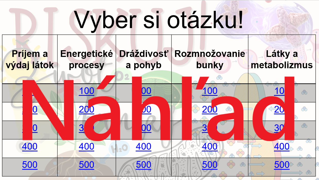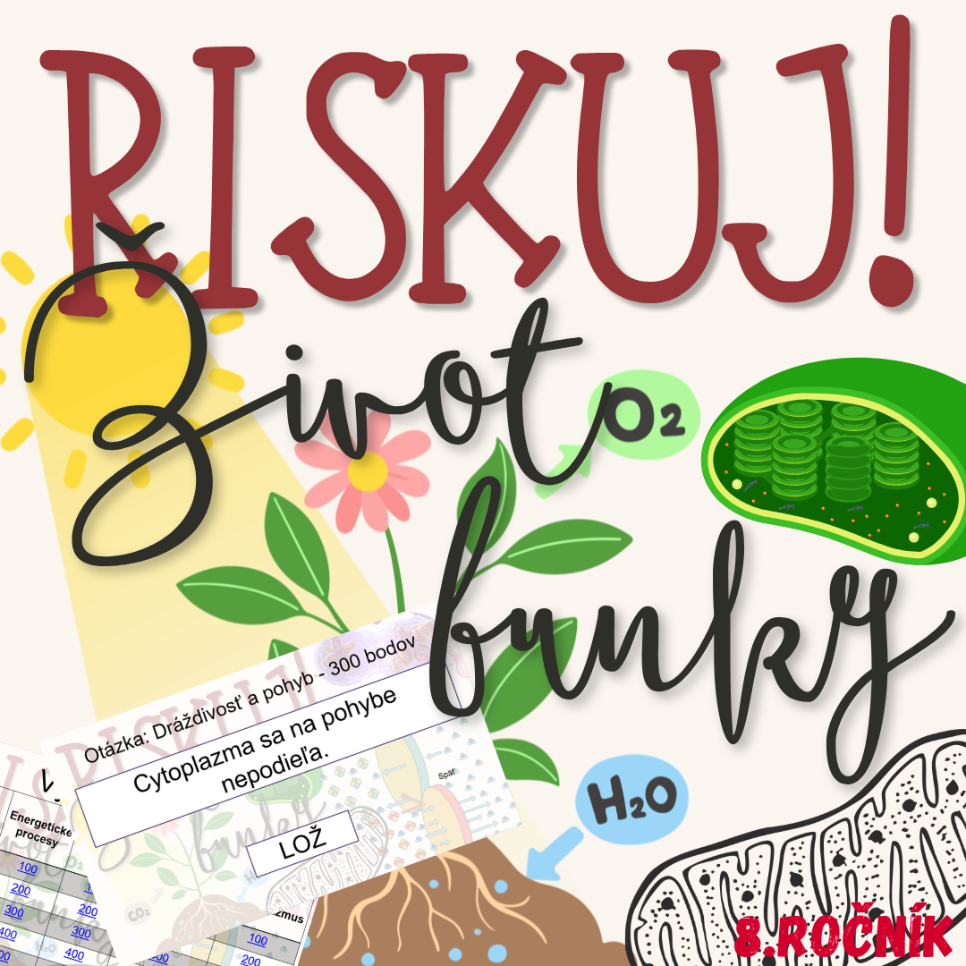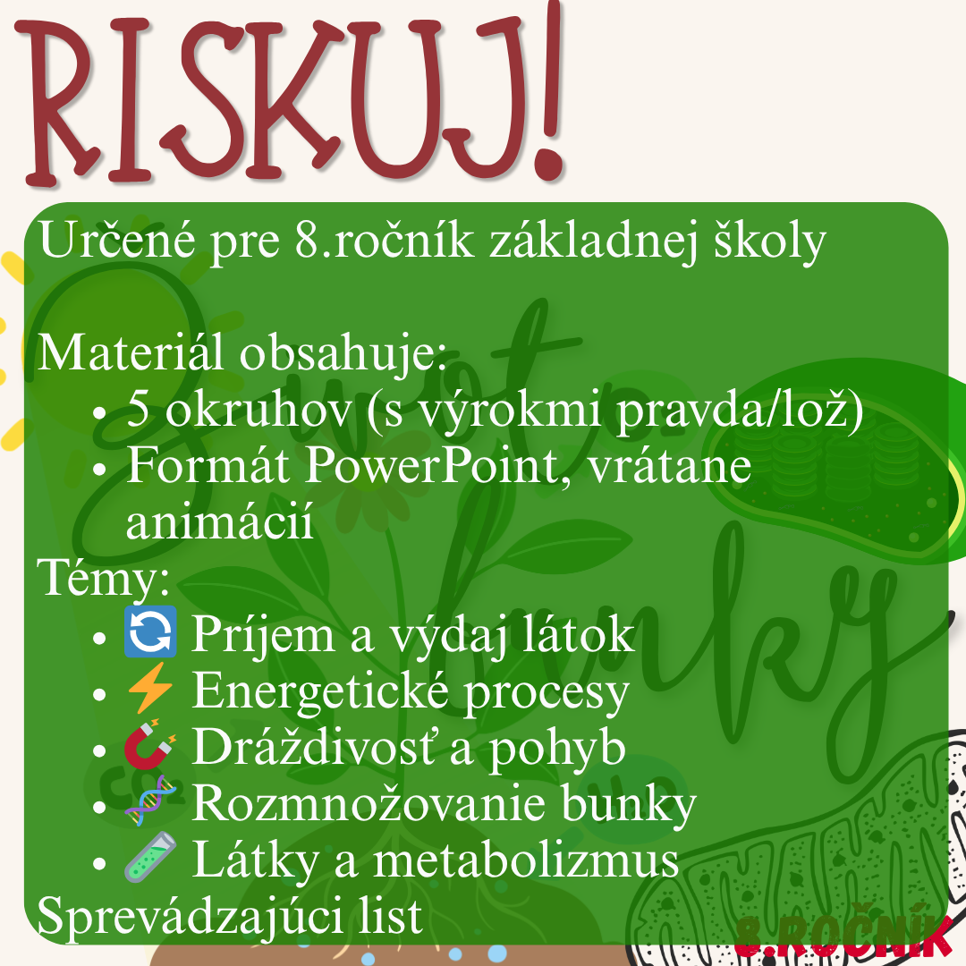 Materiál „RISKUJ! – Život bunky“ je interaktívna a súťažná edukačná hra určená pre žiakov 8. ročníka základnej školy. Zameriava sa na základné prejavy života bunky a metabolické procesy.