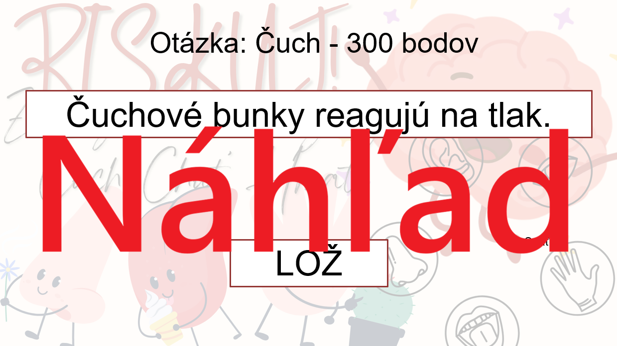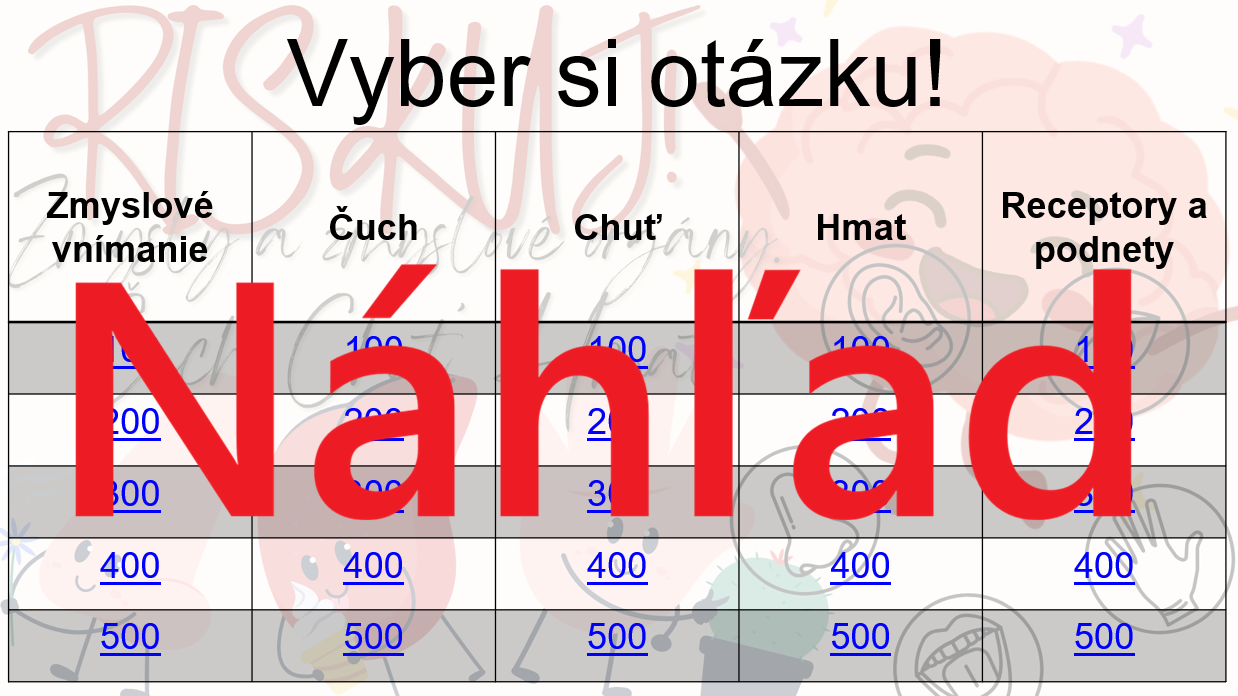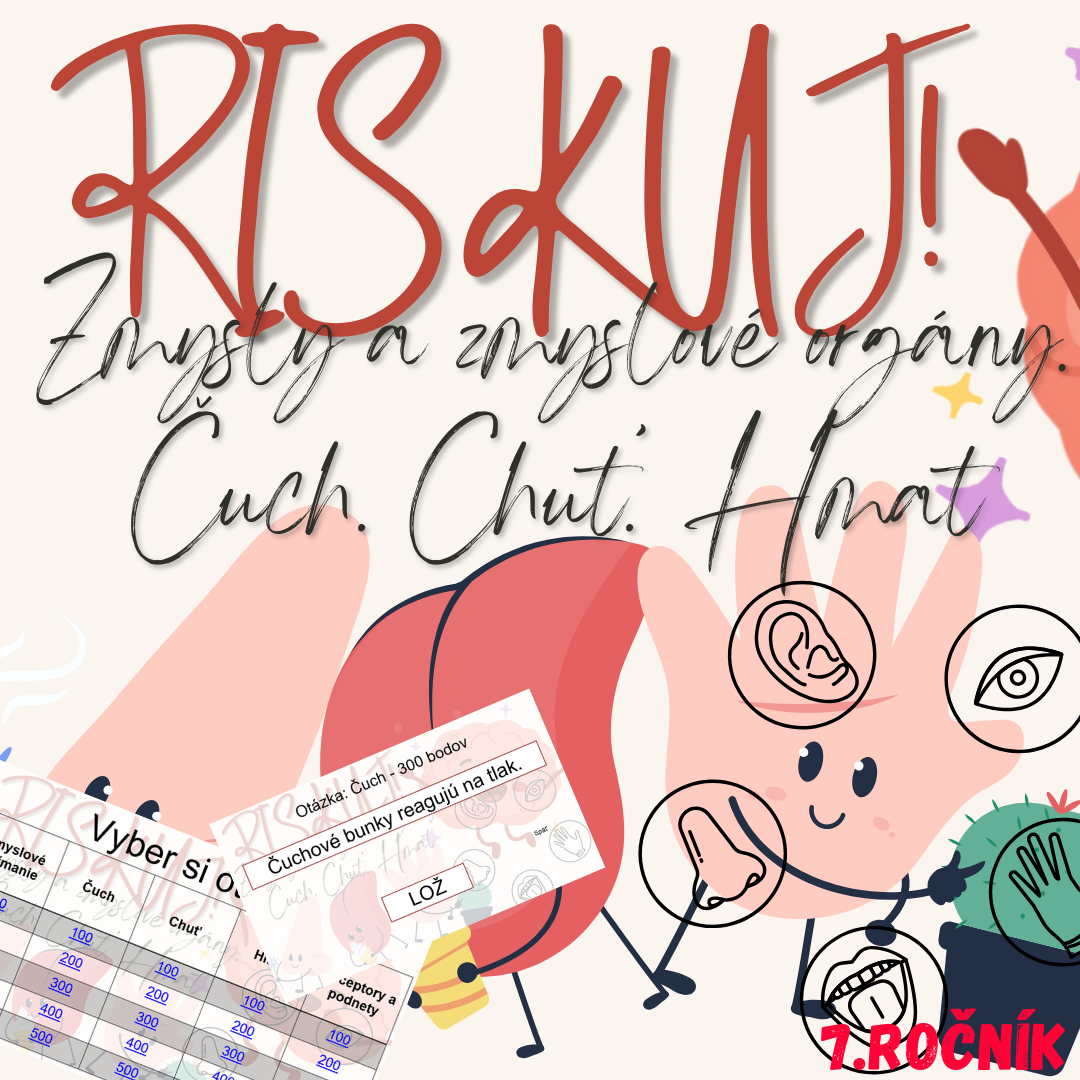 Materiál „RISKUJ! – Zmysly a zmyslové orgány. Čuch. Chuť. Hmat“ je interaktívna a súťažná edukačná hra určená pre žiakov 7. ročníka základnej školy. Zameriava sa na zmyslové vnímanie a fungovanie vybraných zmyslových orgánov.