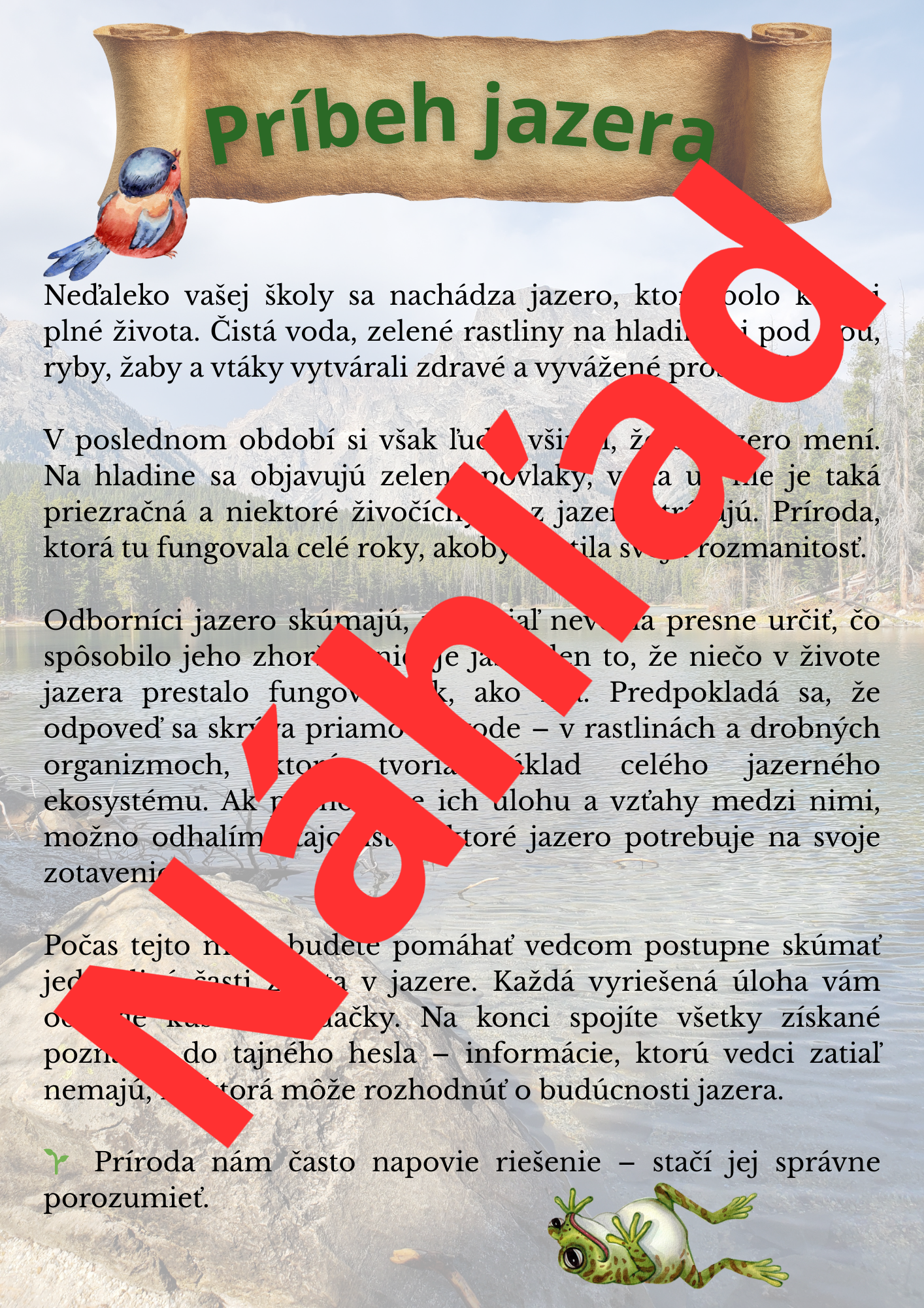 Žiaci sa stanú súčasťou misie, v ktorej skúmajú jazerný ekosystém a krok za krokom odhaľujú, prečo jazero stratilo svoju rovnováhu. Každá úloha prináša nový kúsok skladačky a vedie k finálnemu odhaleniu kľúčového posolstva.