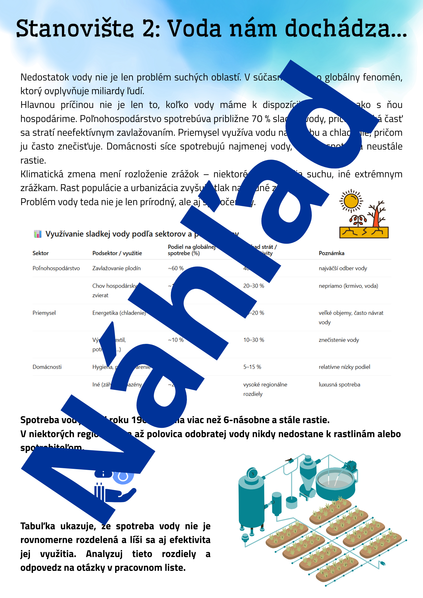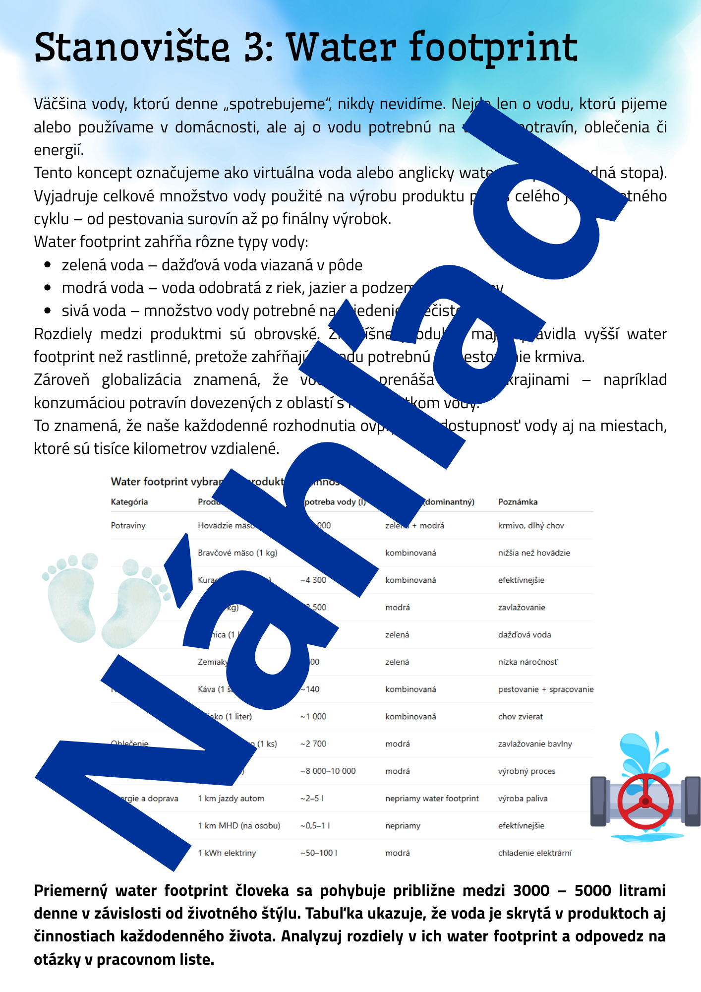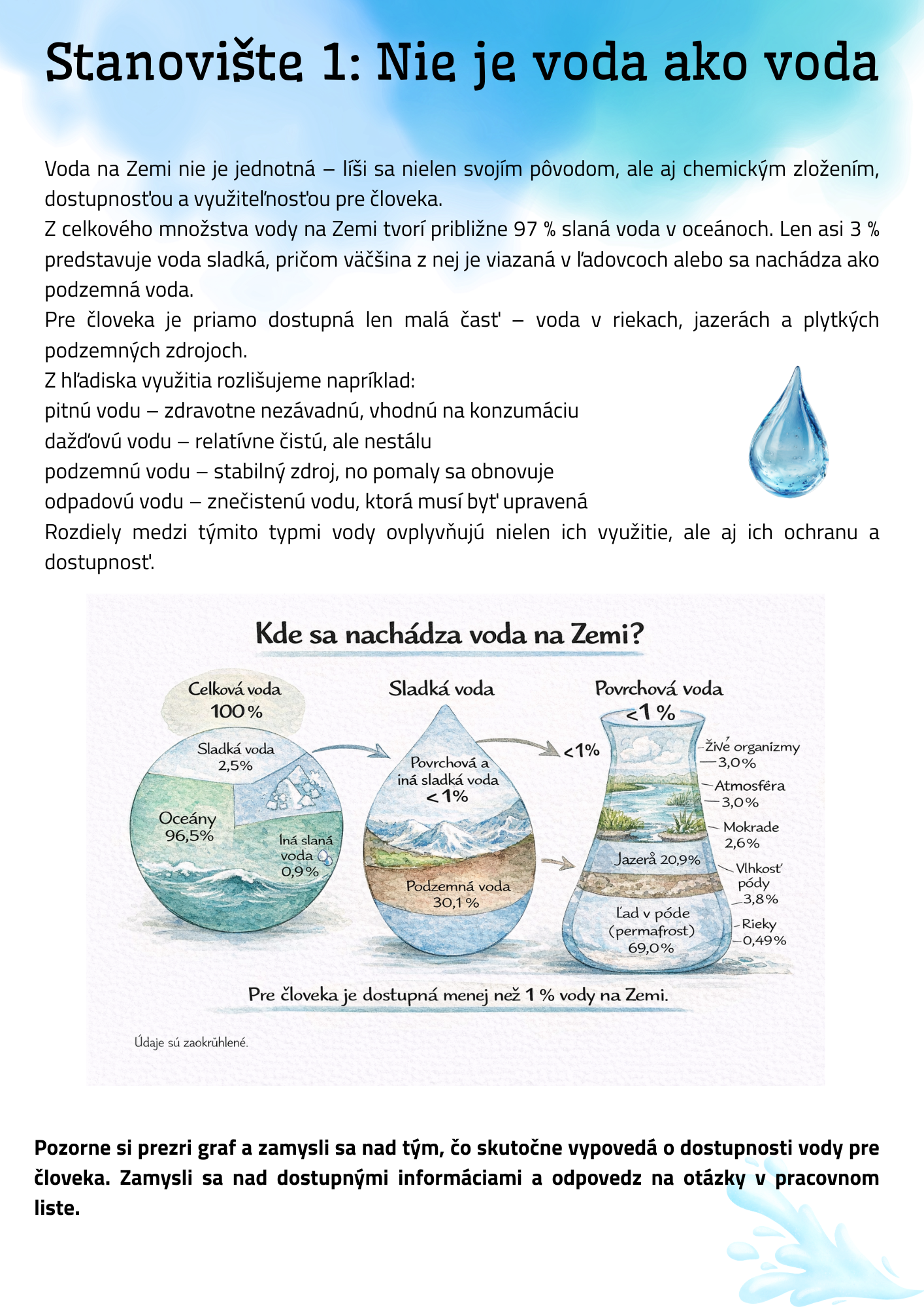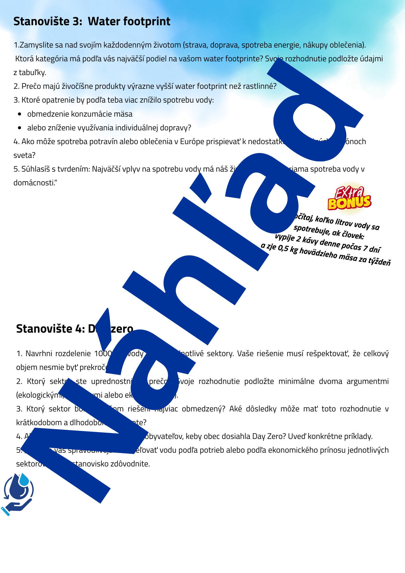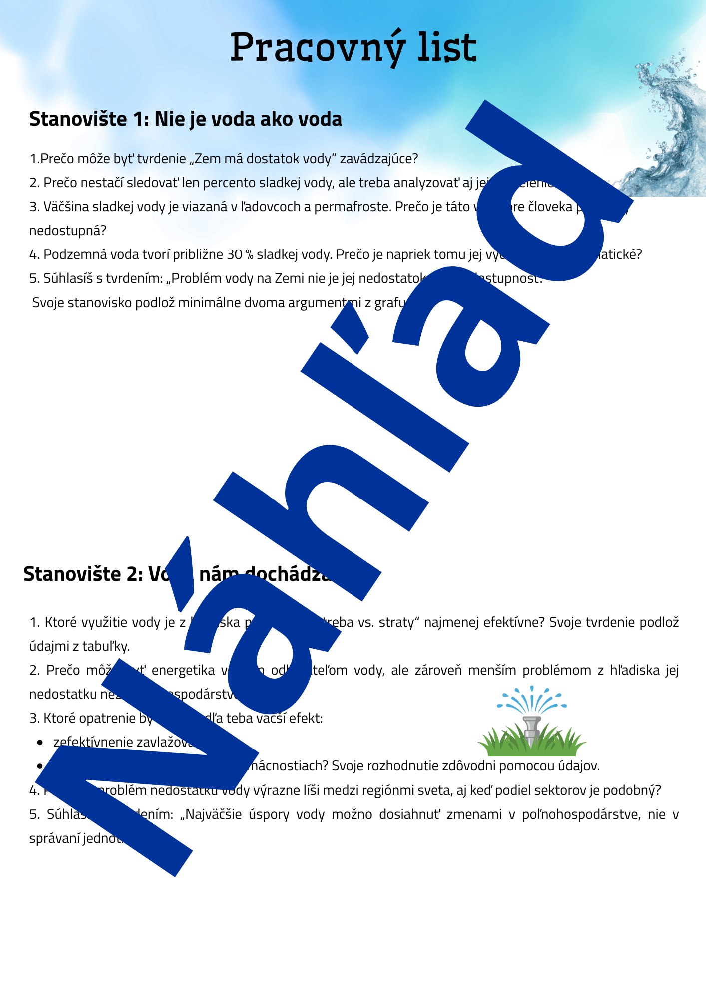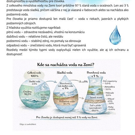 Hľadáte aktivitu, ktorá žiakov nielen zaujme, ale ich aj prinúti premýšľať? Tento materiál ponúka 4 prepracované stanoviská zamerané na tému vody – od jej dostupnosti, cez spotrebu až po etické rozhodovanie v krízových situáciách.
