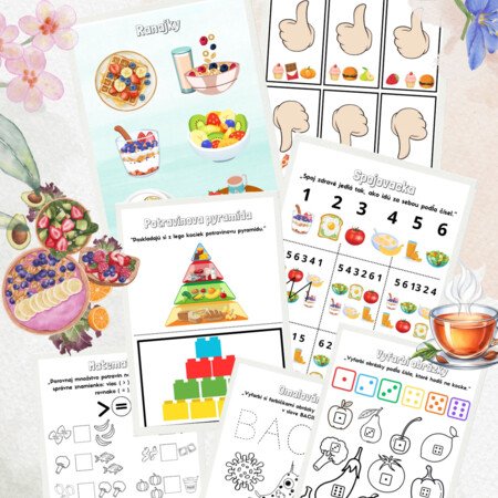 Tento vzdelávací PDF materiál s názvom Zdravie, strava a choroby prináša deťom predškolského veku zábavnou formou poznanie o zdravom životnom štýle. Na 32 stranách plných farebných úloh a obrázkov sa deti oboznámia so zdravými a nezdravými potravinami, naučia sa, čo je pre telo prospešné. Materiál obsahuje úvodné stránky s ilustráciami zdravej stravy, prehľadnú potravinovú pyramídu, ktorú si deti môžu samy vymaľovať, vystrihnúť a zostaviť, čím si hravou formou upevnia poznatky o výžive. Nechýbajú matematické úlohy na počítanie, porovnávanie „viac – menej“, triedenie či úlohy na štipcovanie a precvičovanie prstov, ktoré podporujú jemnú motoriku. Súčasťou materiálu sú aj detské sudoku, úlohy s geometrickými tvarmi, logické hádanky a pohybové hry so zameraním na zdravie. Tento materiál je ideálny pre deti v materskej škole, na domáce vzdelávanie alebo ako doplnok k tematickému týždňu Zdravie – strava – choroby. Obsahuje 32 strán aktivít a 2 strany s úvodom a poďakovaním.