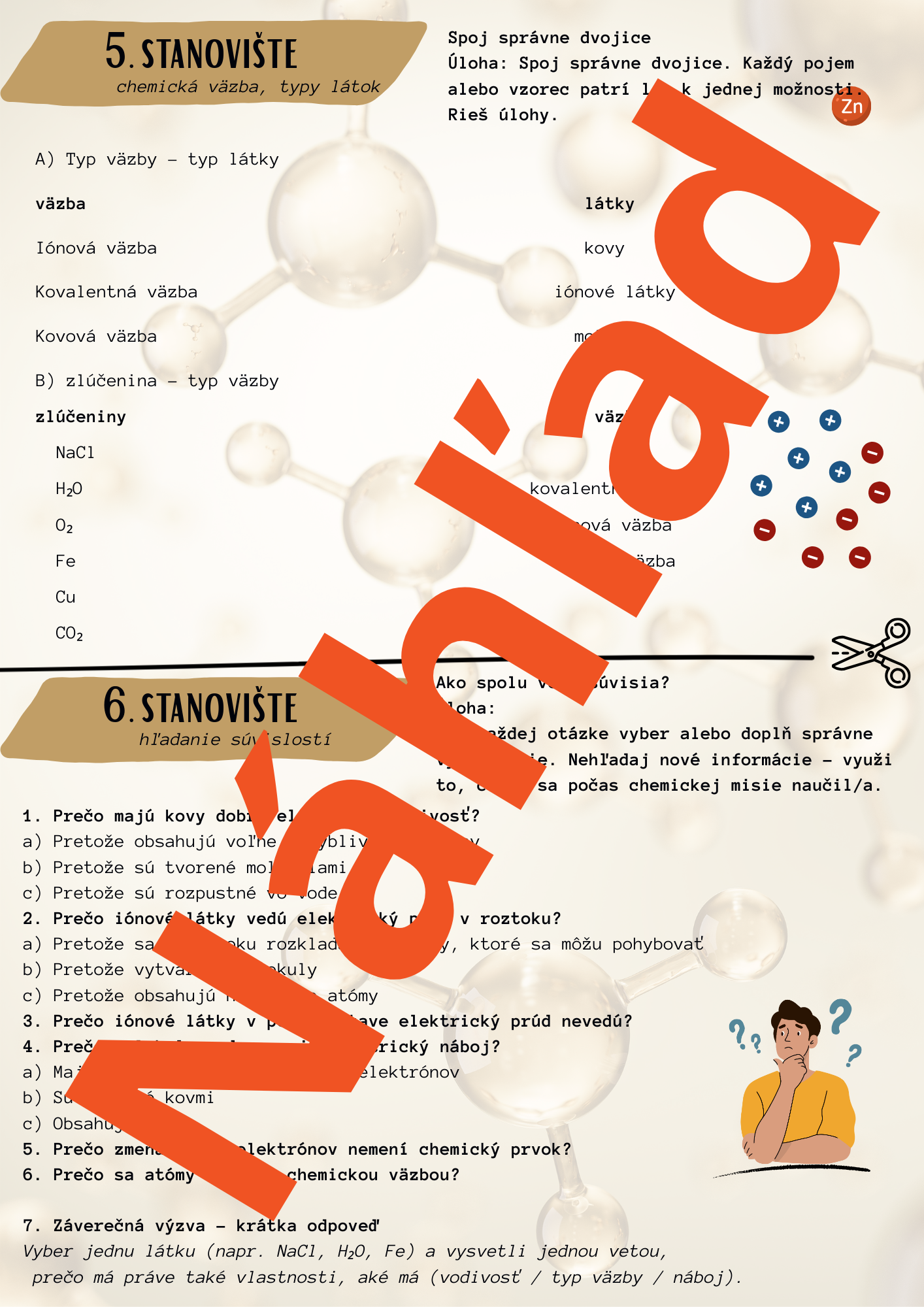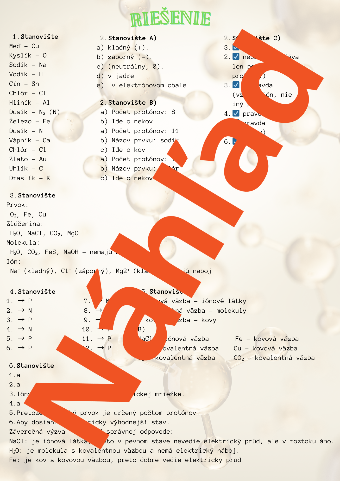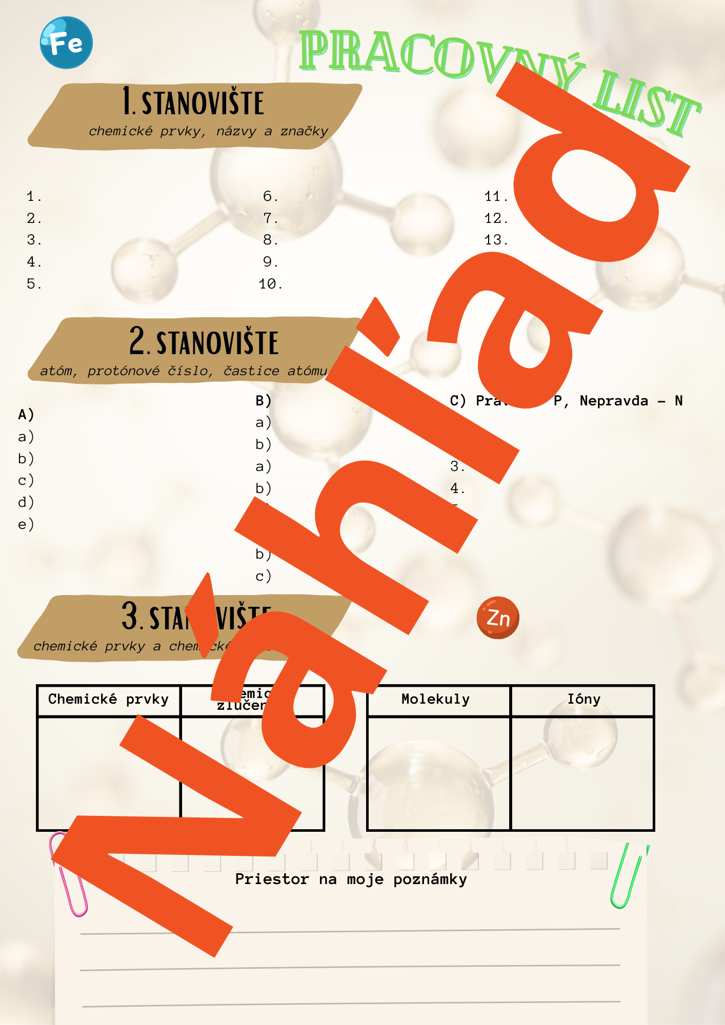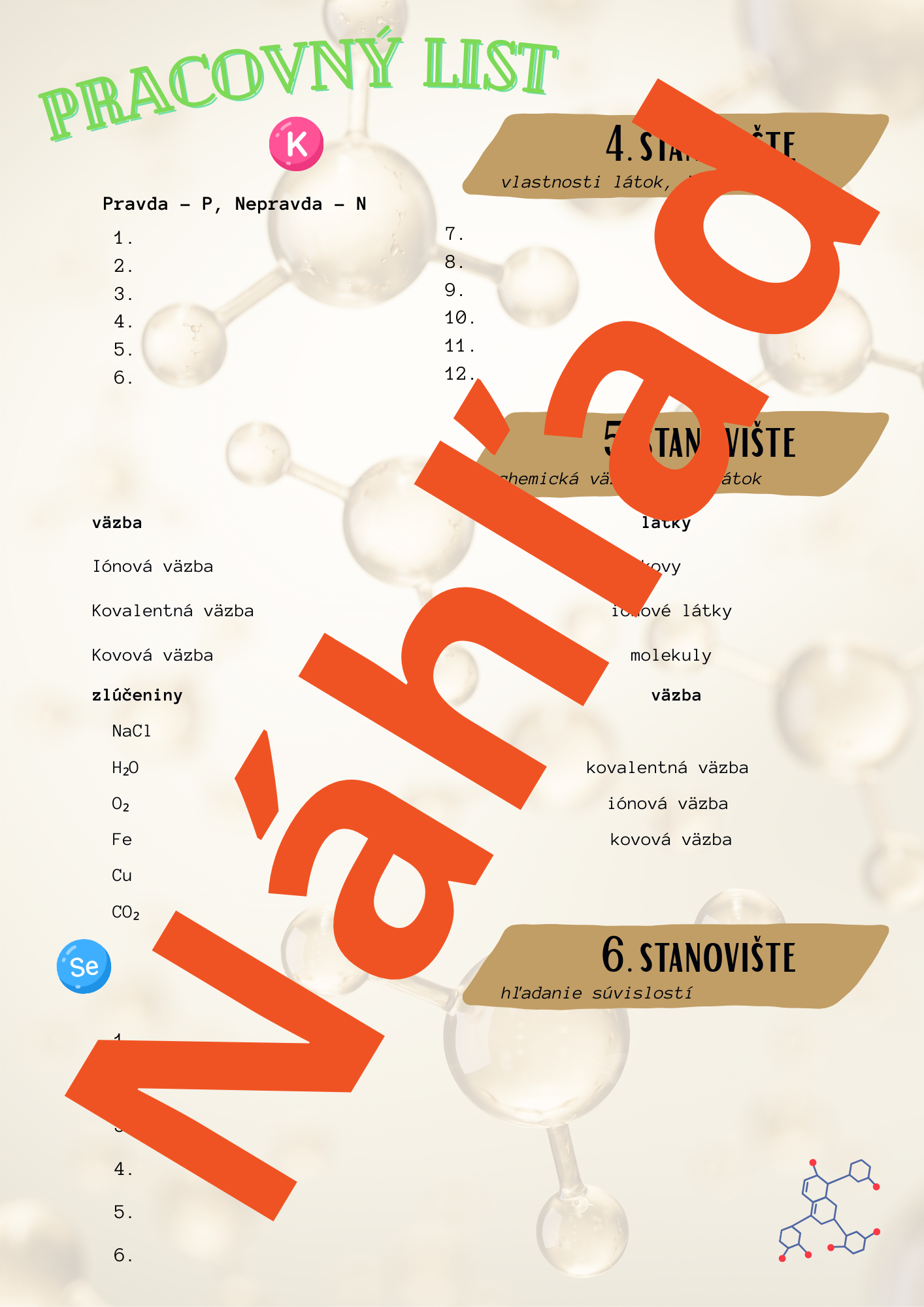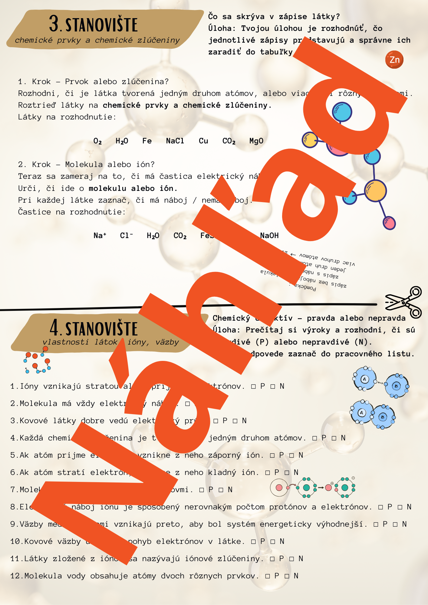 Tento materiál je určený na systematické a zároveň zážitkové opakovanie učiva chémie za prvý polrok formou práce na stanovištiach. Žiaci si upevňujú základné pojmy a vzťahy (chemické prvky, atóm, ióny, molekuly, zlúčeniny a chemické väzby) prostredníctvom krátkych, rôznorodých úloh, ktoré podporujú porozumenie namiesto mechanického memorovania.