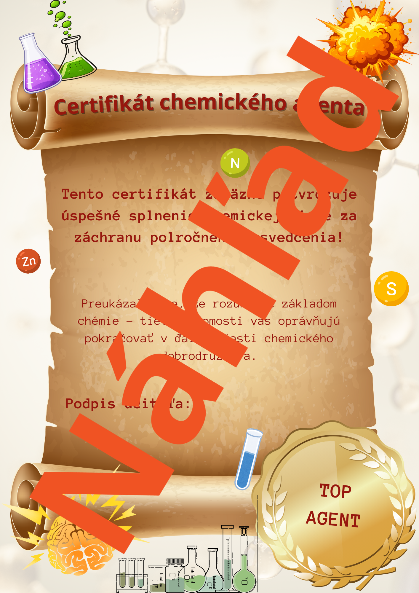 Súčasťou materiálu je aj riešenie pre učiteľa a certifikát o zvládnutí chémie, ktorý slúži ako motivačný a záverečný prvok celej „chemickej misie“.