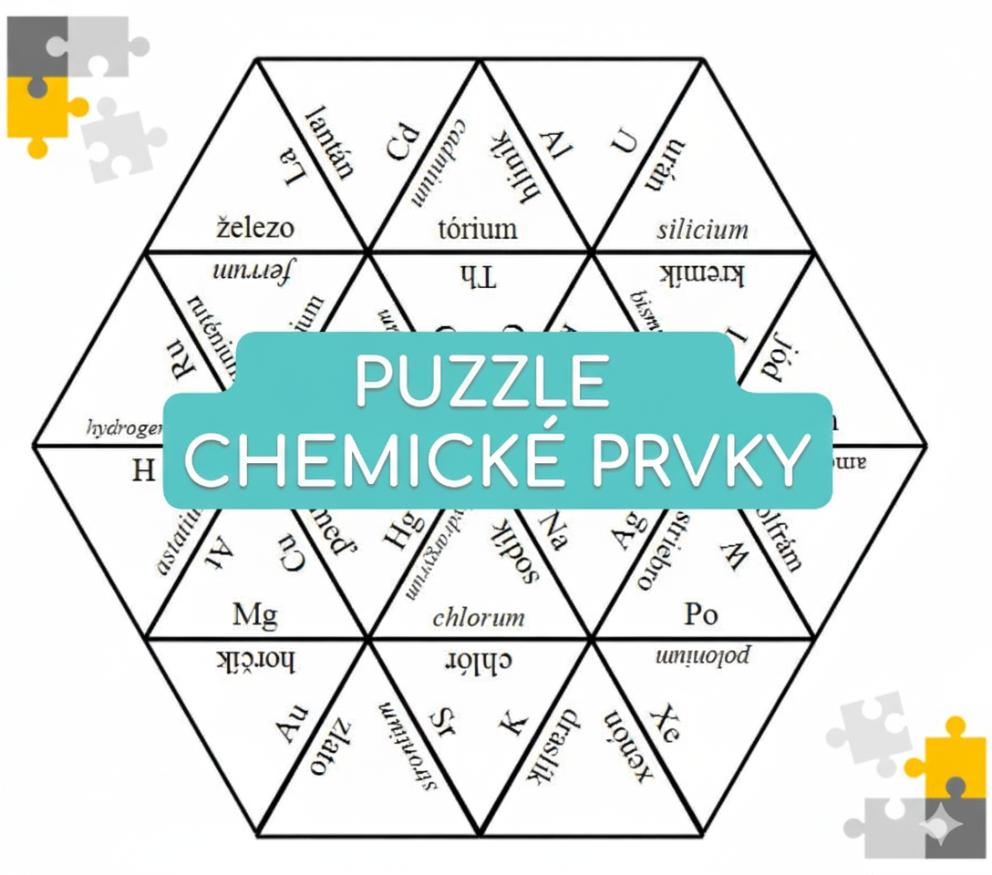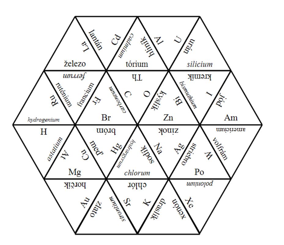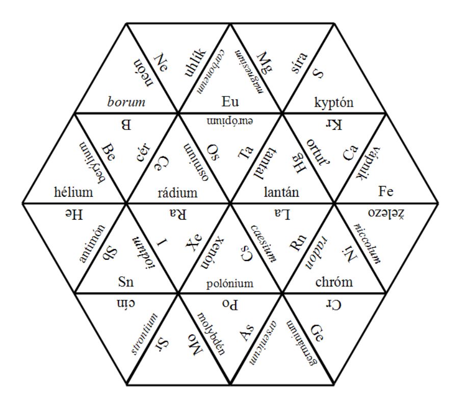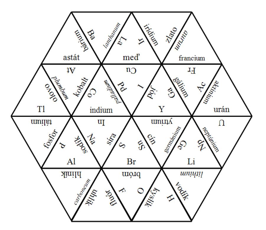 Materiál slúži na opakovanie a upevňovanie značiek a názvov chemických prvkov prostredníctvom aktivity puzzle. Žiaci spájajú trojuholníky podľa správnych dvojíc (názov prvku slovenský alebo latinský – chemická značka) do finálneho geometrického útvaru (šesťuholník). Materiál obsahuje 3 rôzne verzie.