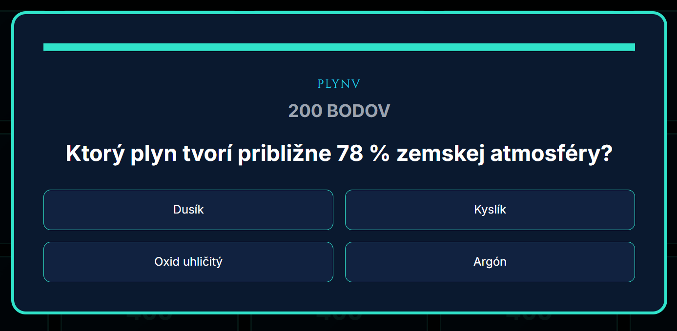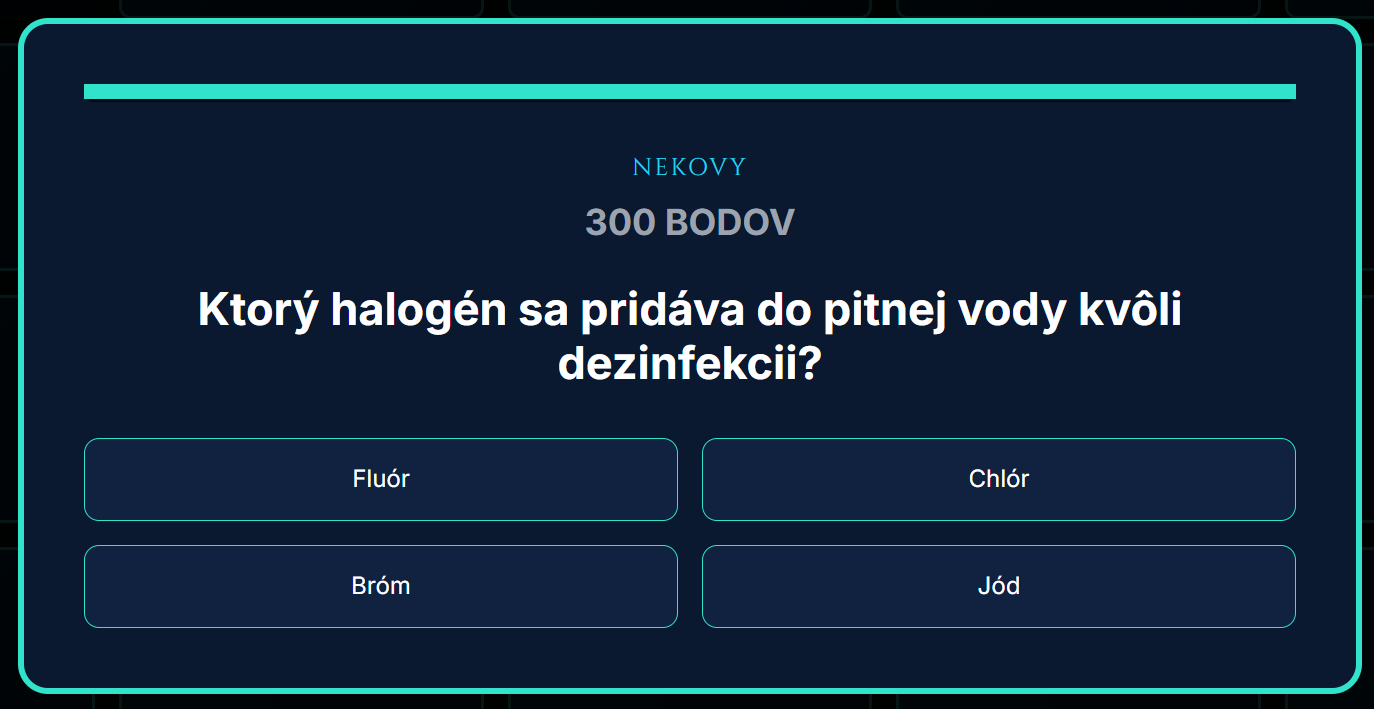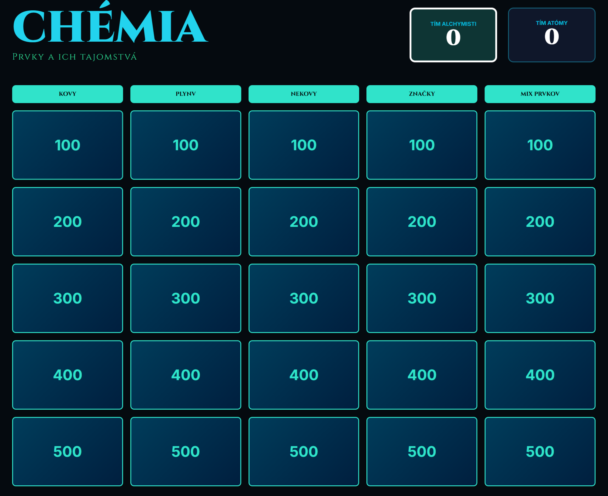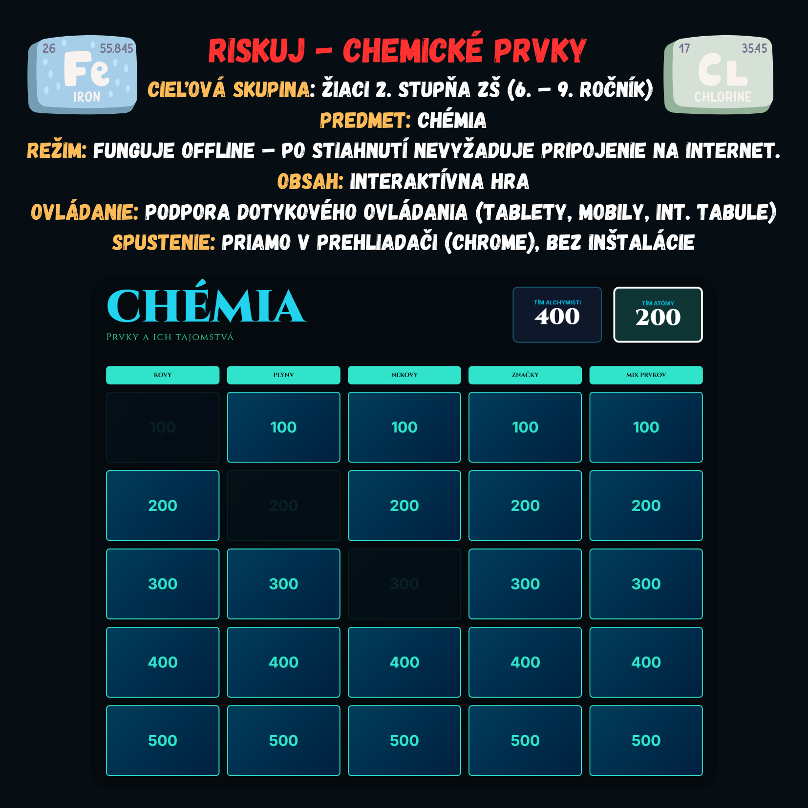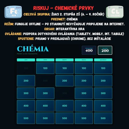 Premeňte hodinu chémie na napínavý súboj vedomostí! Táto digitálna hra prenáša obľúbený formát televíznej súťaže Riskuj! priamo do vašej triedy. Žiaci sa hravou formou ponoria do tajov periodickej sústavy, od tekutých kovov až po vzácne plyny vo vesmíre.