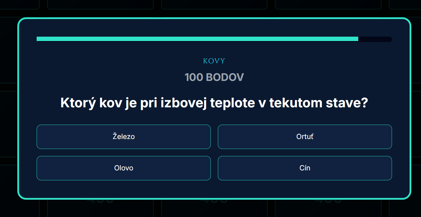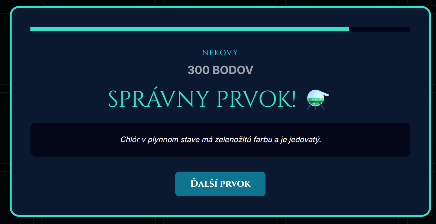 - 25 odborných otázok: Rozdelených do kategórií Kovy, Plyny, Nekovy, Značky a Mix prvkov.