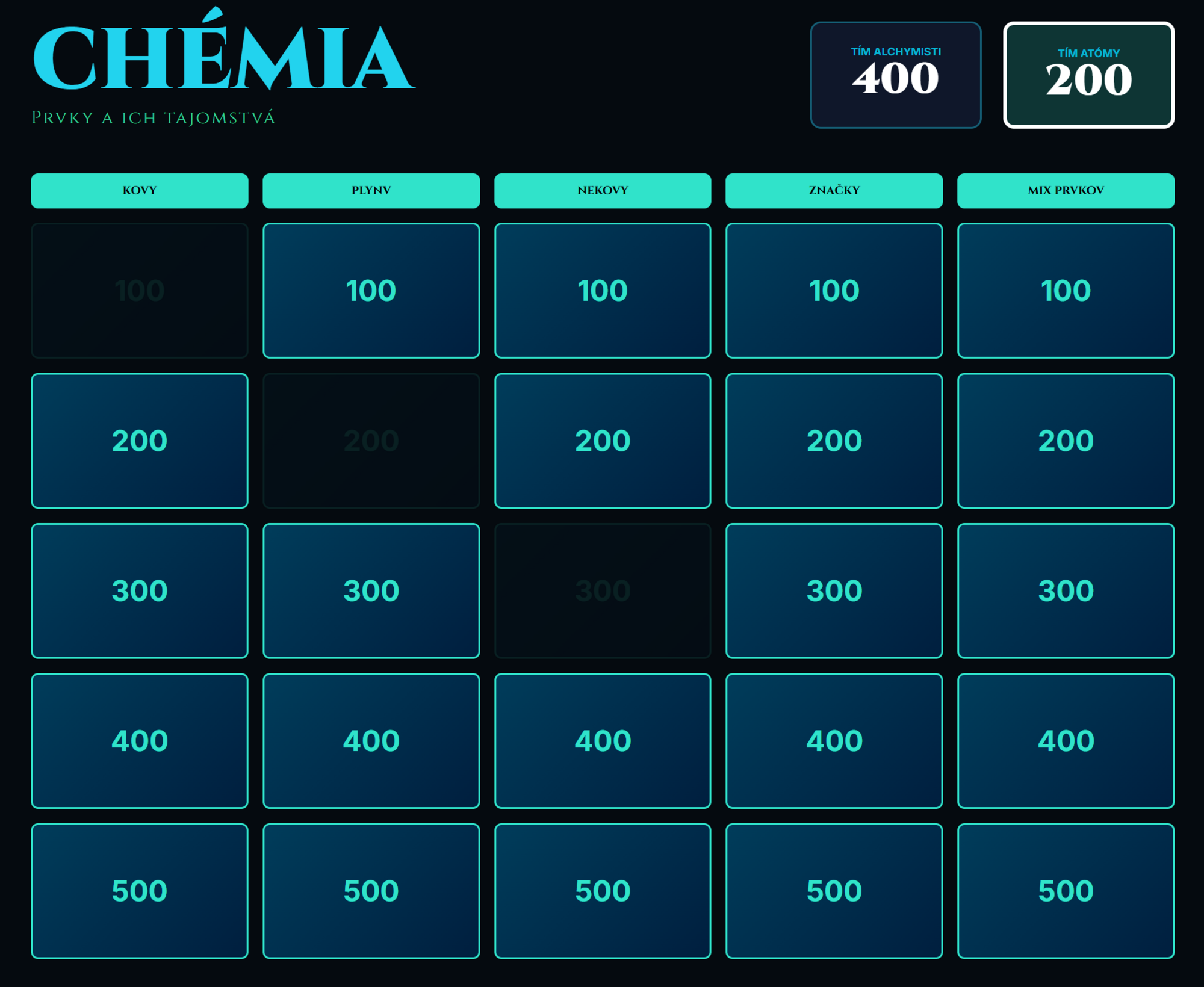 - Kompletná herná logika: Automatické striedanie dvoch tímov (Alchymisti vs. Atómy), pripočítavanie aj odpočítavanie bodov, časový limit 30 sekúnd na odpoveď a interaktívne zvukové efekty.