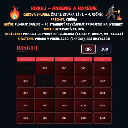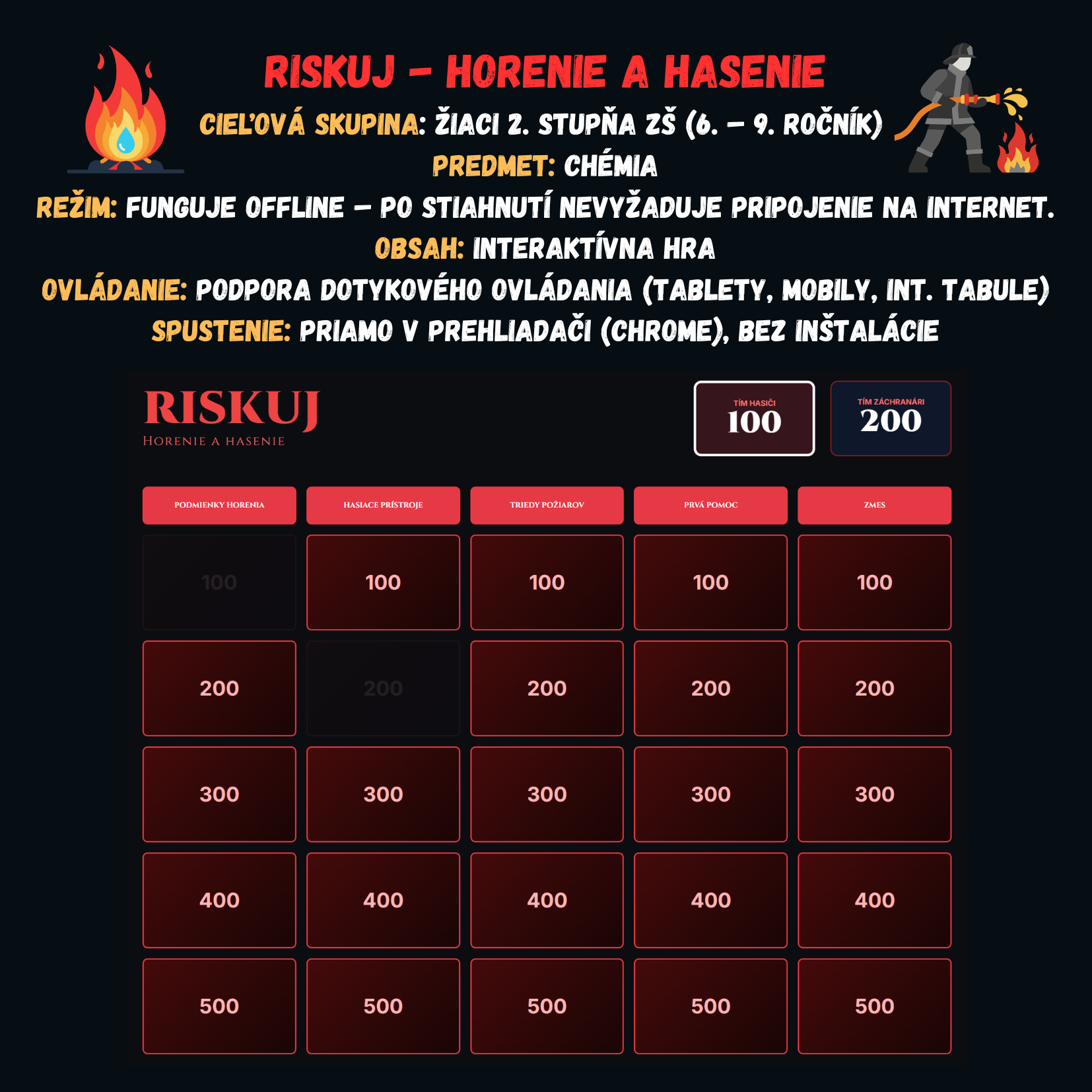 Premeňte hodinu chémie na napínavý súboj vedomostí! Táto digitálna hra prenáša obľúbený formát televíznej súťaže Riskuj! priamo do vašej triedy. Žiaci sa hravou formou ponoria do detailov chemických reakcií, od ohňového trojuholníka až po špecifiká hasenia kovov či jedlých tukov.