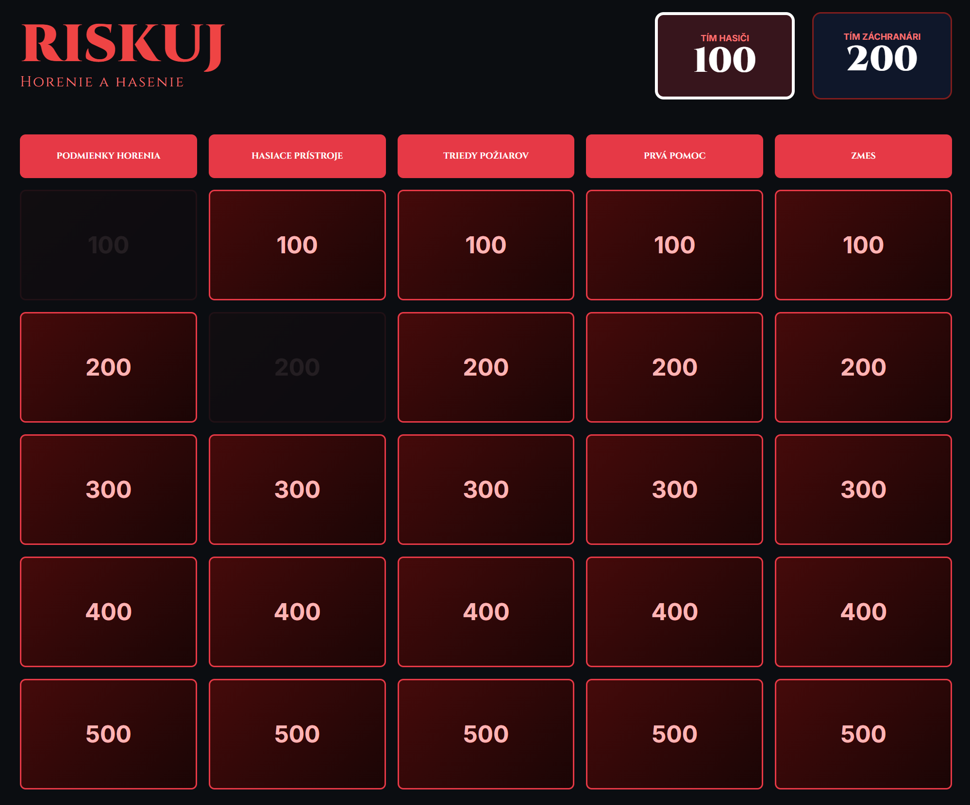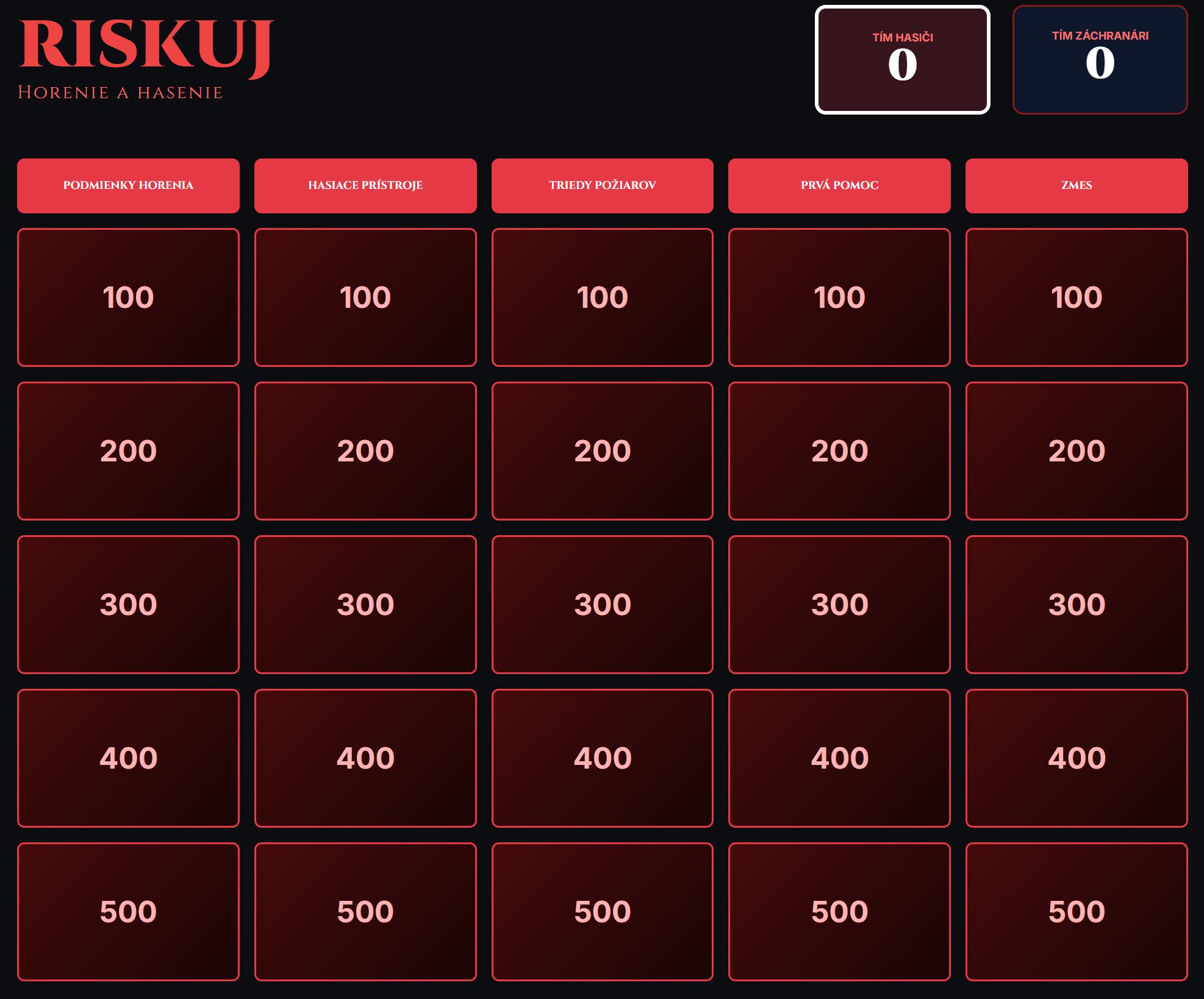 - Kompletná herná logika: Automatické striedanie dvoch tímov (Hasiči a Záchranári), pripočítavanie aj odpočítavanie bodov, časový limit 30 sekúnd na odpoveď a interaktívne zvukové efekty.