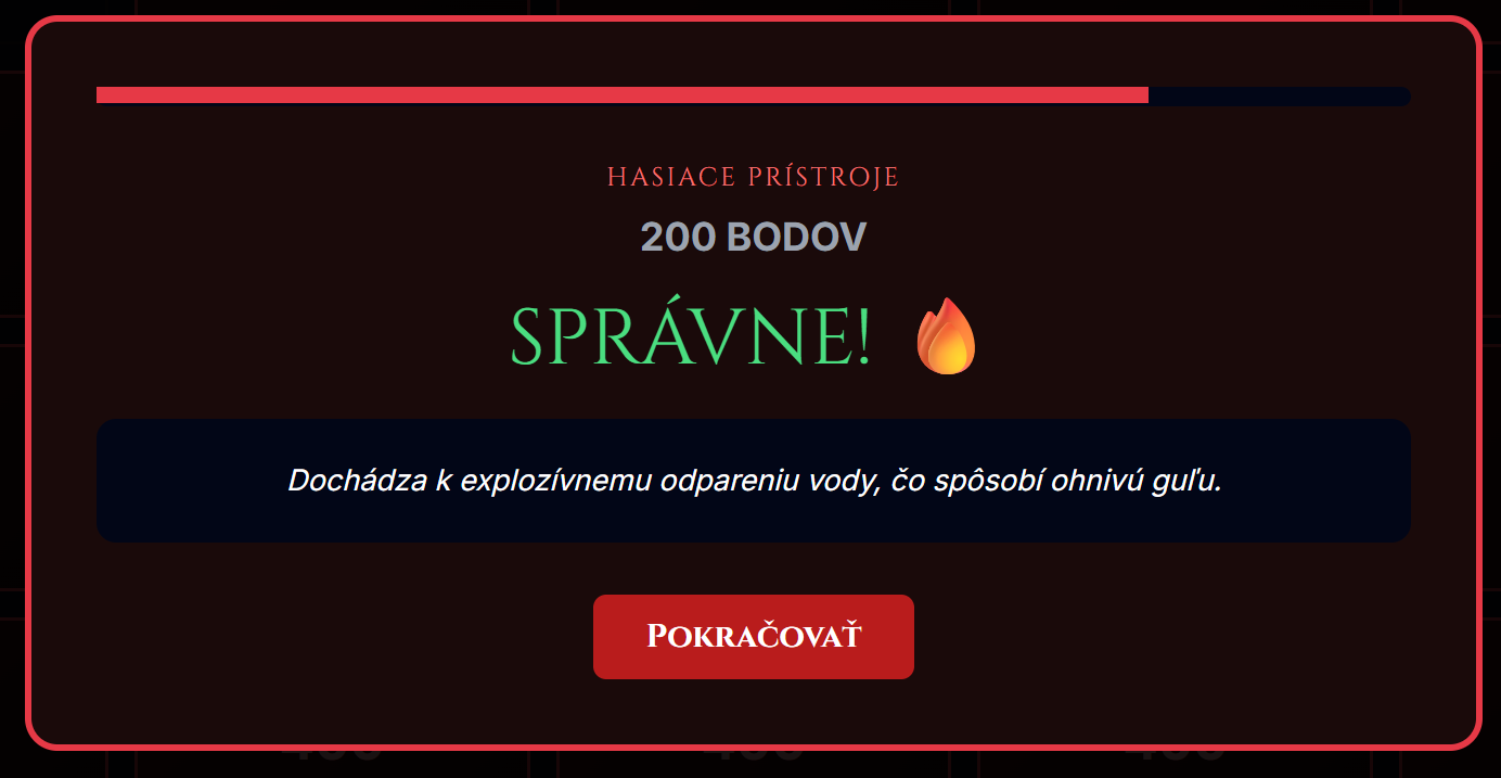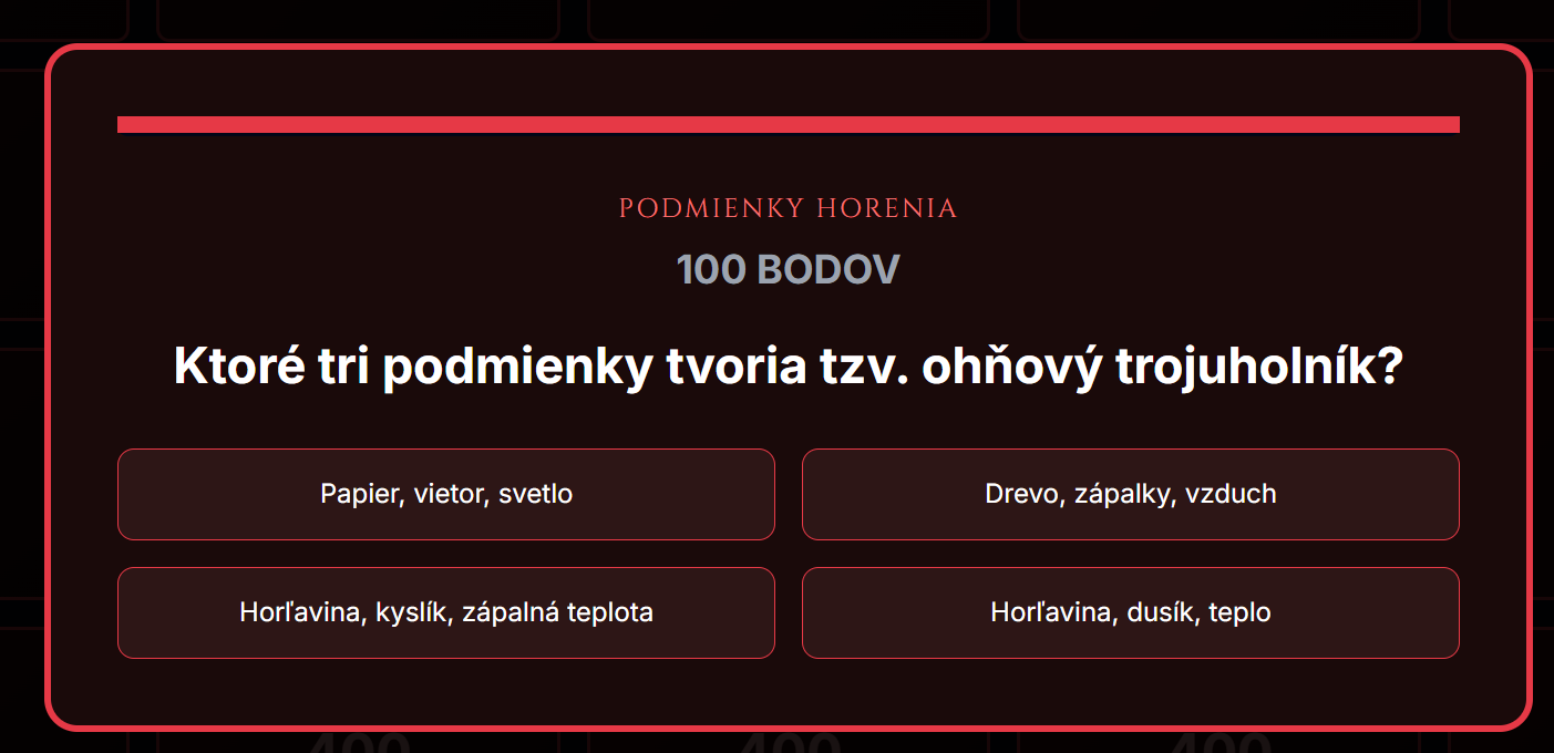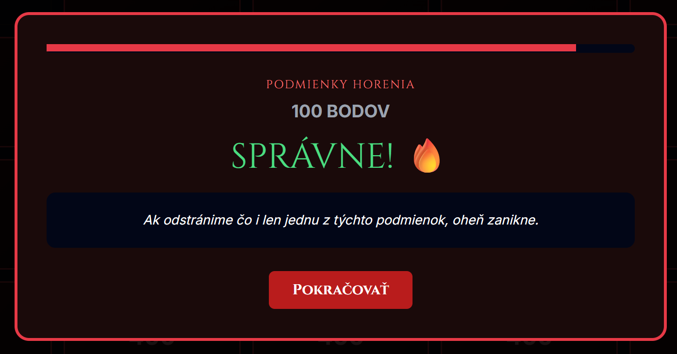 Cieľ aktivity: Precvičiť učivo o horení a hasení interaktívnou a vysoko motivujúcou formou, ktorá aktivuje celú triedu a upevní odbornú terminológiu.