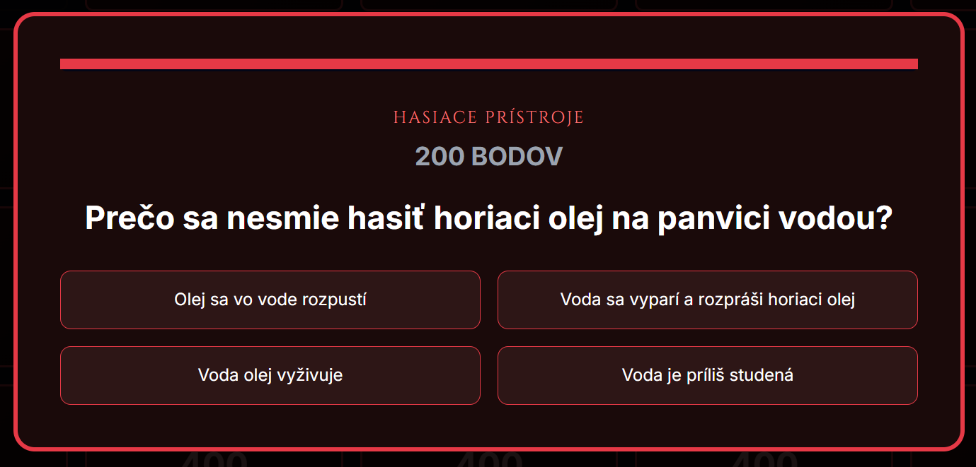 - 25 odborných otázok: Rozdelených do kategórií Podmienky horenia, Hasiace prístroje, Triedy požiarov, Prvá pomoc a Zmes.