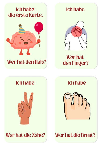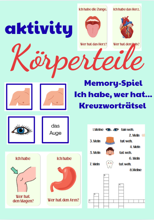 Materiál sa zameriava na základné časti ľudského tela a niektoré orgány. Zahrnutá slovná zásoba: der Hals, der Bauch, der Kopf, die Hand, die Schulter, das Bein, das Ohr, der Rücken, der Zahn, der Fuß, das Auge, die Nase, das Knie, die Haare, der Mund, der Arm, die Zunge, der Finger, die Brust, die Zehe, das Herz, die Lunge, der Magen, das Gehirn