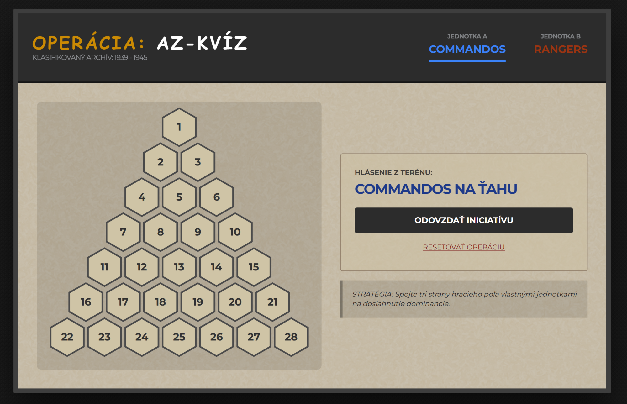 - Princip: Dva týmy (Commandos a Rangers) soupeří o pole v hexagonální mřížce. Po kliknutí na pole musí tým vybrat správnou odpověď ze čtyř možností v časově neomezeném limitu.