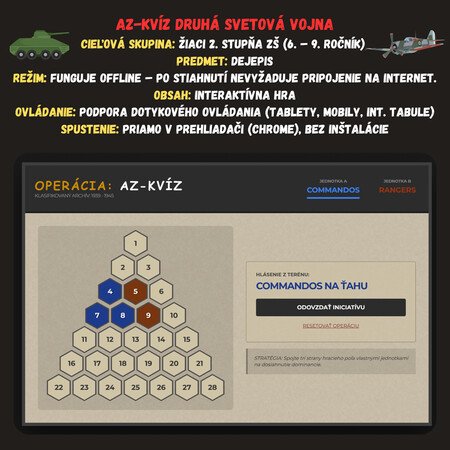 - Zaměření: Interaktivní dějepisná hra zaměřená na klíčové události, osobnosti a pojmy z let 1939–1945.