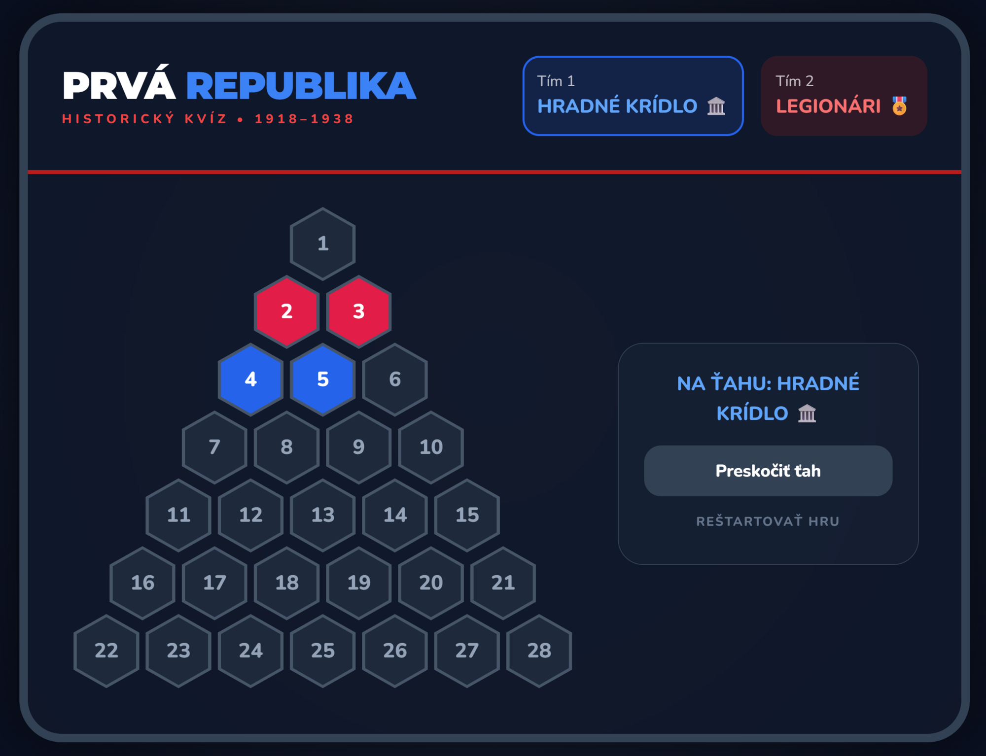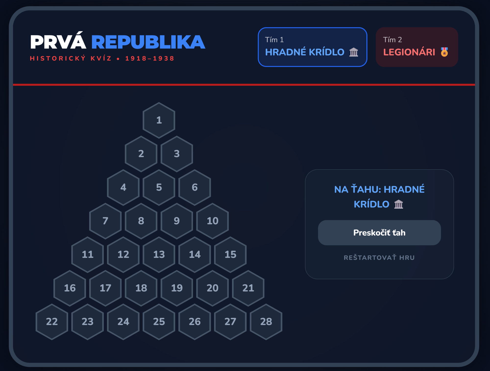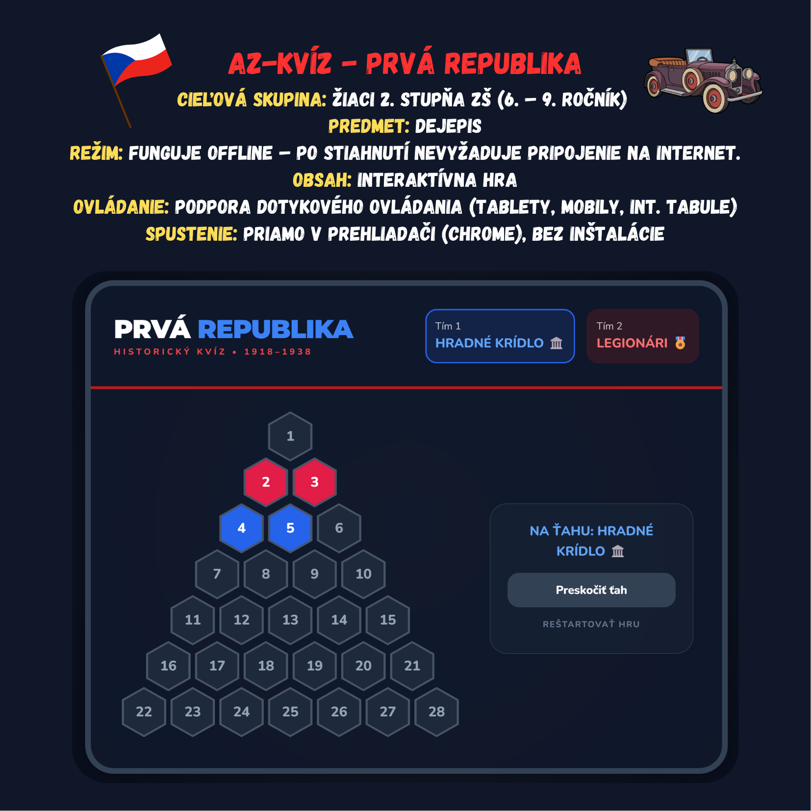 Premeňte hodinu dejepisu na napínavý súboj medzi Hradným krídlom a Legionármi! Táto digitálna hra prenáša obľúbený formát AZ-kvízu priamo do vašej triedy. Žiaci sa hravou formou ponoria do atmosféry rokov 1918–1938 a preveria svoje znalosti o vzniku ČSR, jej symboloch a významných osobnostiach.