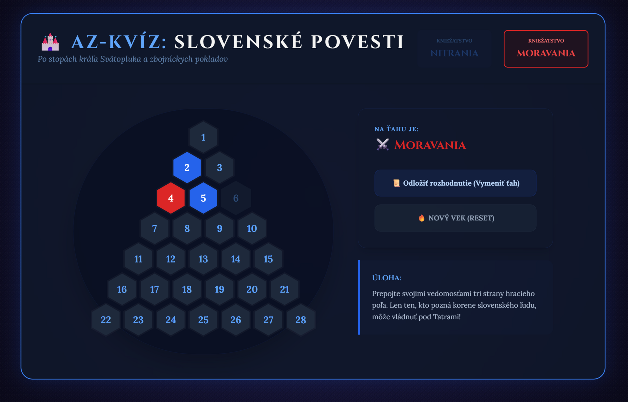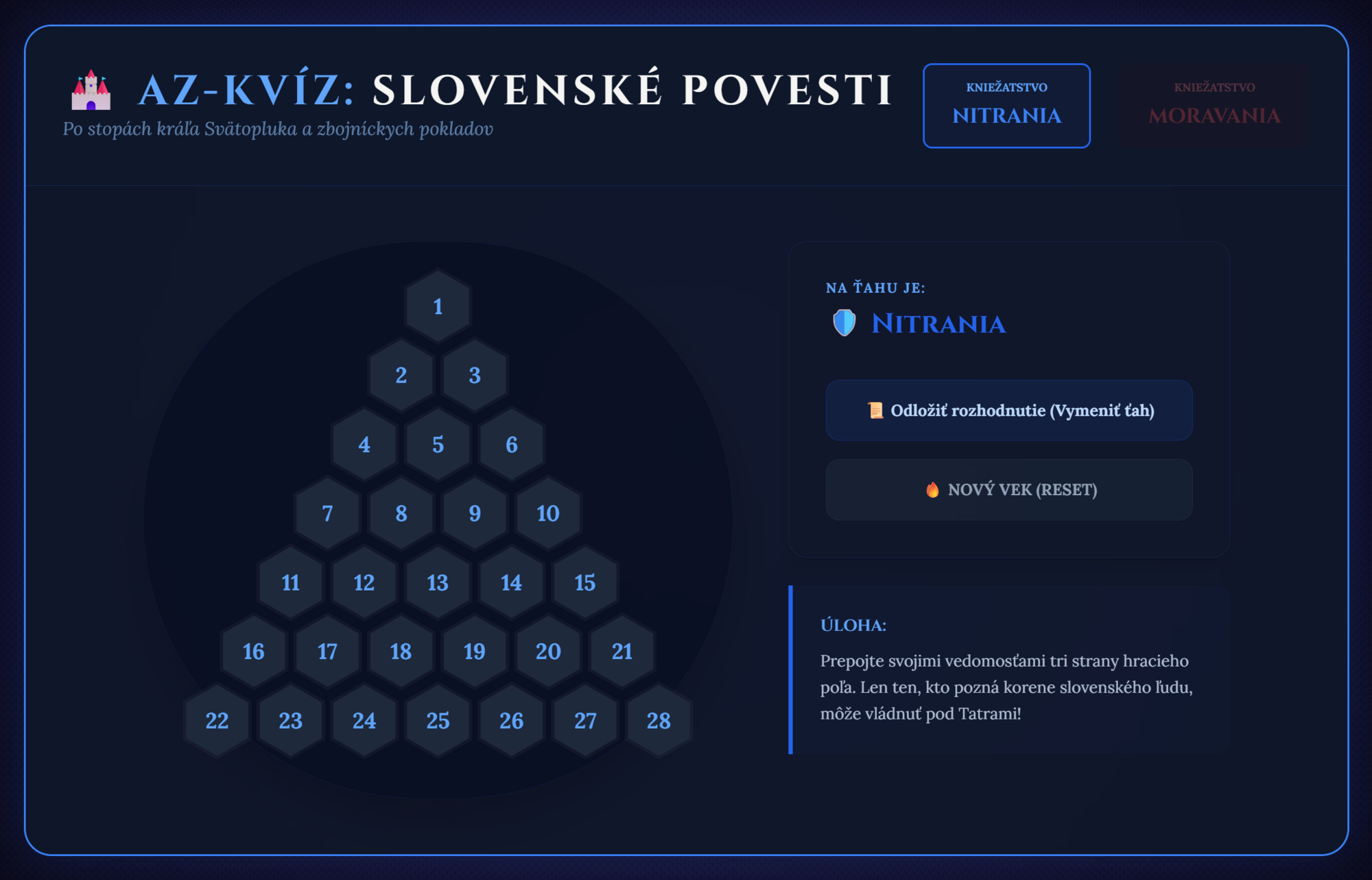 Premeňte hodinu dejepisu alebo literatúry na napínavý súboj o nadvládu nad územím starých Slovanov! Táto digitálna hra prenáša obľúbený formát televíznej súťaže AZ-kvíz priamo do vašej triedy. Žiaci sa hravou formou ponoria do sveta kráľa Svätopluka, zbojníckych pokladov a tajuplných hradných legiend.