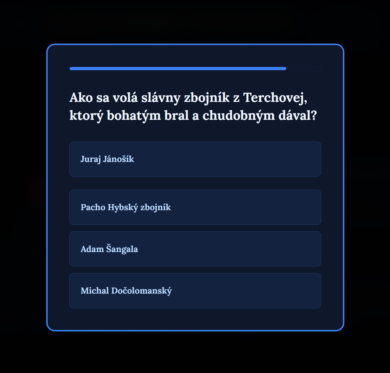 - 30 odborných otázok: Rozdelených do kategórií podľa slovenských reálií a povestí. Pokrýva všetko od bájnych prútov kráľa Svätopluka až po poklady ukryté v Tatrách.