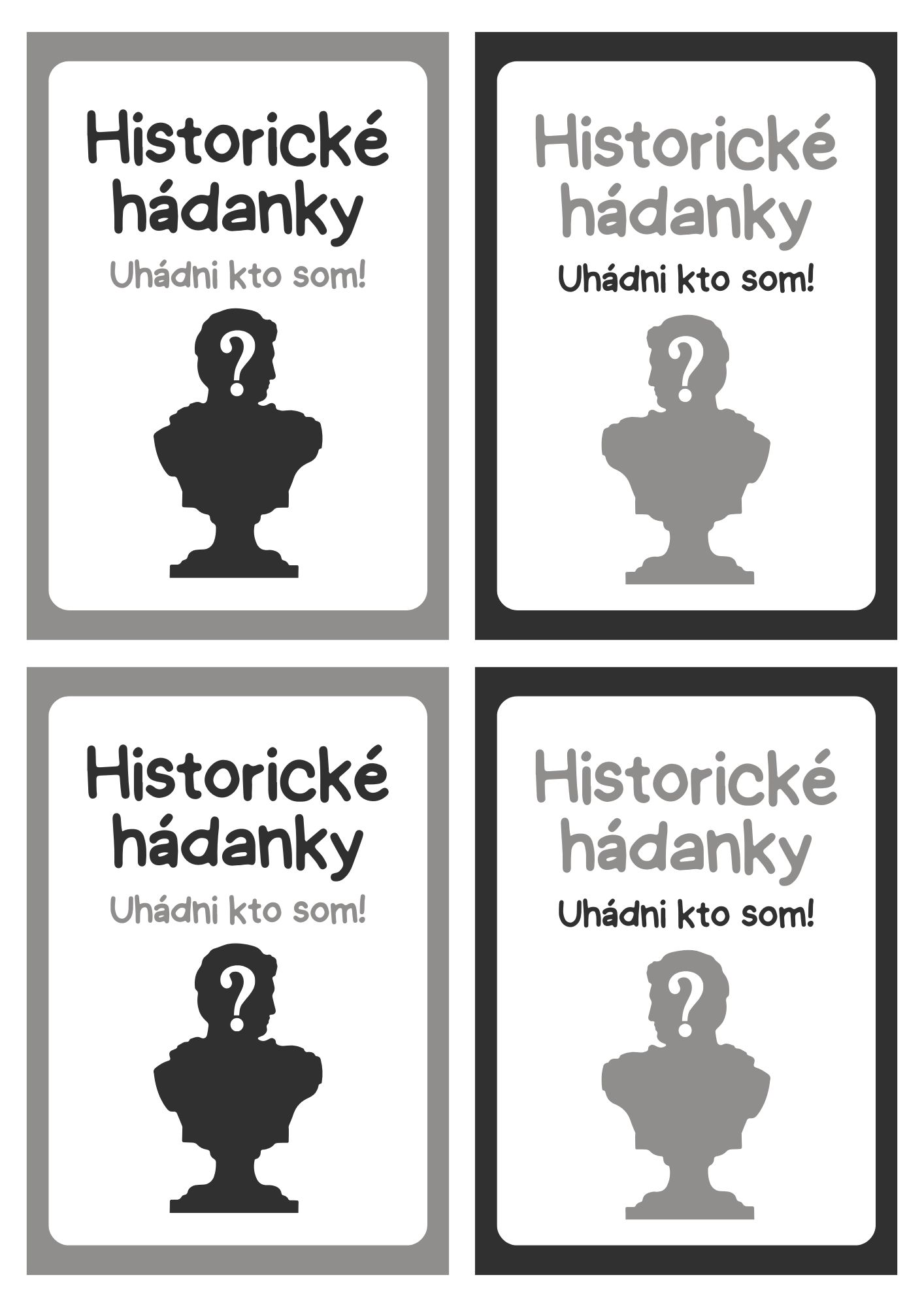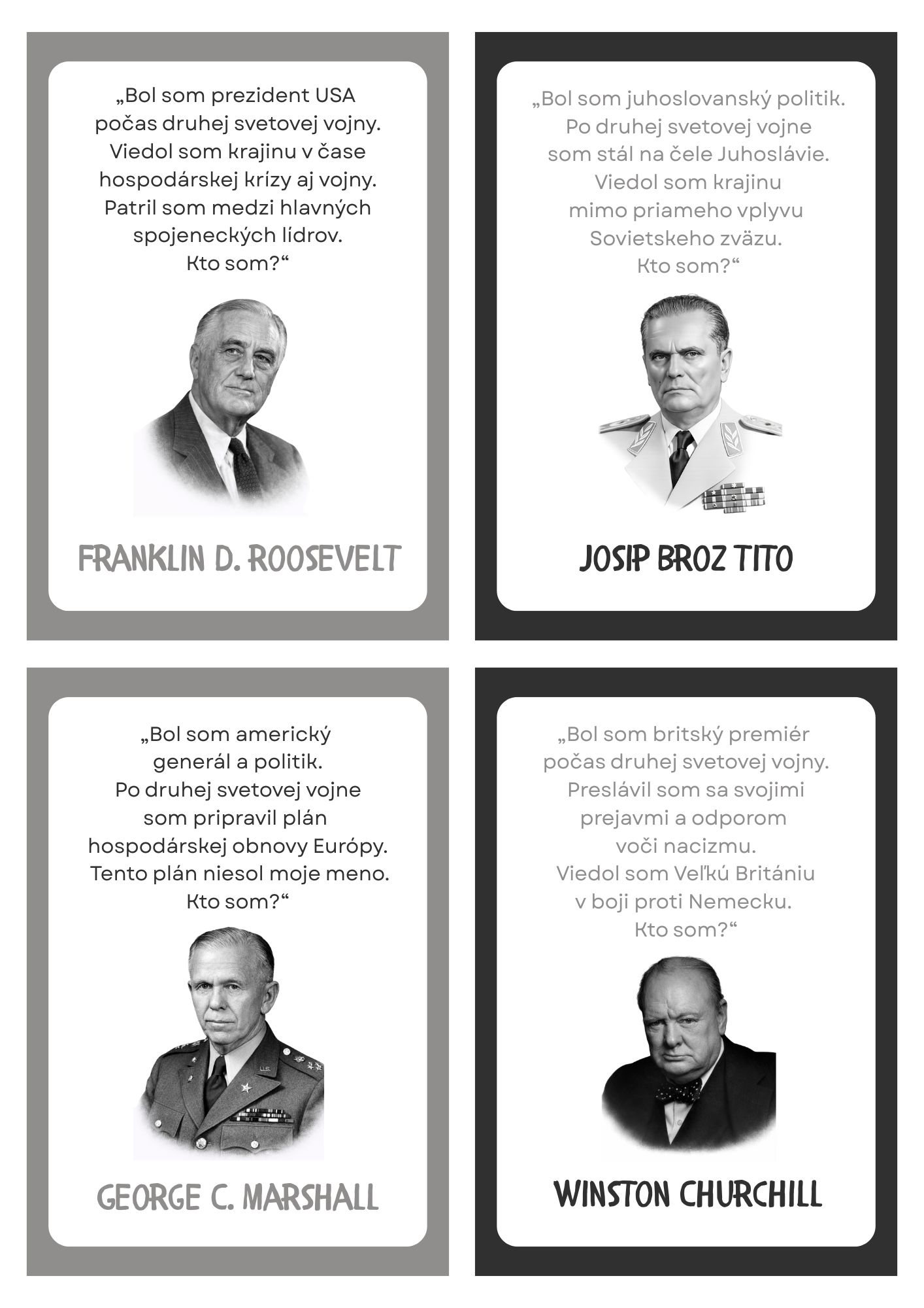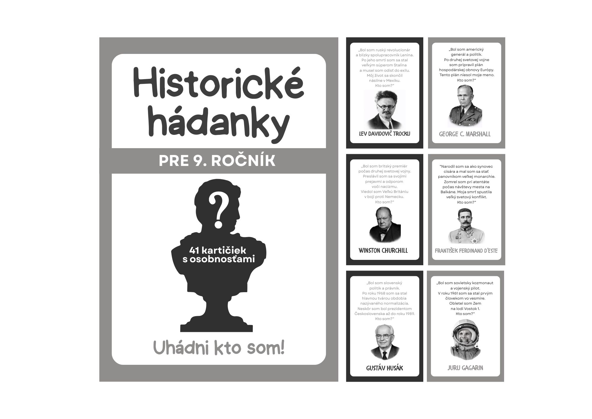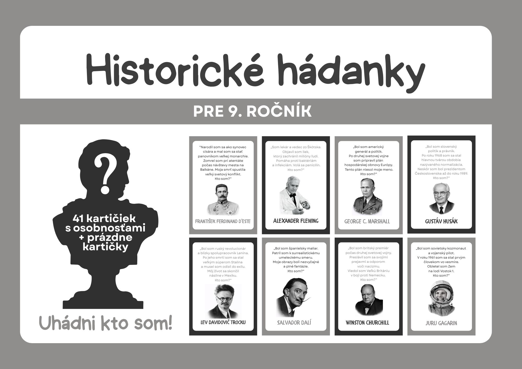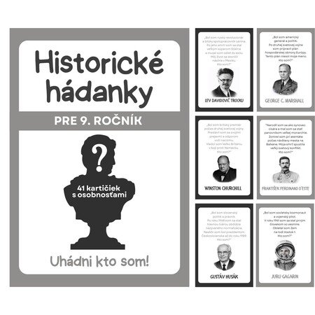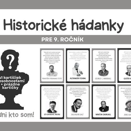 Materiál obsahuje 41 kartičiek s hádankami osobností (svetových aj slovenských dejín) z učiva dejepisu pre 9. ročník. Materiál je pripravený na obojstrannú tlač. V materiáli sa nachádzajú aj prázdne kartičky pre vlastné hádanky. Obrázky sú vytvorené pomocou Open AI.