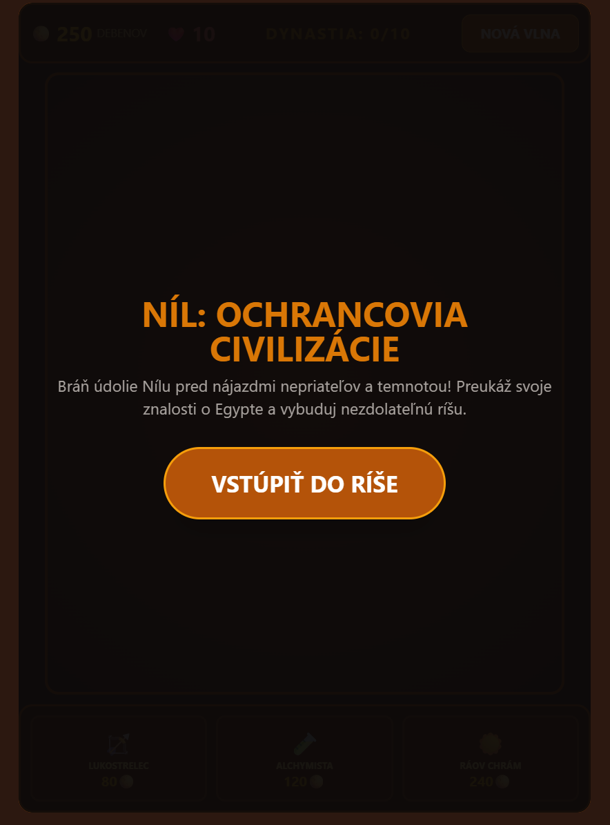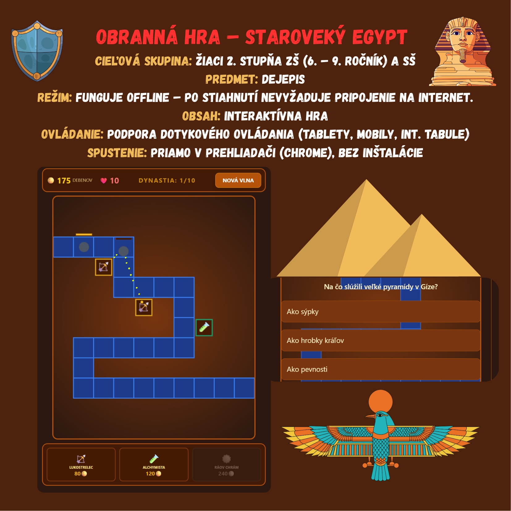 Premeňte hodinu dejepisu na napínavú strategickú bitku o osud starovekého Egypta! Táto digitálna hra kombinuje populárny formát „Tower Defense“ s preverením vedomostí. Žiaci sa v roli stratégov učia o faraónoch, bohoch, pyramídach aj každodennom živote pri Níle, aby získali prostriedky na obranu svojej ríše.