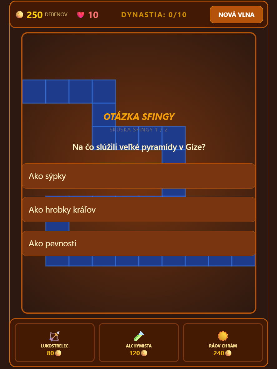 - Interaktívny kvíz: Pred každou vlnou položí Sfinga záludné otázky. Správna odpoveď prináša zlato na stavbu obrany, čím prepojuje vedomosti s herným úspechom.
