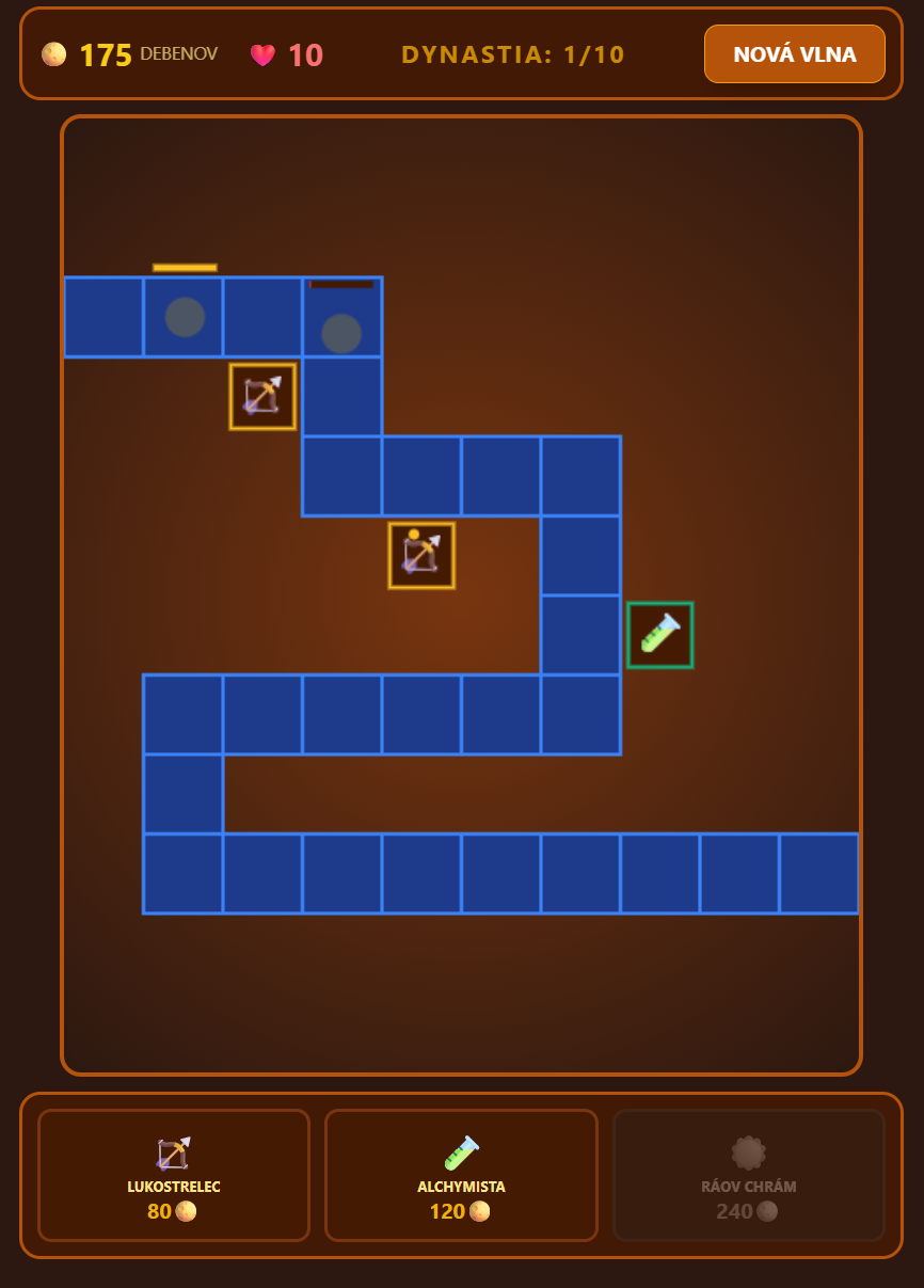 - Kompletná herná logika: 10 postupne gradujúcich vĺn (dynastií), 3 typy obranných veží s rôznymi vlastnosťami, systém životov a hernej meny (debeny).
