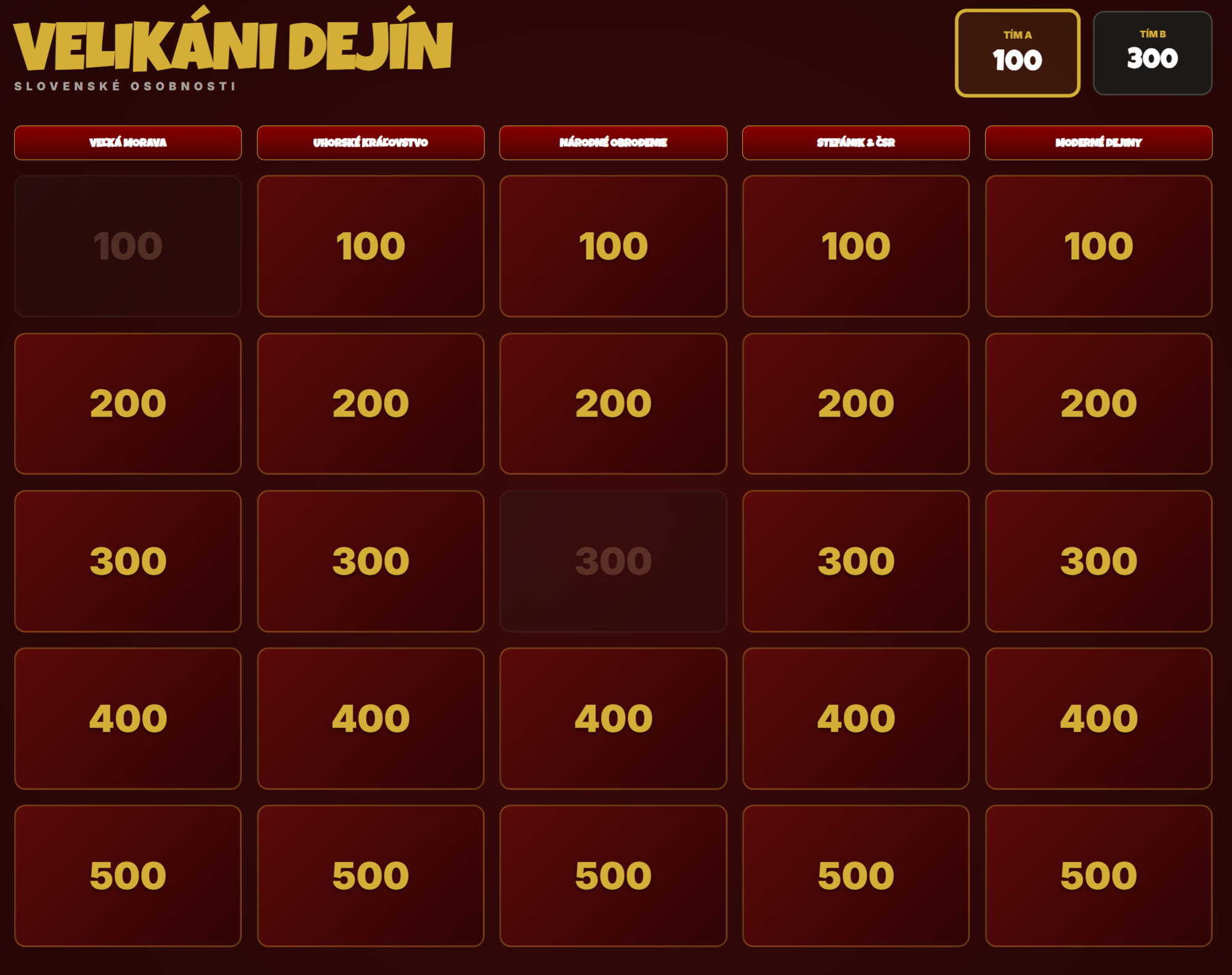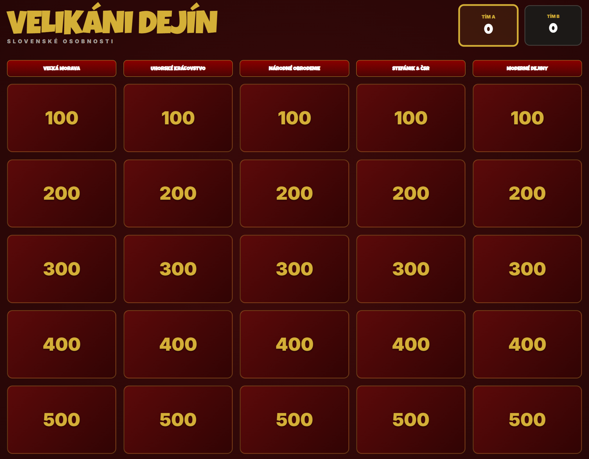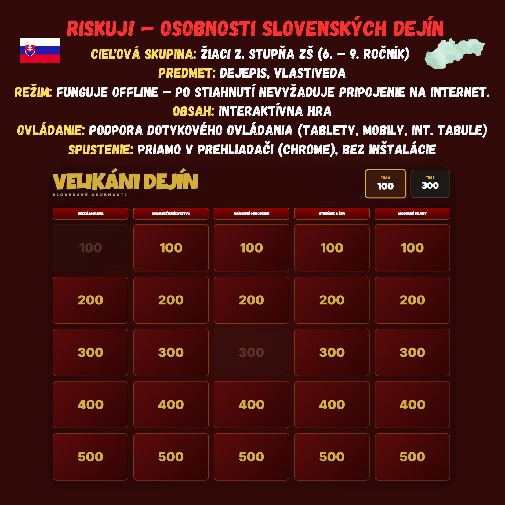 Premeňte hodinu dejepisu na napínavý súboj vedomostí! Táto digitálna hra prenáša obľúbený formát televíznej súťaže Riskuj! priamo do vašej triedy. Žiaci sa hravou formou ponoria do detailov našej histórie – od kniežat Veľkej Moravy až po moderných hrdinov dneška.