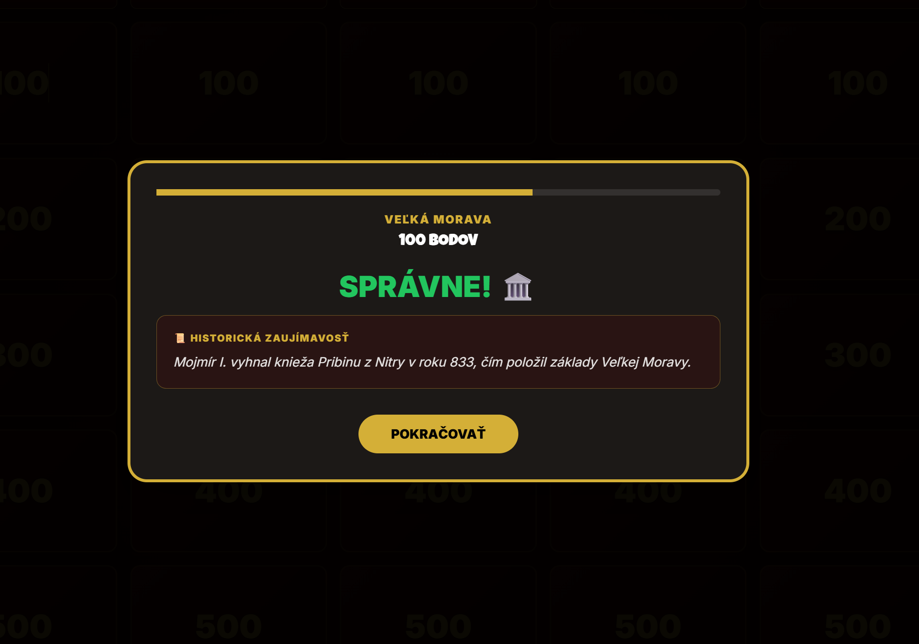 - Vizuálna spätná väzba: Po každej odpovedi sa zobrazí správne riešenie a historická zaujímavosť, čo zaisťuje vzdelávací efekt aj pri chybnej voľbe.