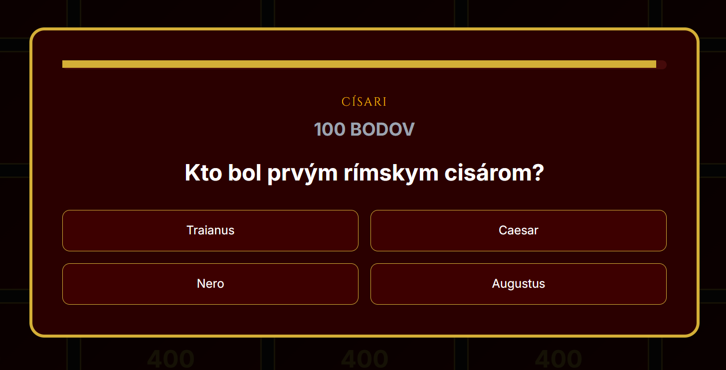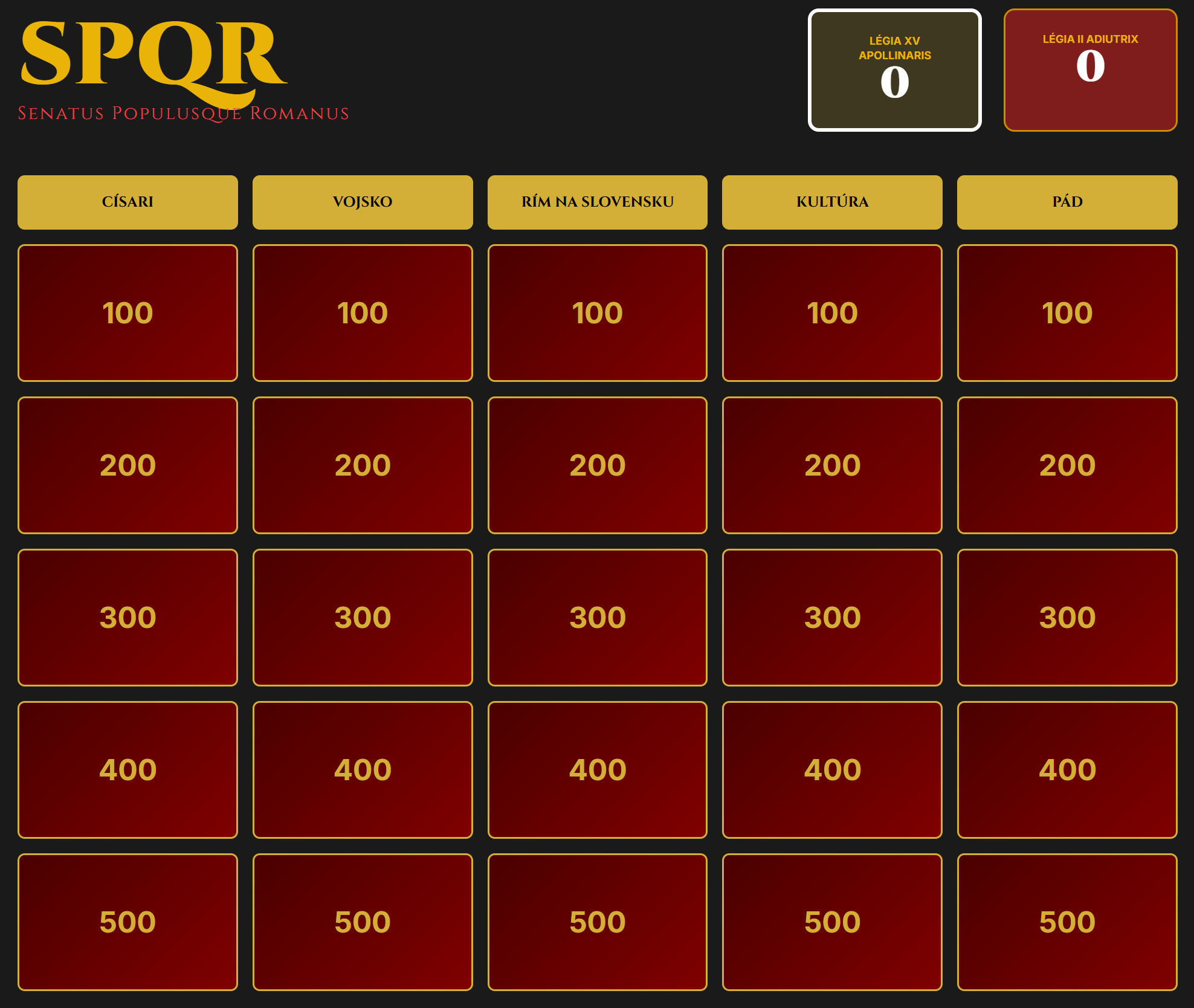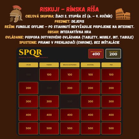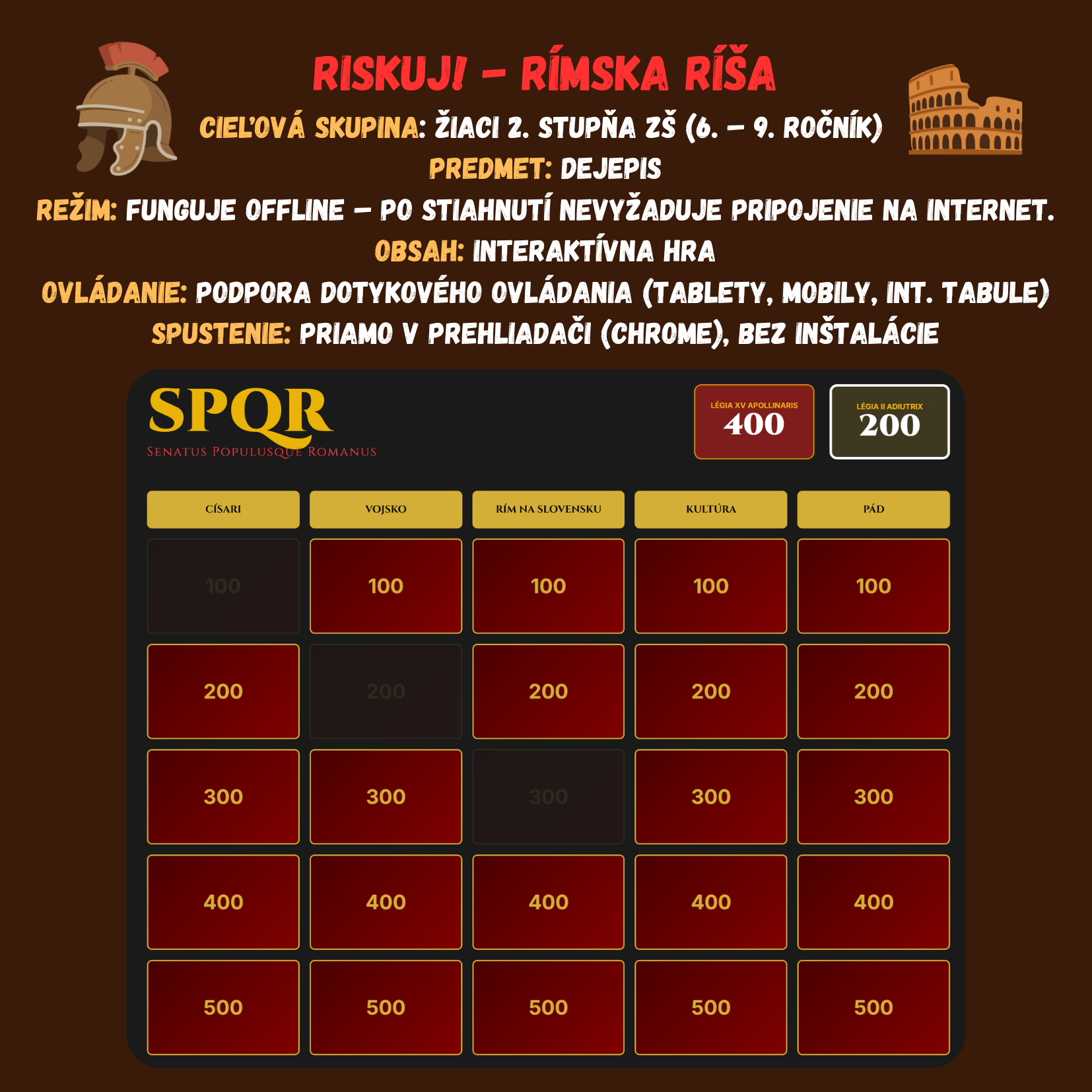 Premeňte hodinu dejepisu na napínavý súboj vedomostí! Táto digitálna hra prenáša obľúbený formát televíznej súťaže Riskuj! priamo do vašej triedy. Žiaci sa hravou formou ponoria do detailov rímskych dejín, od prvých cisárov až po stopy Rimanov na našom území.