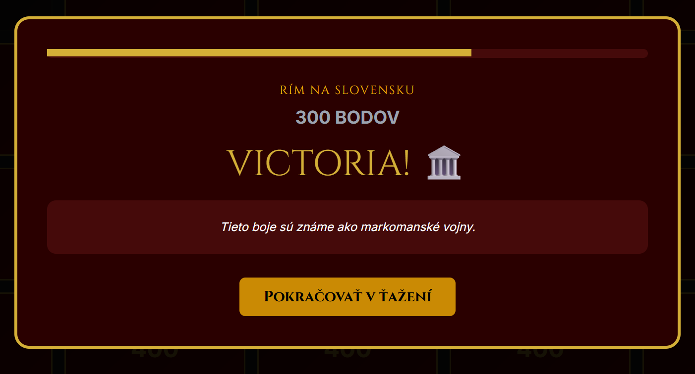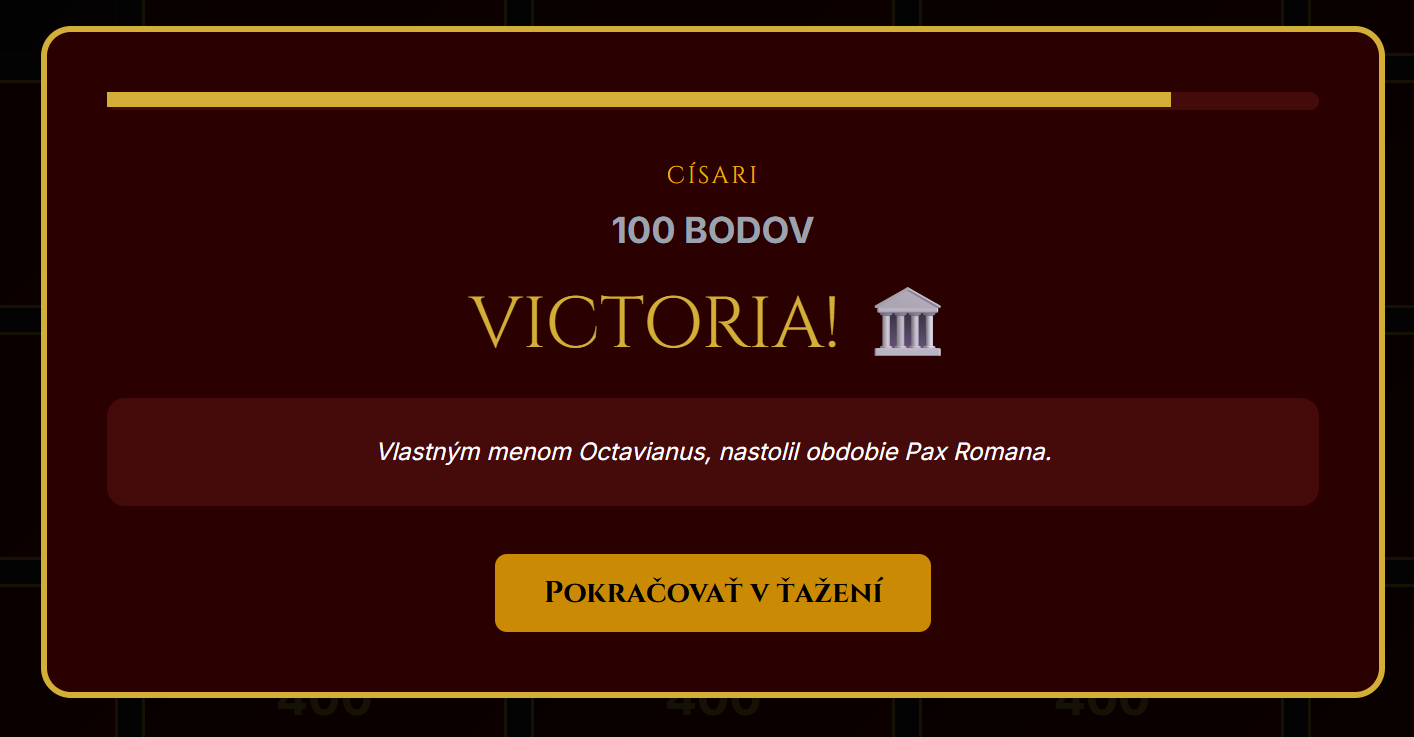 - Vizuálna spätná väzba: Po každej odpovedi sa zobrazí správne riešenie doplnené o zaujímavý historický fakt, čo zaisťuje vzdelávací efekt aj pri chybnej voľbe.