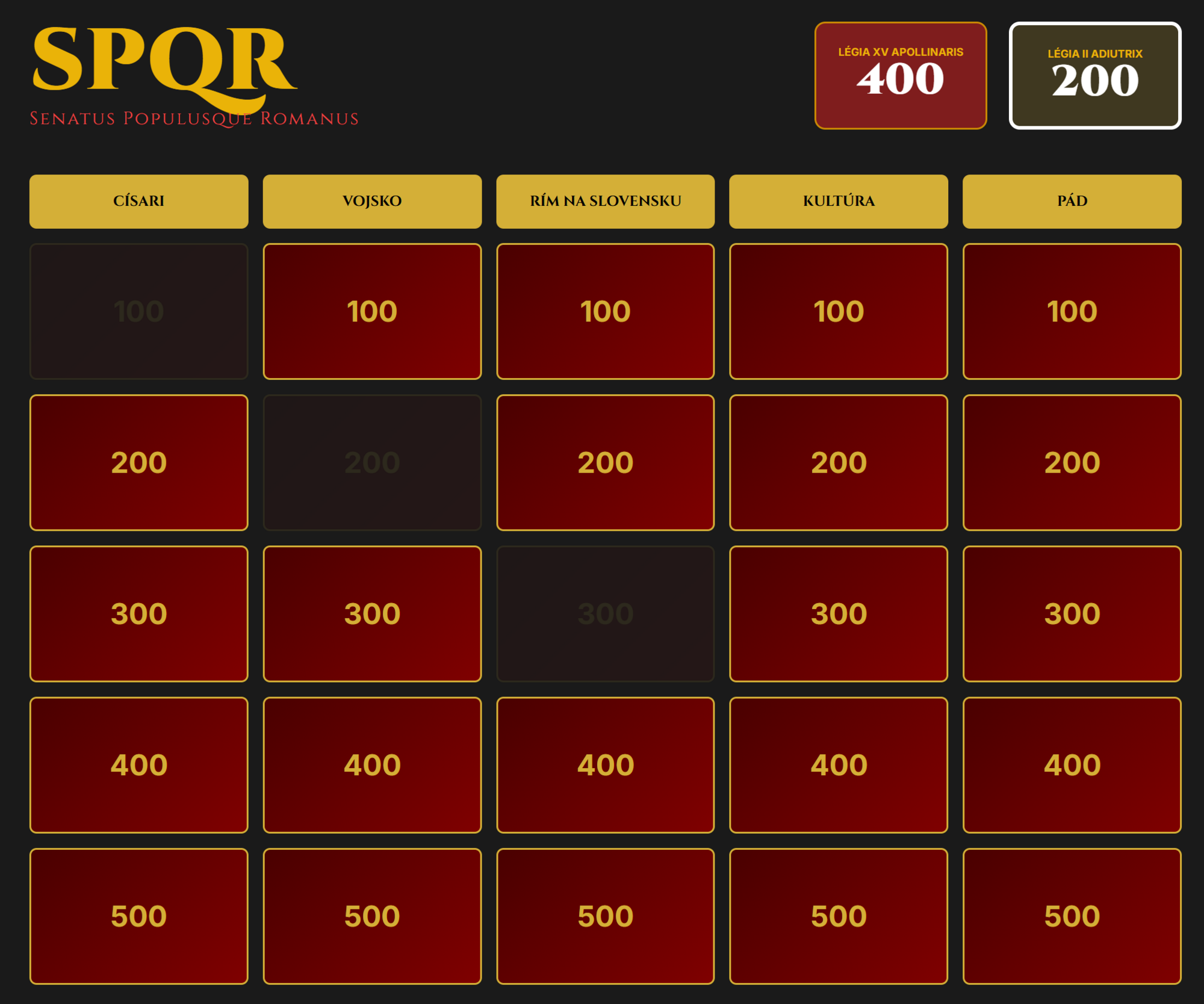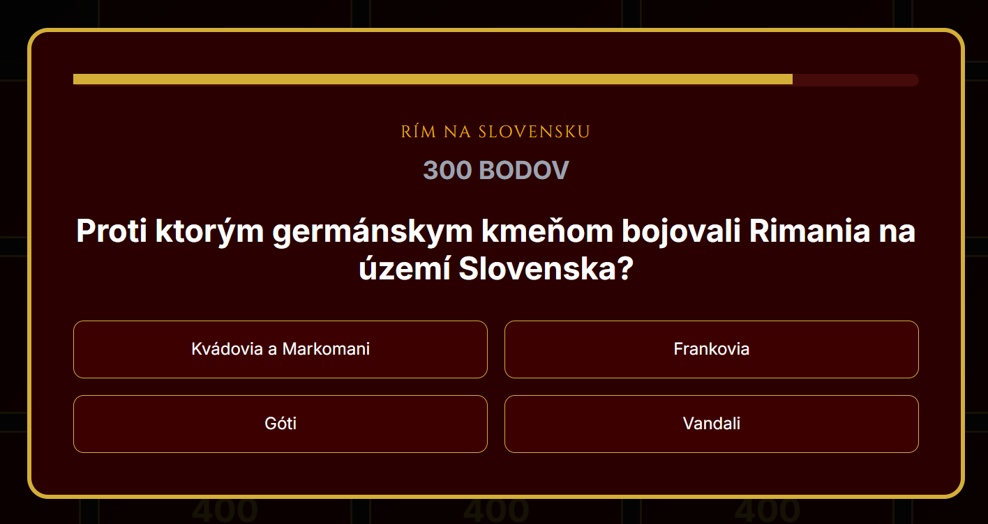 - 25 odborných otázok: Rozdelených do kategórií Císari, Vojsko, Rím na Slovensku, Kultúra a Pád.