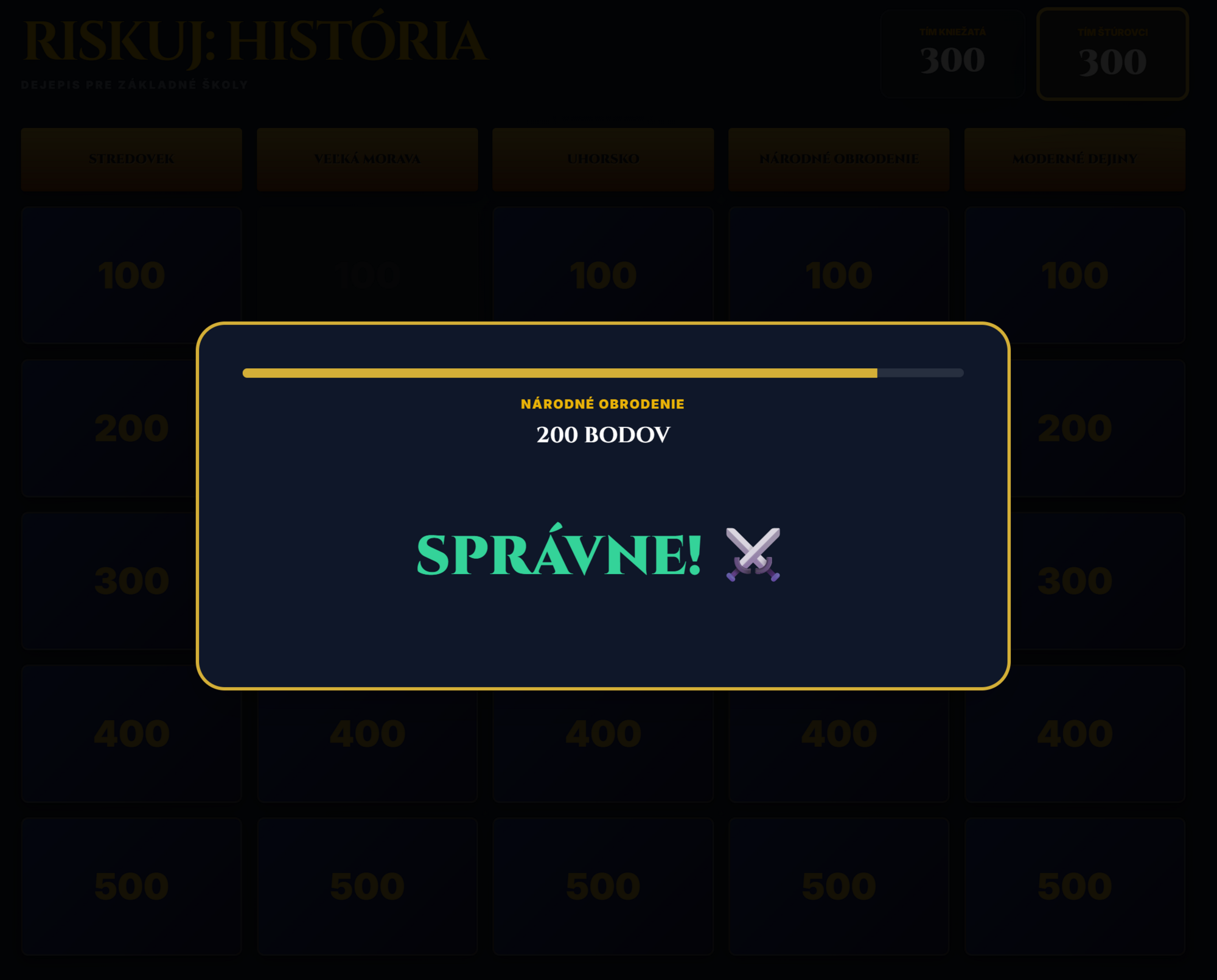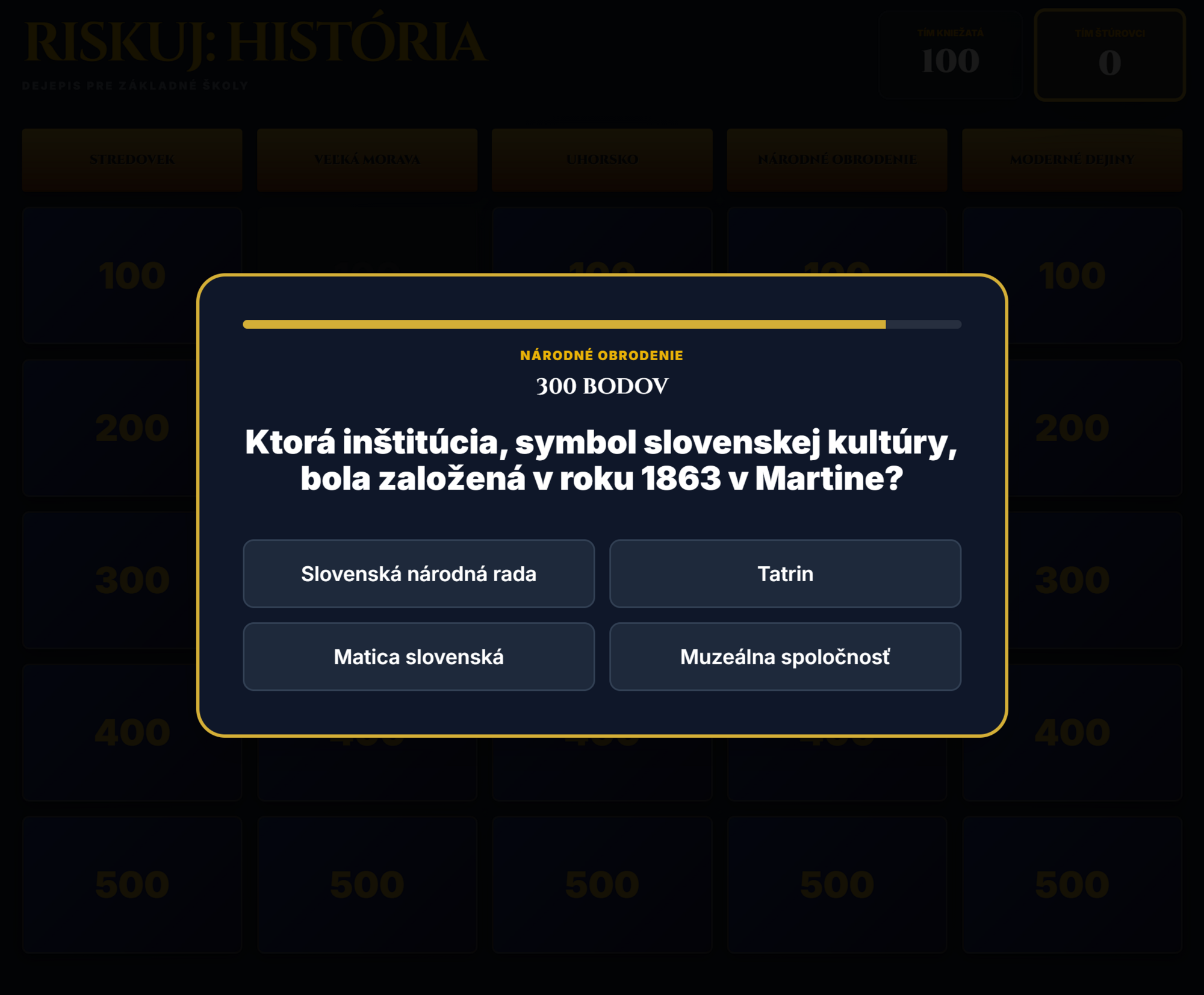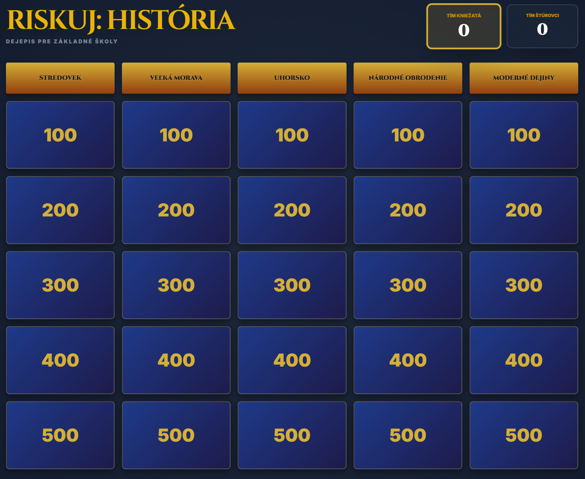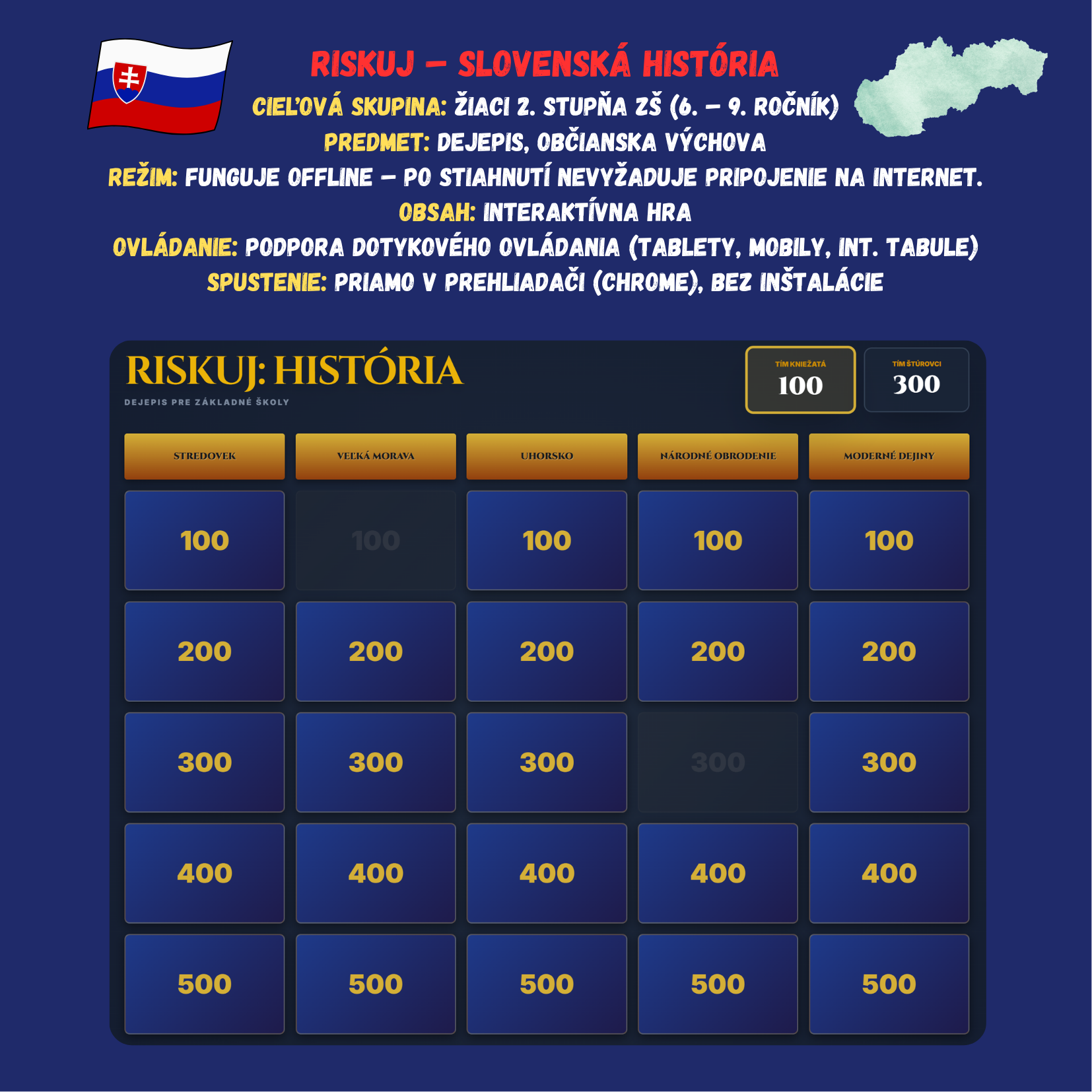 Premeňte hodinu dejepisu na napínavý súboj vedomostí! Táto digitálna hra prenáša obľúbený formát televíznej súťaže Riskuj! priamo do vašej triedy. Žiaci sa hravou formou ponoria do detailov slovenskej histórie, od Sama až po moderné dejiny.