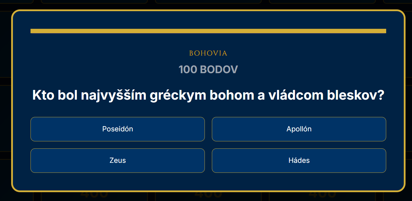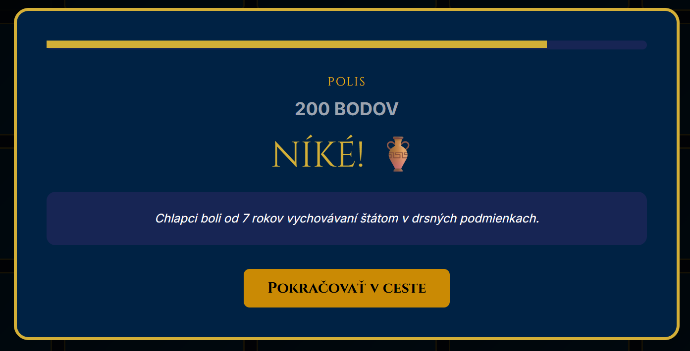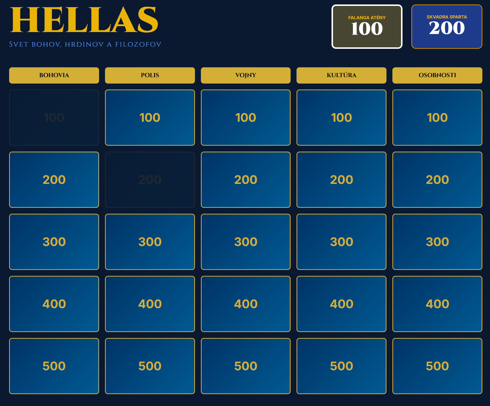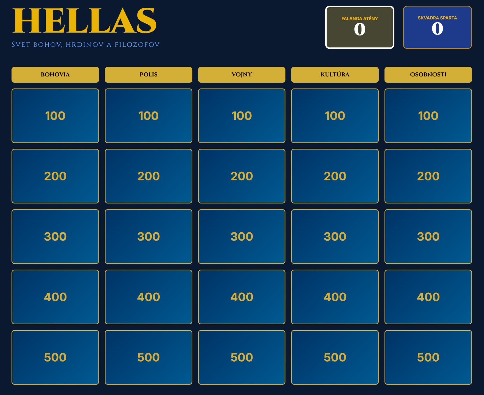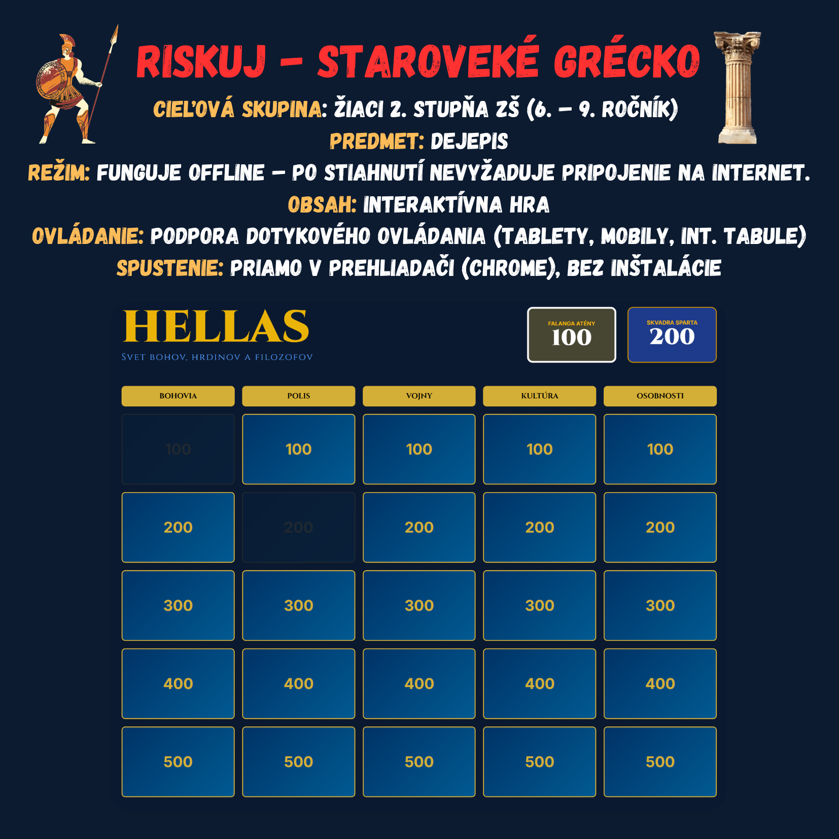Premeňte hodinu dejepisu na napínavý súboj medzi Aténami a Spartou! Táto digitálna hra prenáša obľúbený formát televíznej súťaže Riskuj! priamo do vašej triedy. Žiaci sa hravou formou ponoria do sveta olympijských bohov, hrdinských bitiek a antickej kultúry.