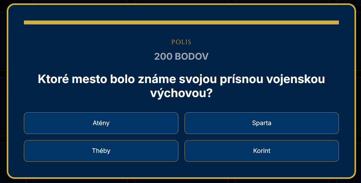 Cieľ aktivity: Precvičiť učivo o starovekom Grécku interaktívnou a vysoko motivujúcou formou, ktorá aktivuje celú triedu a upevní historické pojmy a súvislosti.