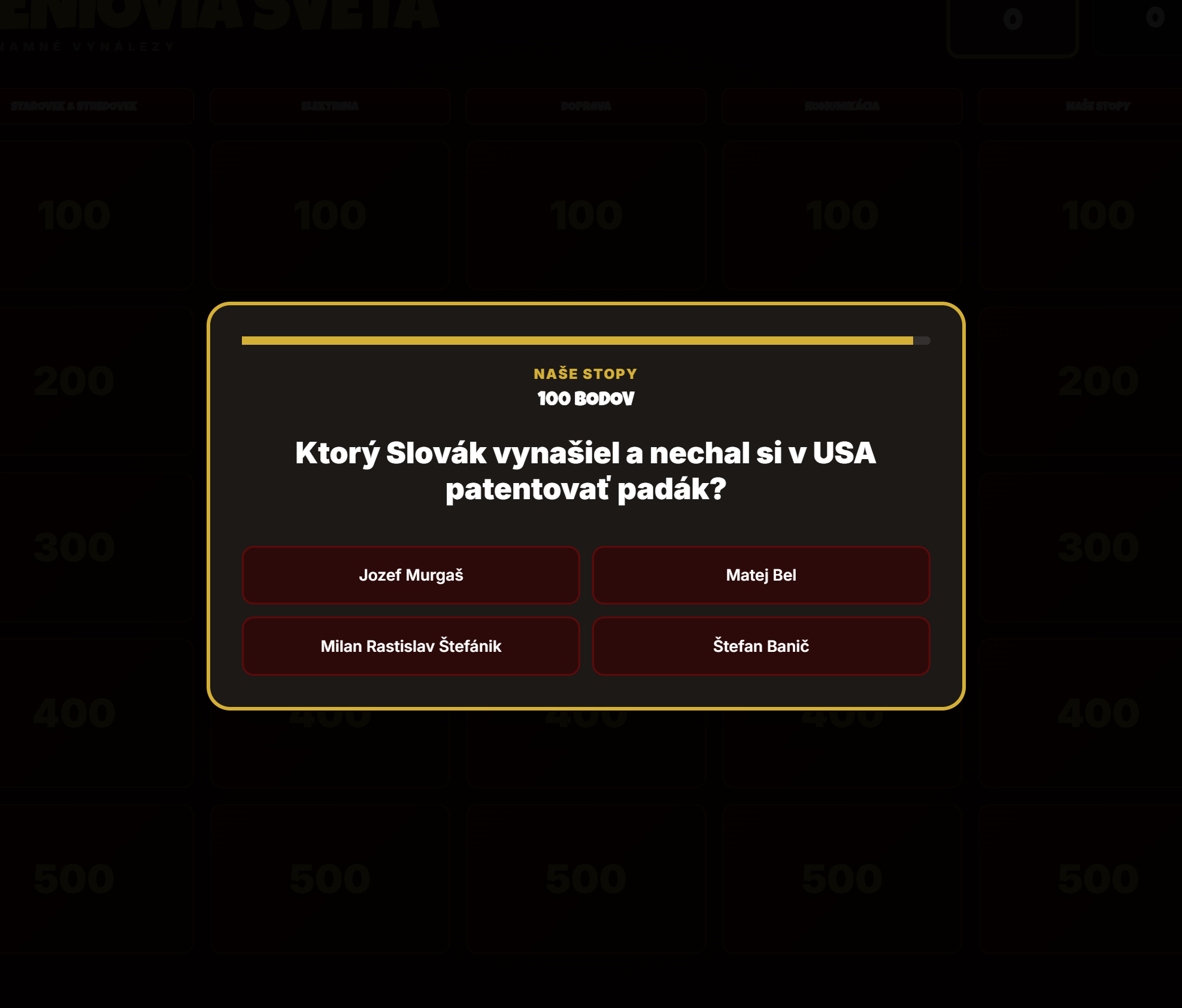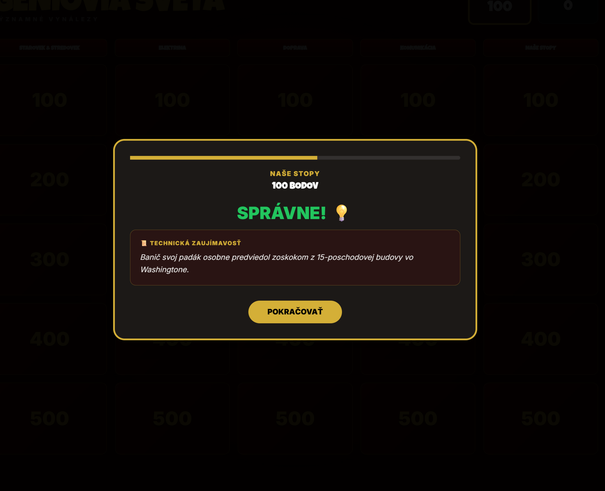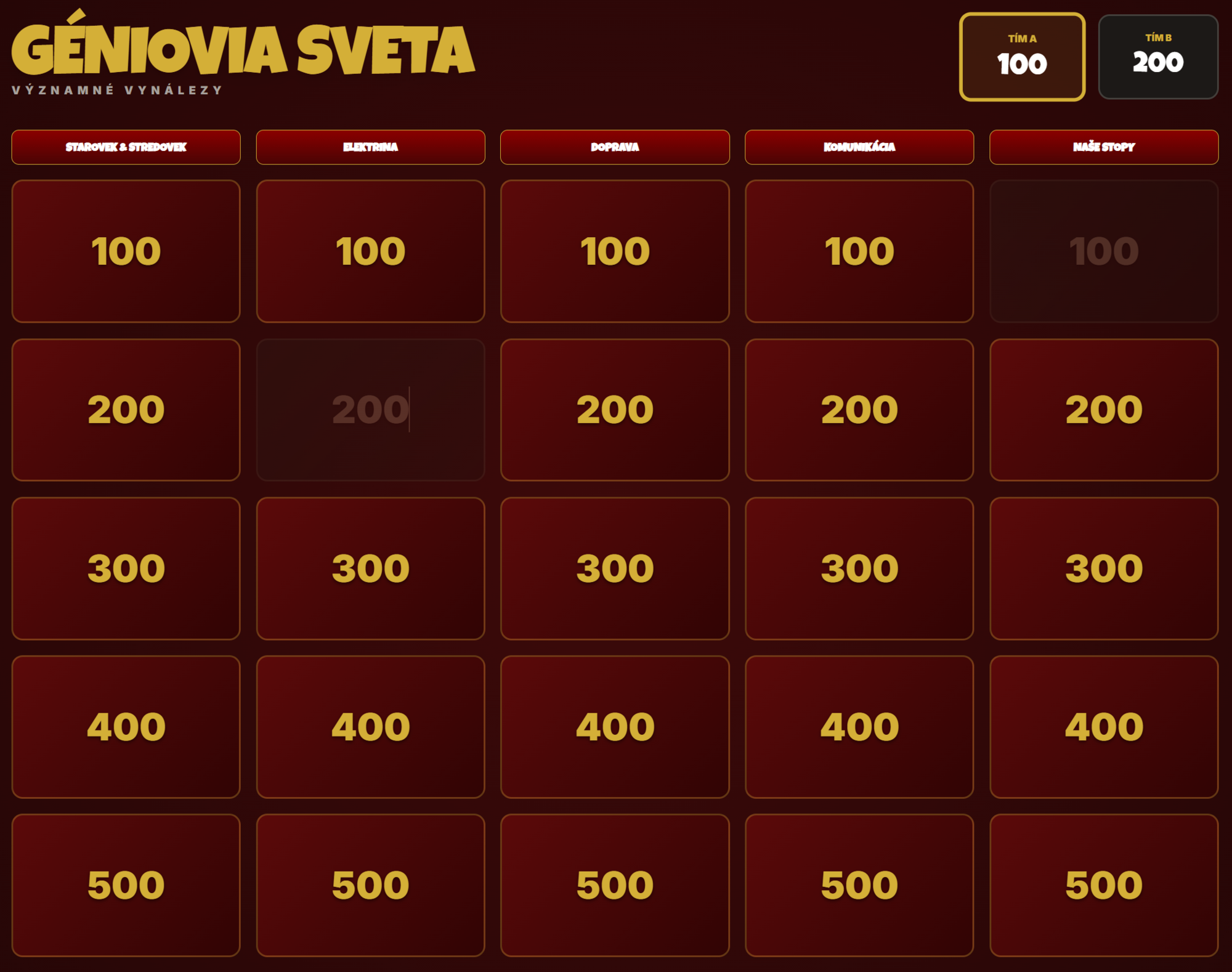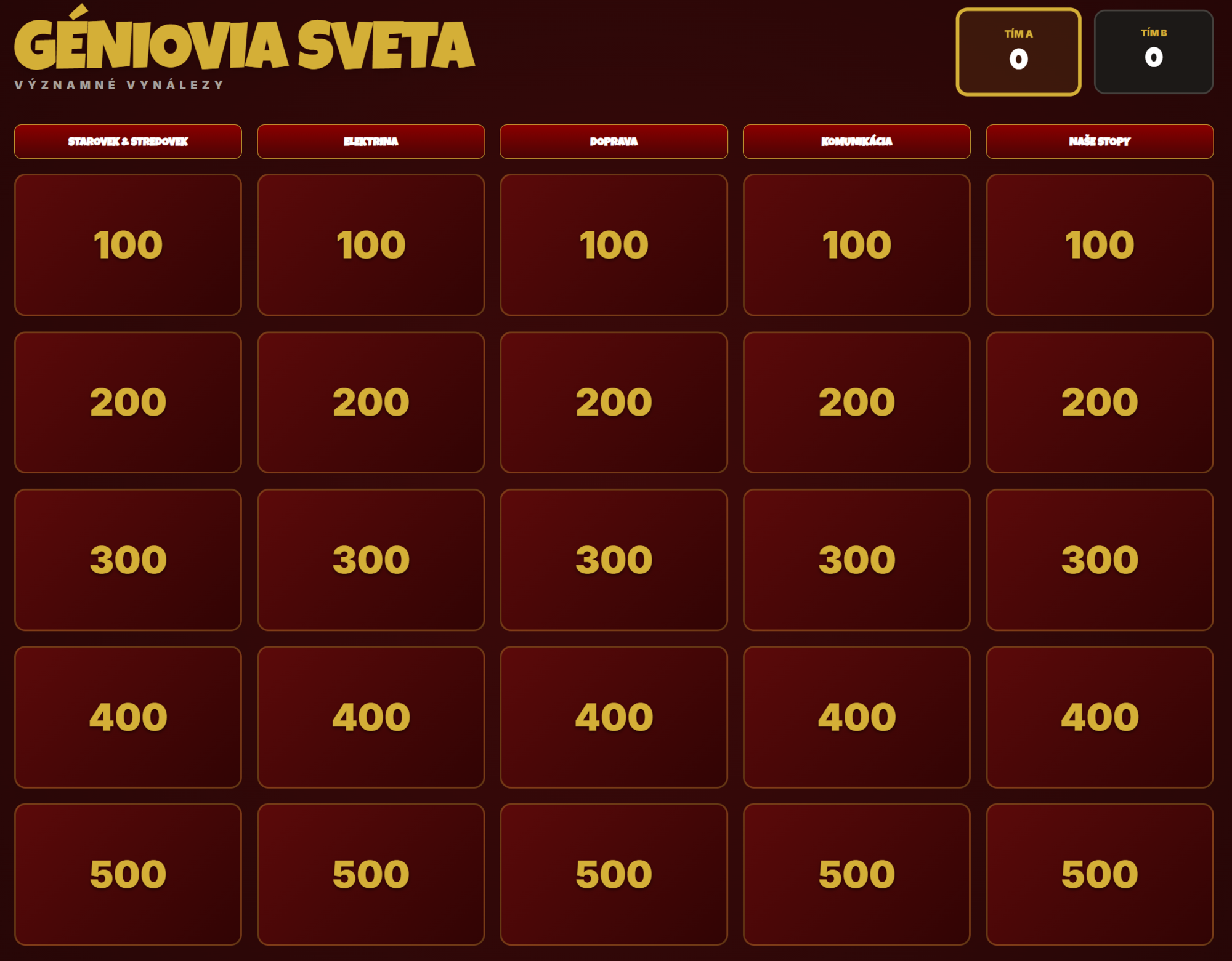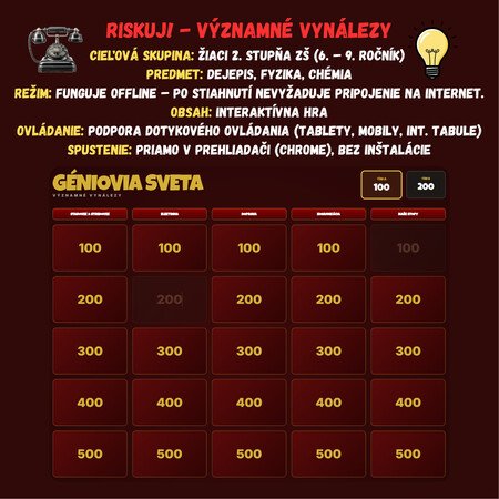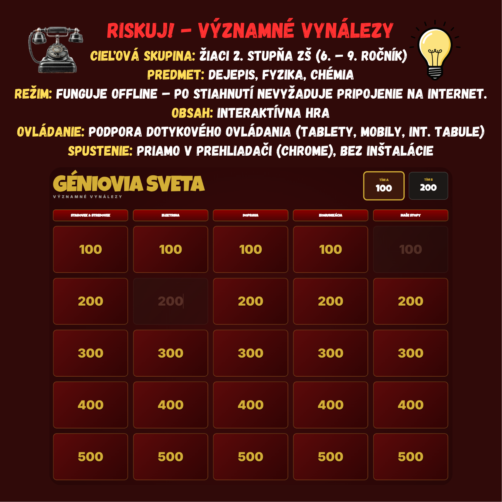 Premeňte hodinu dejepisu alebo fyziky na napínavý súboj vedomostí! Táto digitálna hra prenáša obľúbený formát televíznej súťaže Riskuj! priamo do vašej triedy. Žiaci sa hravou formou ponoria do histórie ľudského dôvtipu – od starovekého kolesa až po celosvetovú sieť WWW.