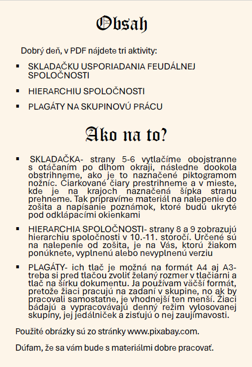 - HIERARCHIA SPOLOČNOSTI- strany 8 a 9 zobrazujú hierarchiu spoločnosti v 10.-11. storočí. Určené sú na nalepenie od zošita, je na Vás, ktorú žiakom ponúknete, vyplnenú alebo nevyplnenú verziu