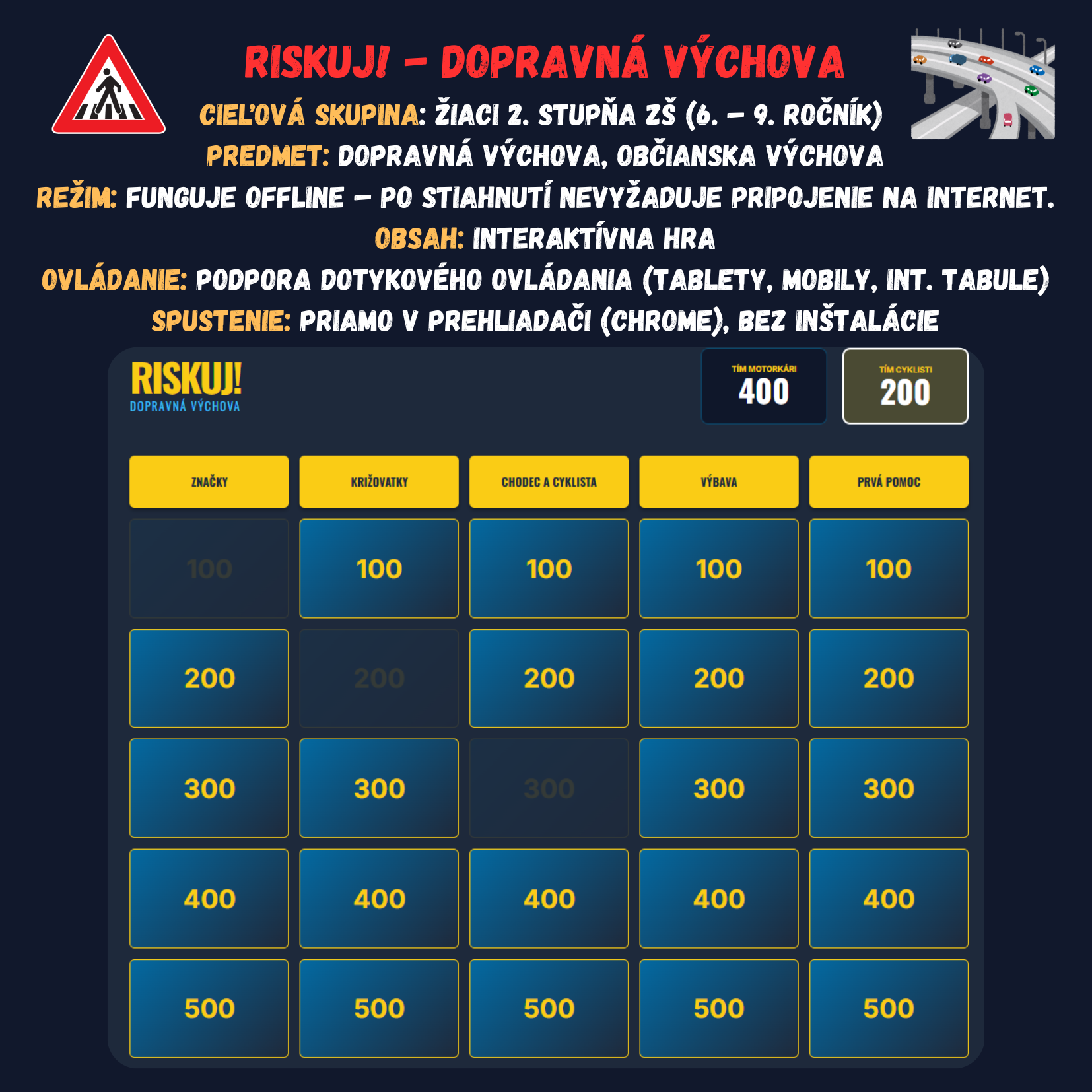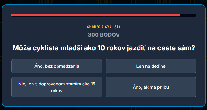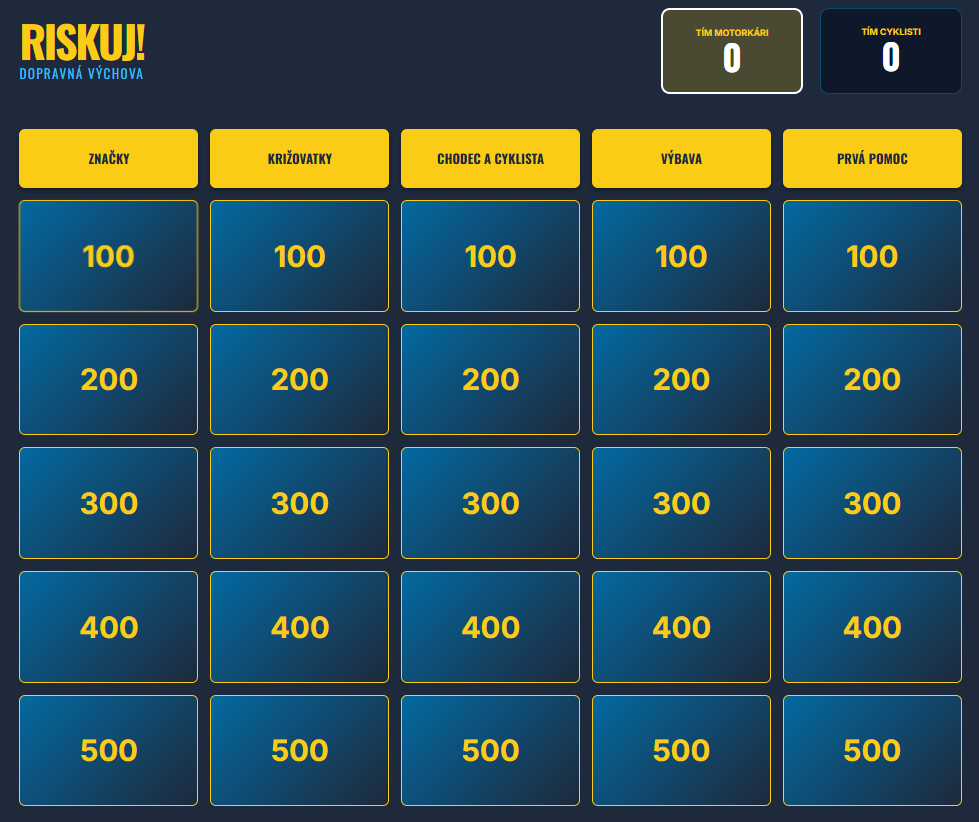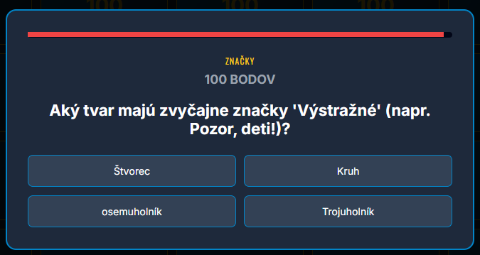 Premeňte hodinu dopravnej výchovy na napínavý súboj vedomostí! Táto digitálna hra prenáša obľúbený formát televíznej súťaže priamo do vašej triedy. Žiaci sa hravou formou ponoria do pravidiel cestnej premávky, od poznávania značiek až po základy prvej pomoci.