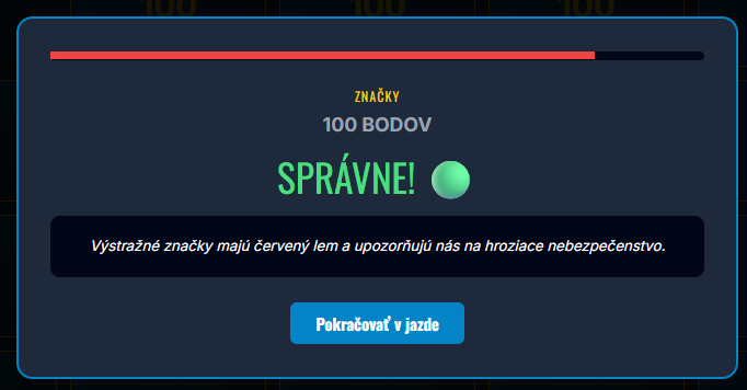 - 25 odborných otázok: Rozdelených do kategórií Značky, Križovatky, Chodec a cyklista, Výbava a Prvá pomoc.