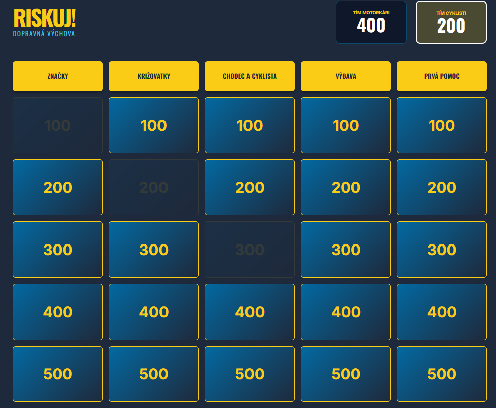 - Kompletná herná logika: Automatické striedanie dvoch tímov (Motorkári a Cyklisti), pripočítavanie i odpočítavanie bodov, časový limit 30 sekúnd na odpoveď a interaktívne zvukové efekty.