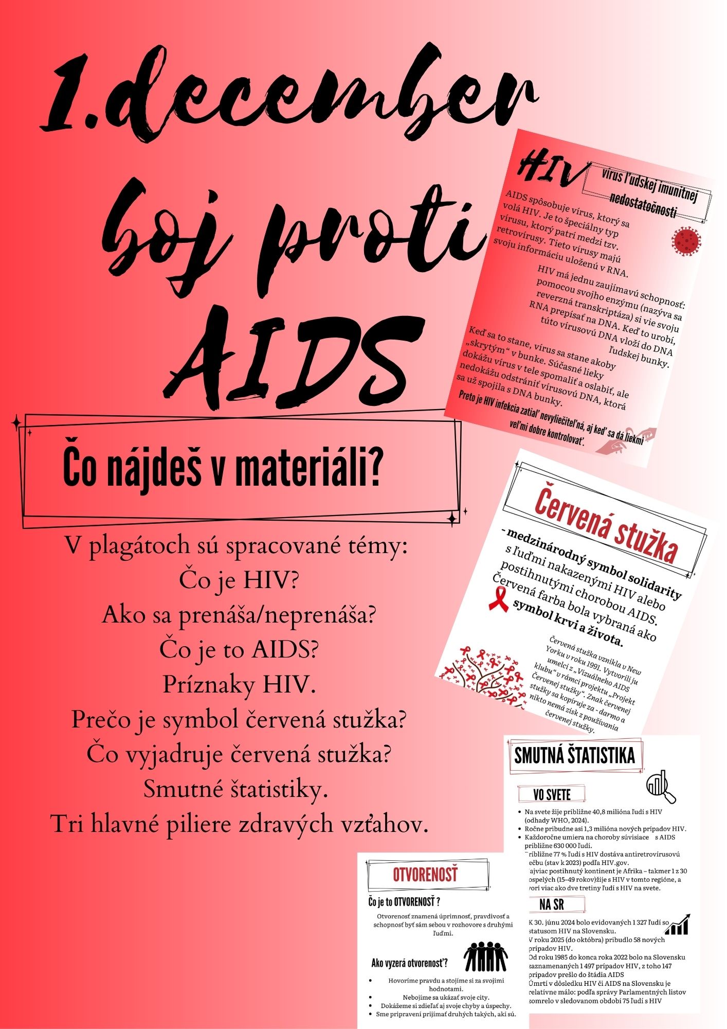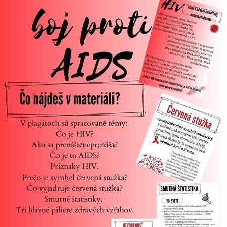 Tieto plagáty na nástenku pomáhajú žiakom pochopiť, čo je HIV a AIDS, ako sa vírus šíri, a prečo je dôležité ukazovať solidaritu a podporu chorým.