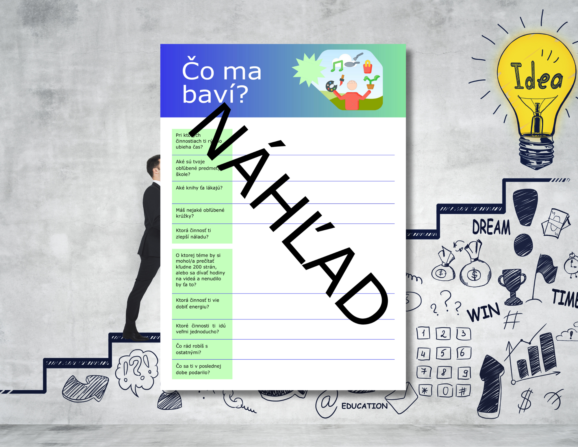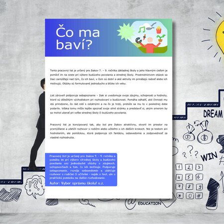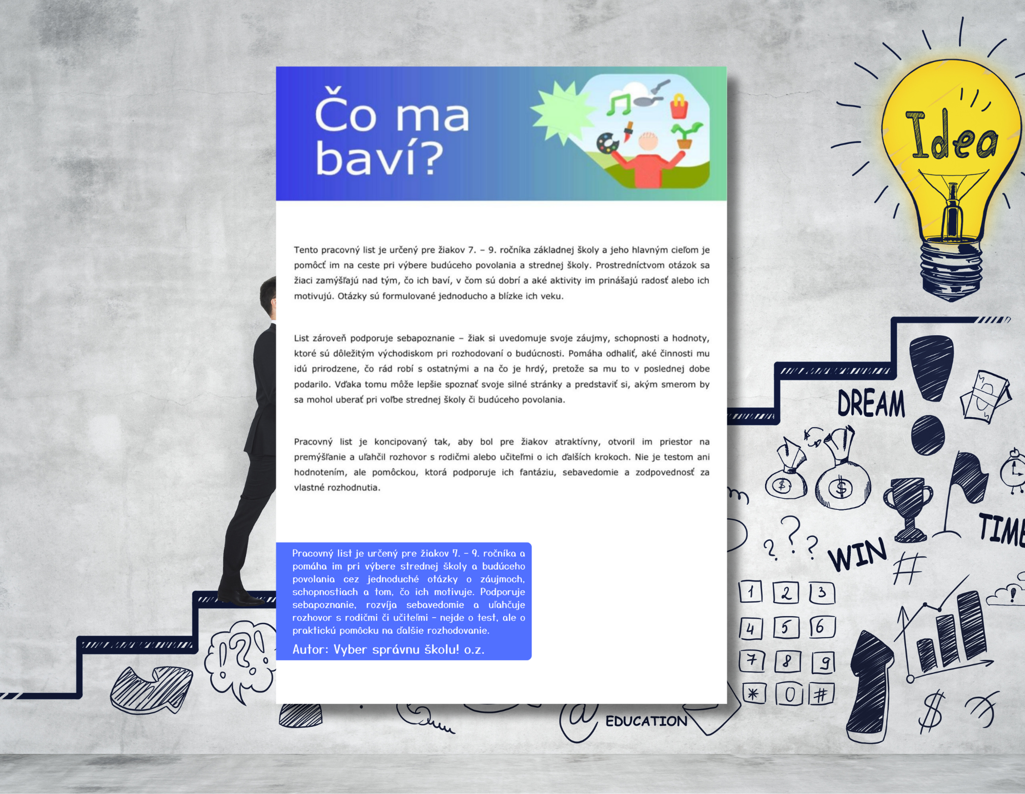 Pracovný list je určený pre žiakov 7. – 9. ročníka a pomáha im pri výbere strednej školy a budúceho povolania cez jednoduché otázky o záujmoch, schopnostiach a tom, čo ich motivuje. Podporuje sebapoznanie, rozvíja sebavedomie a uľahčuje rozhovor s rodičmi či učiteľmi – nejde o test, ale o praktickú pomôcku na ďalšie rozhodovanie.