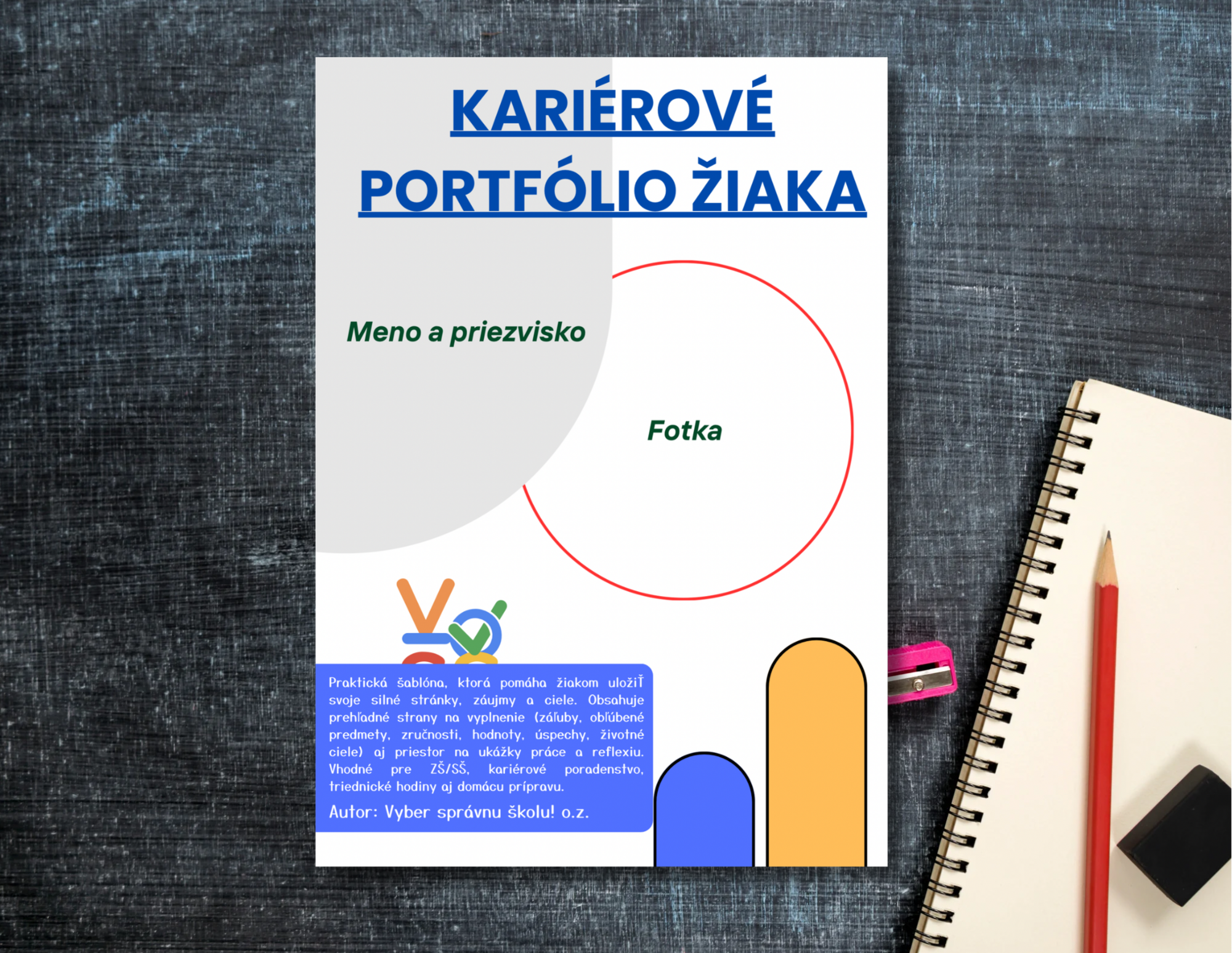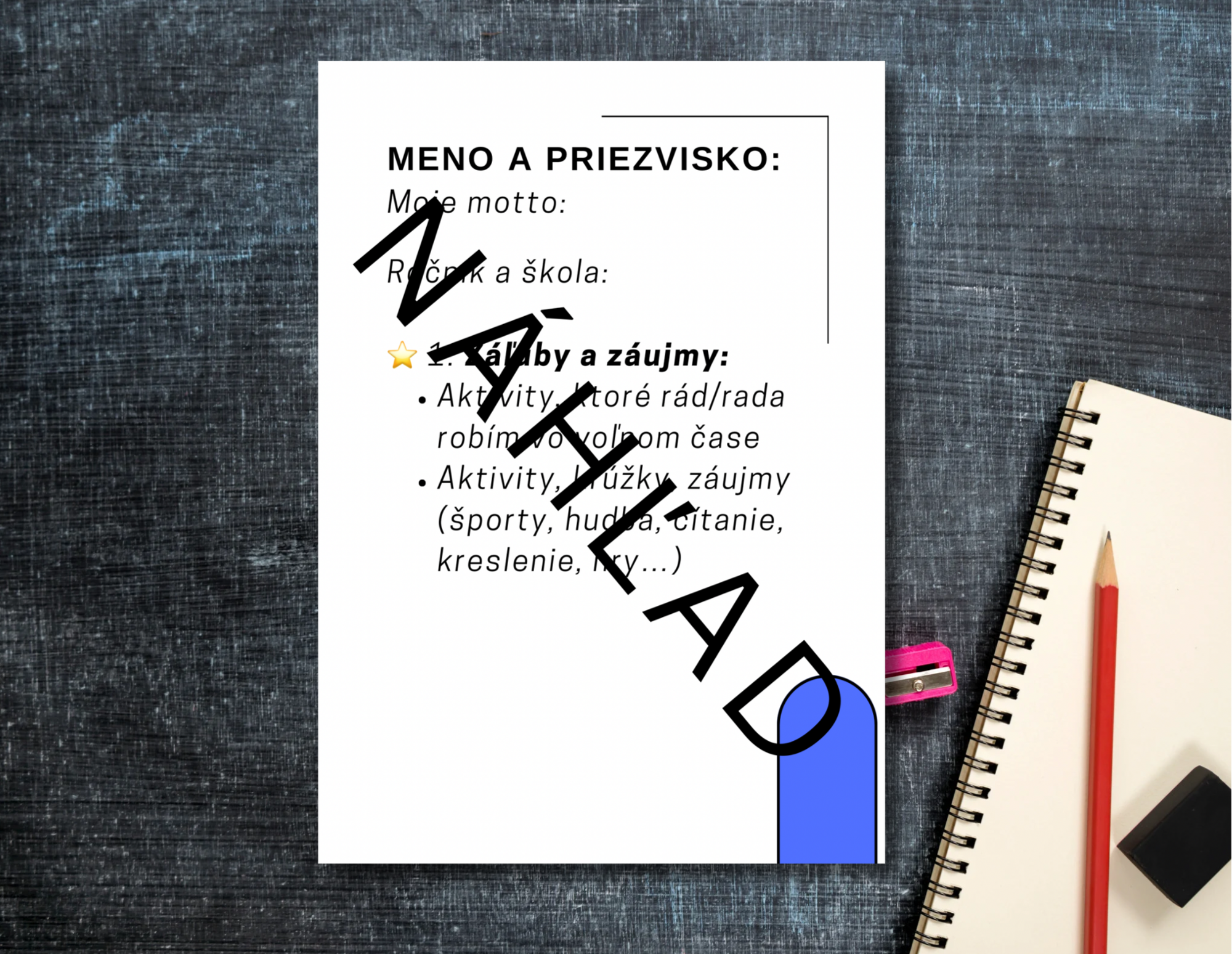 Praktická šablóna, ktorá pomáha žiakom uložiť svoje silné stránky, záujmy a ciele. Obsahuje prehľadné strany na vyplnenie (záľuby, obľúbené predmety, zručnosti, hodnoty, úspechy, životné ciele) aj priestor na ukážky práce a reflexiu. Vhodné pre ZŠ/SŠ, kariérové poradenstvo, triednické hodiny aj domácu prípravu.