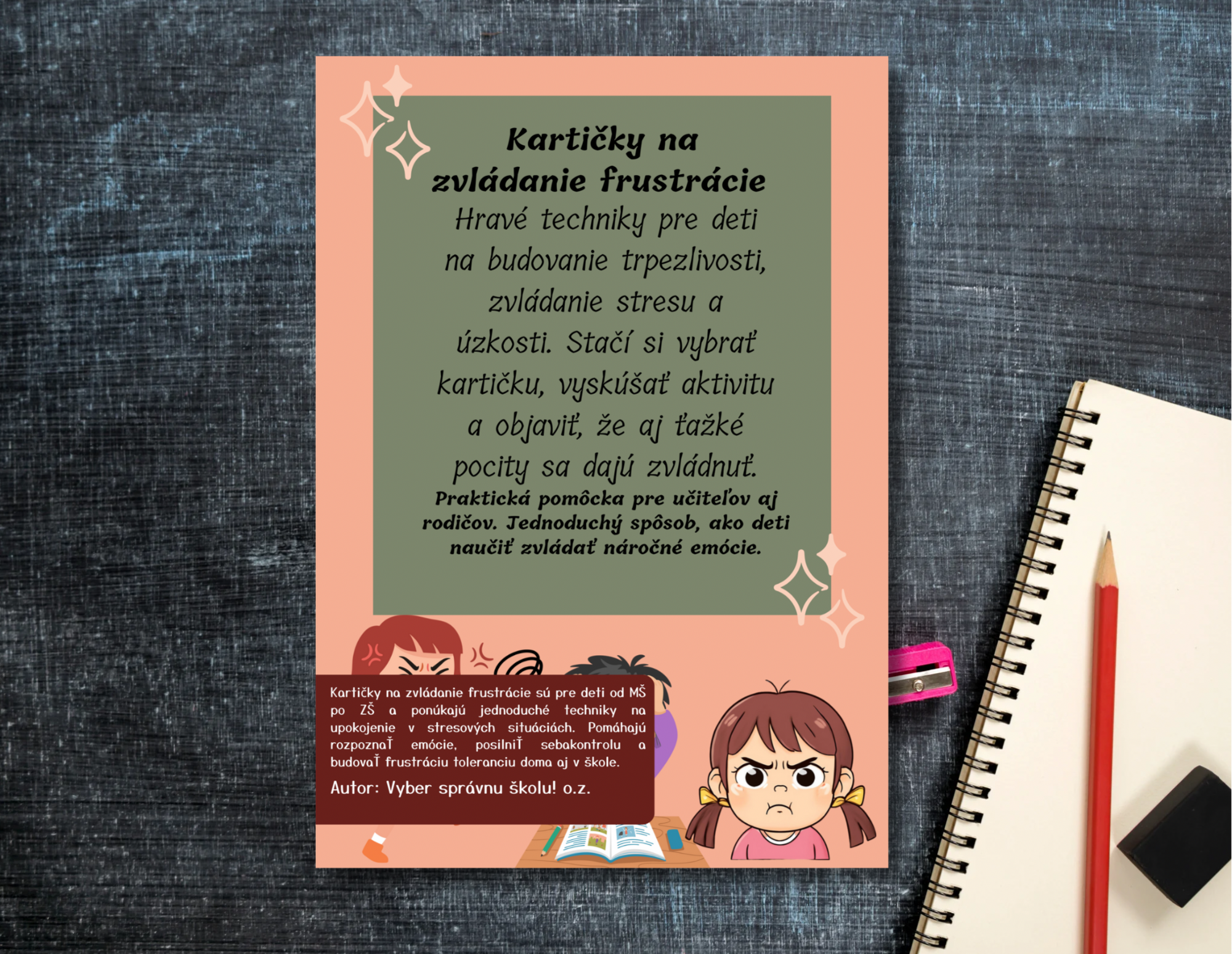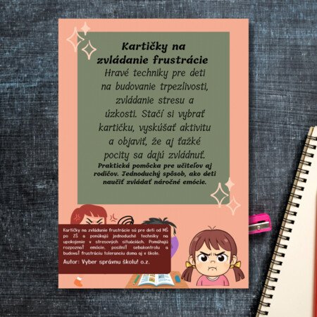 Tieto kartičky sú vytvorené pre rôzne vekové kategórie - od materskej školy až po staršie deti na základnej škole. V materskej škole si ich pani učiteľky môžu vyskúsať s deťmi hravou formou. Na vyšších stupňoch slúžia ako praktická pomôcka pri zvládaní stresu, úzkosti či napätých situácií. Kartičky sú nazvané „na zvládanie frustrácie", pretože deti si tak zároveň budujú frustračnú toleranciu. Rozpoznajú svoje pocity, naučia sa upokojiť a ziskať kontrolu nad situáciou.