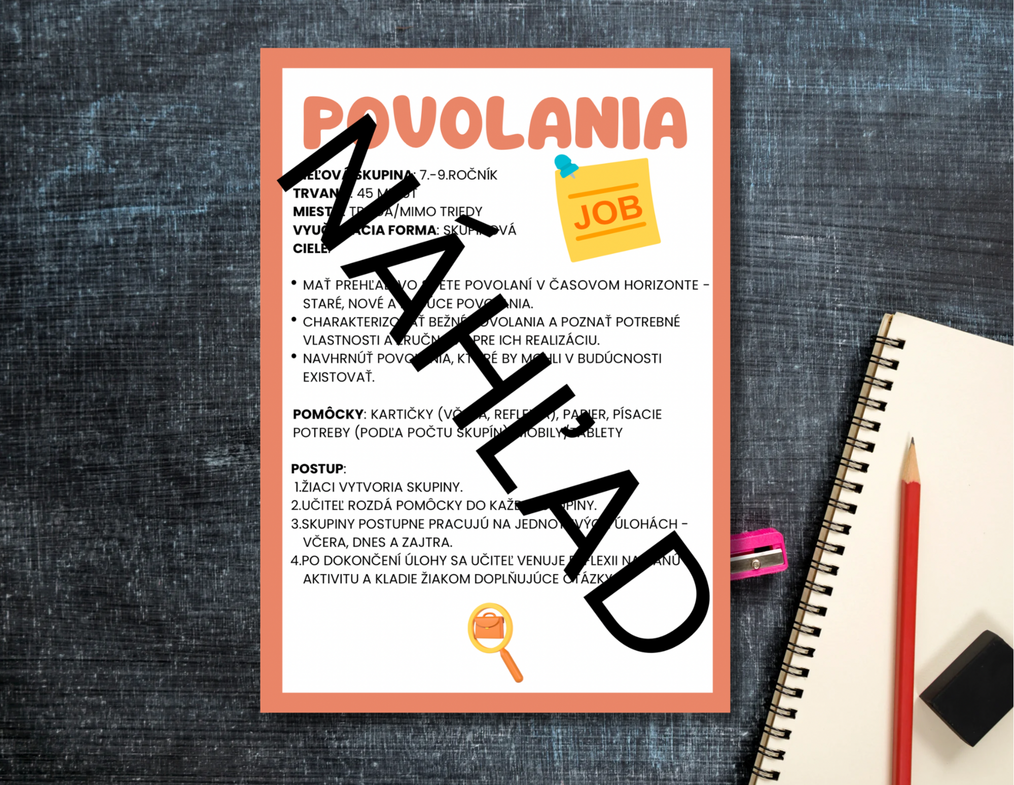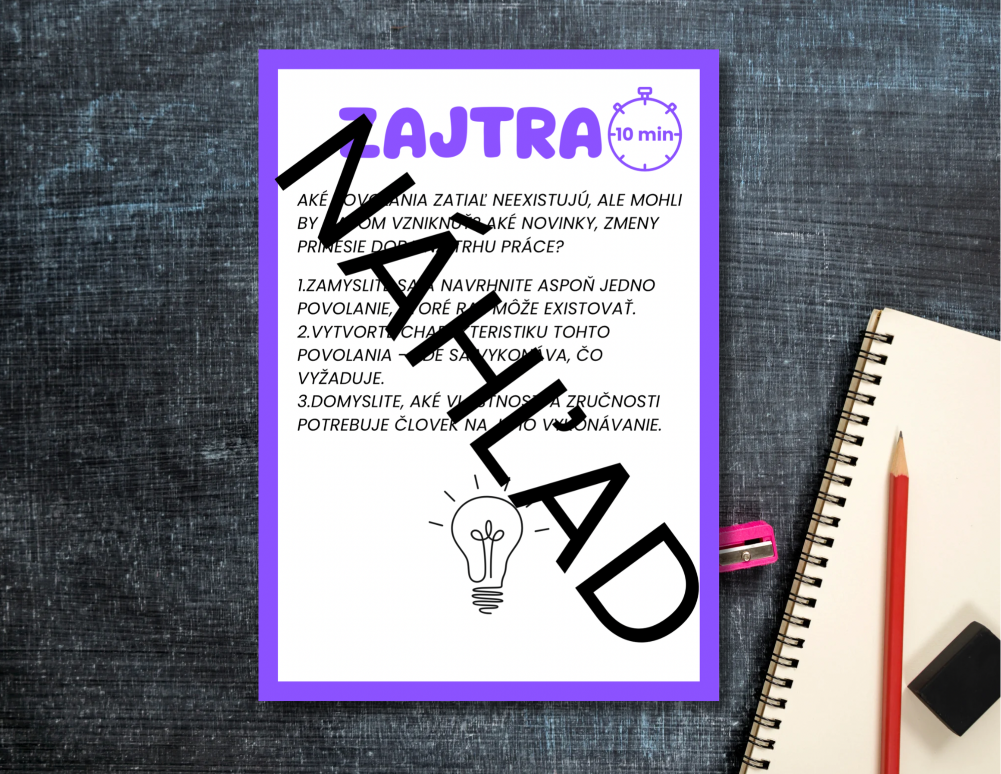 Aktivita prezentuje žiakom povolania v širšom časovom kontexte (minulosť, prítomnosť a budúcnosť). Žiaci získajú základné informácie o vývoji trhu práce a o vybraných profesiách. Spoznajú nové povolania dnešnej doby a budú mať príležitosť navrhnúť povolanie budúcnosti.