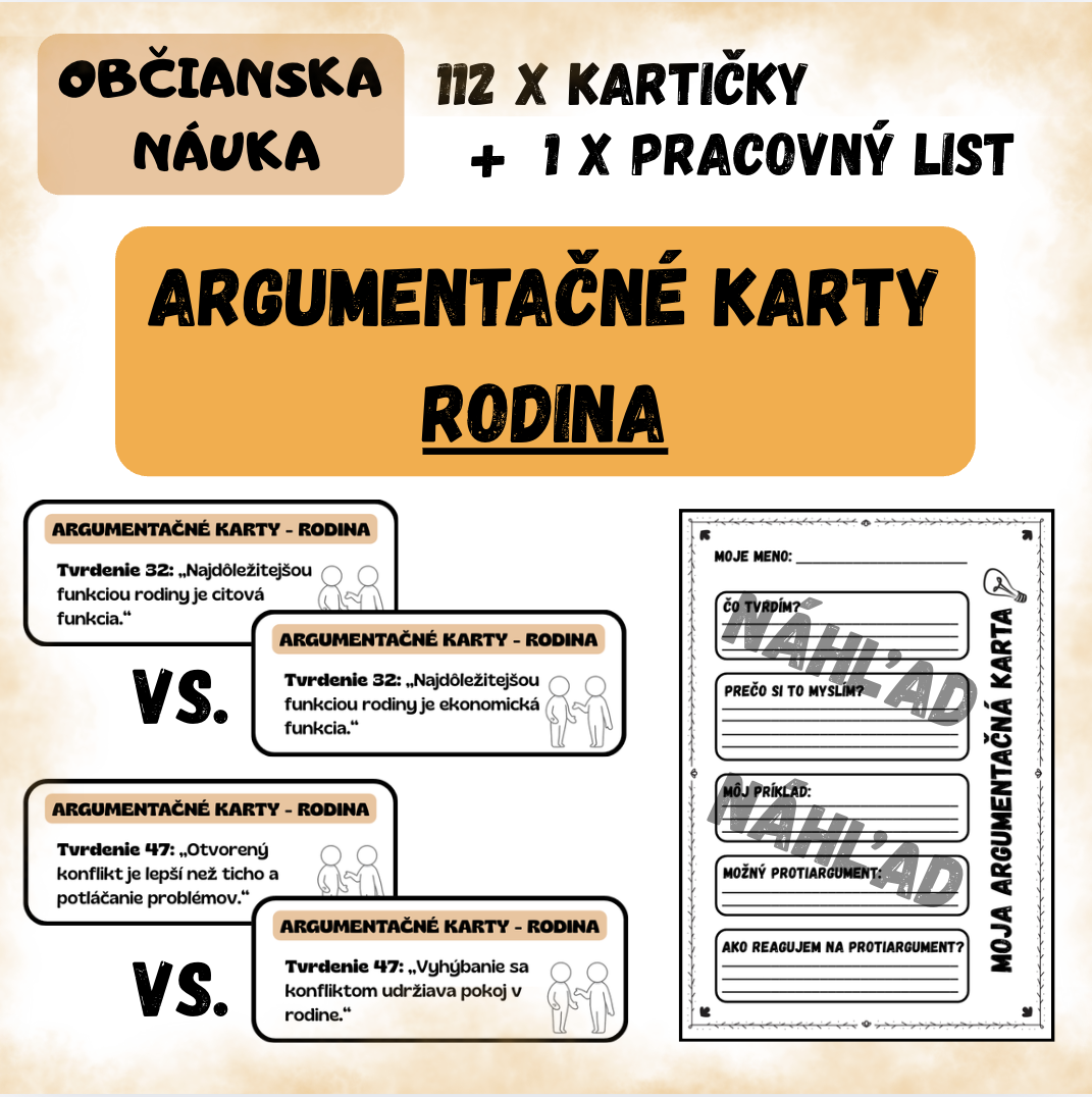 Argumentačné karty na tému Rodina sú interaktívnou aktivitou určenou pre predmet občianska náuka. Žiaci pracujú s protichodnými výrokmi, učia sa formulovať vlastný názor, podkladať ho argumentmi a reagovať na opačné stanovisko. Vysoký počet argumentačných kariet poskytuje učiteľovi široké možnosti výberu a umožňuje flexibilne prispôsobiť aktivitu aktuálne preberanej téme. Aktivita rozvíja kritické myslenie, komunikačné zručnosti a zároveň pomáha žiakom hlbšie porozumieť pojmom ako funkcie rodiny, typy výchovy, práva a povinnosti či rodinné krízy.