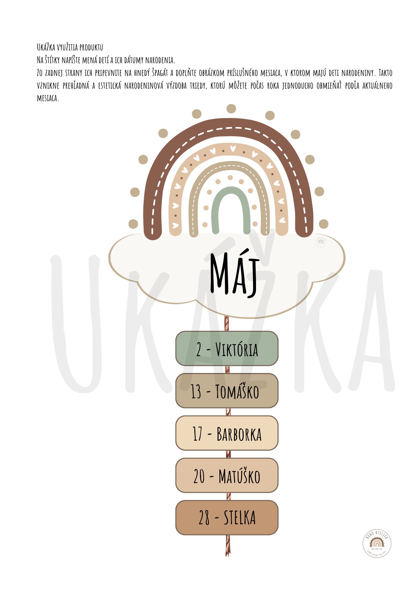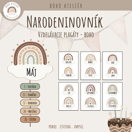 Narodeninovník v boho štýle je estetická a funkčná pomôcka určená pre materské aj základné školy. Slúži na prehľadné zaznamenanie narodenín detí počas celého roka a zároveň vytvára pokojnú a harmonickú výzdobu triedy.