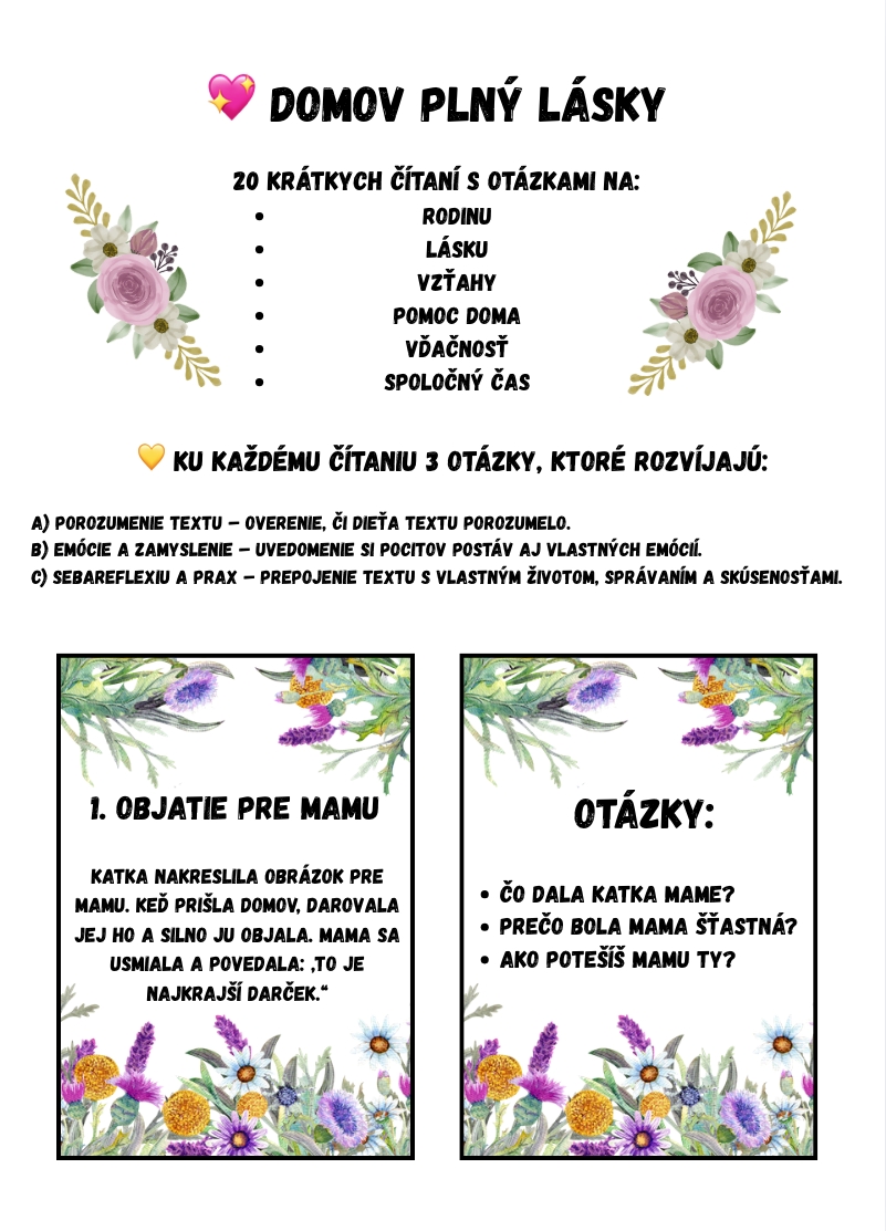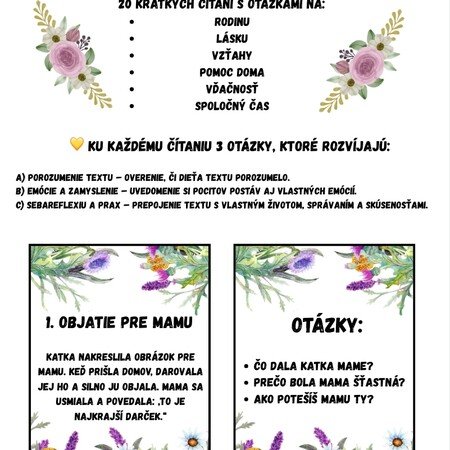 Ku každému čítaniu sú pripravené 3 otázky, ktoré podporujú porozumenie textu, rozvoj emócií, zamyslenie a sebareflexiu dieťaťa. Deti sa učia rozprávať o svojich pocitoch, vnímať rodinné vzťahy, prejavovať láskavosť a spájať prečítané situácie s vlastnými skúsenosťami.