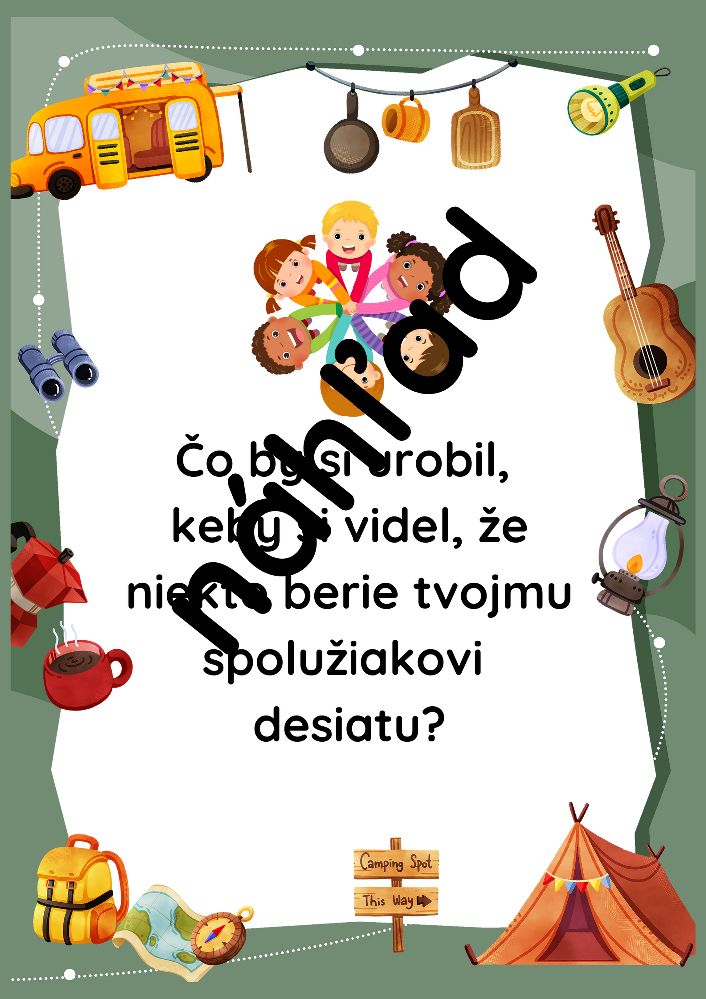 Kartičky s otázkami sú vhodné ako aktivita v rannom kruhu, alebo aj na etickej výchove. Sú zamerané na tému šikanovania. Povzbudzujú deti k tomu, aby sa učili vyjadrovať svoj názor, komunikovať. Kartičky je potrebné vytlačiť 4 na stranu A4 a zalaminovať. Môžu sa používať v každom ročníku na prvom stupni. Každé dieťa si vytiahne jednu kartičku, odpovie, prípadne sa zapoja aj ostatné deti. V súbore je 16 kartičiek s otázkami.