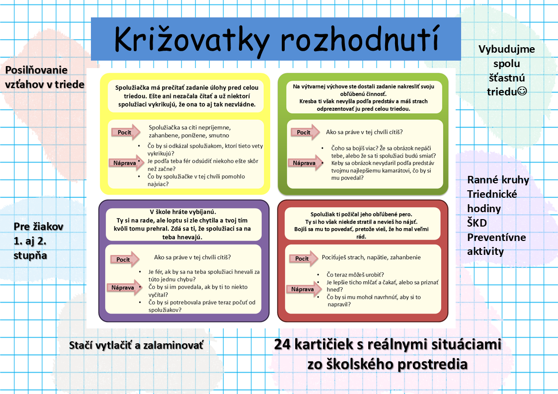 Kartičky Križovatky rozhodnutí je praktická pomôcka, ktorá obsahuje 24 autentických situácií zo života žiakov v škole. Každá karta stavia dieťa pred voľbu: Ako sa zachovám? Čo cítim? Ako môžem pomôcť?
