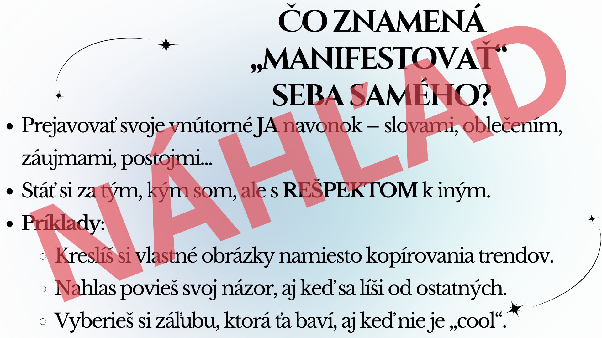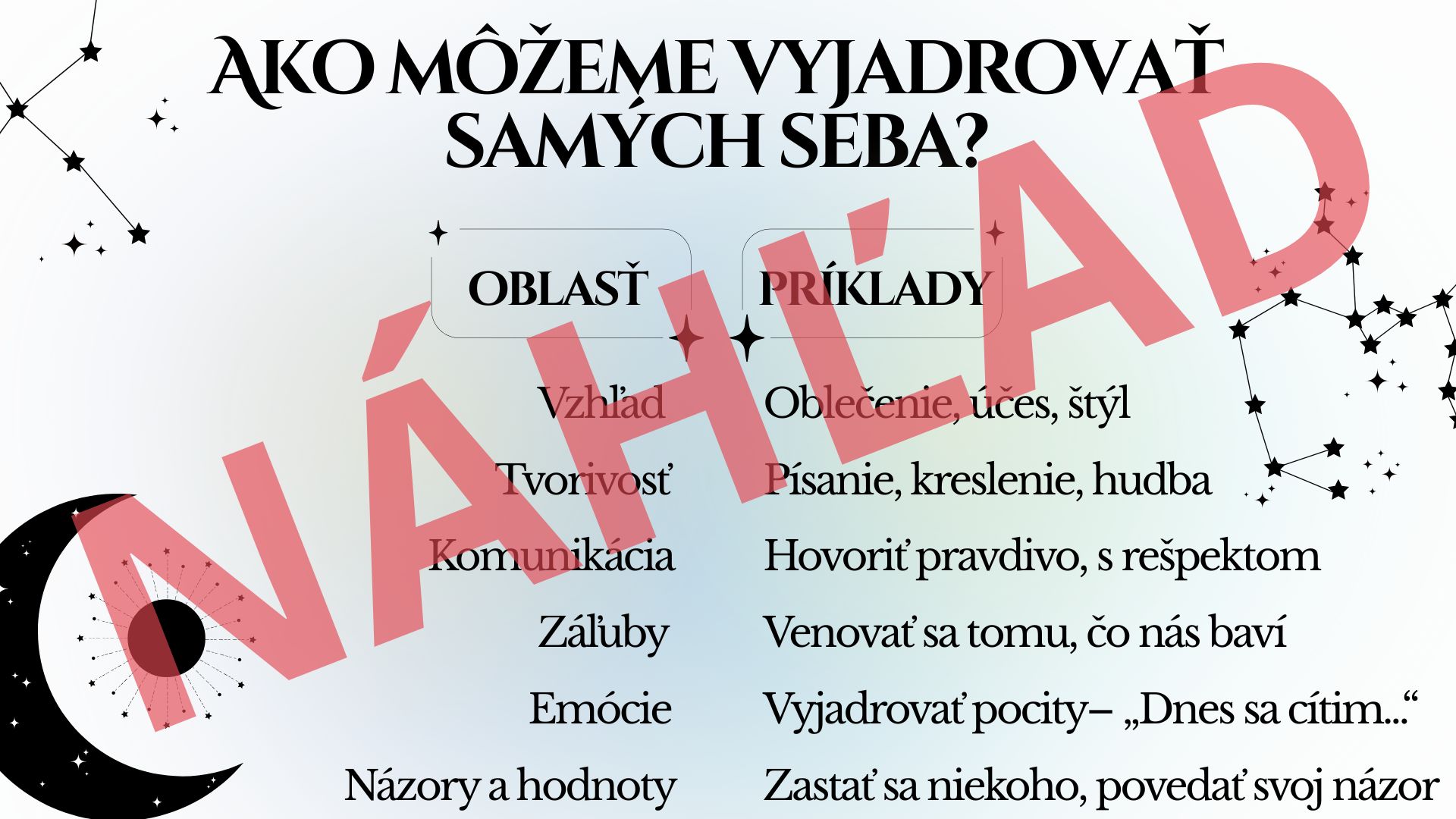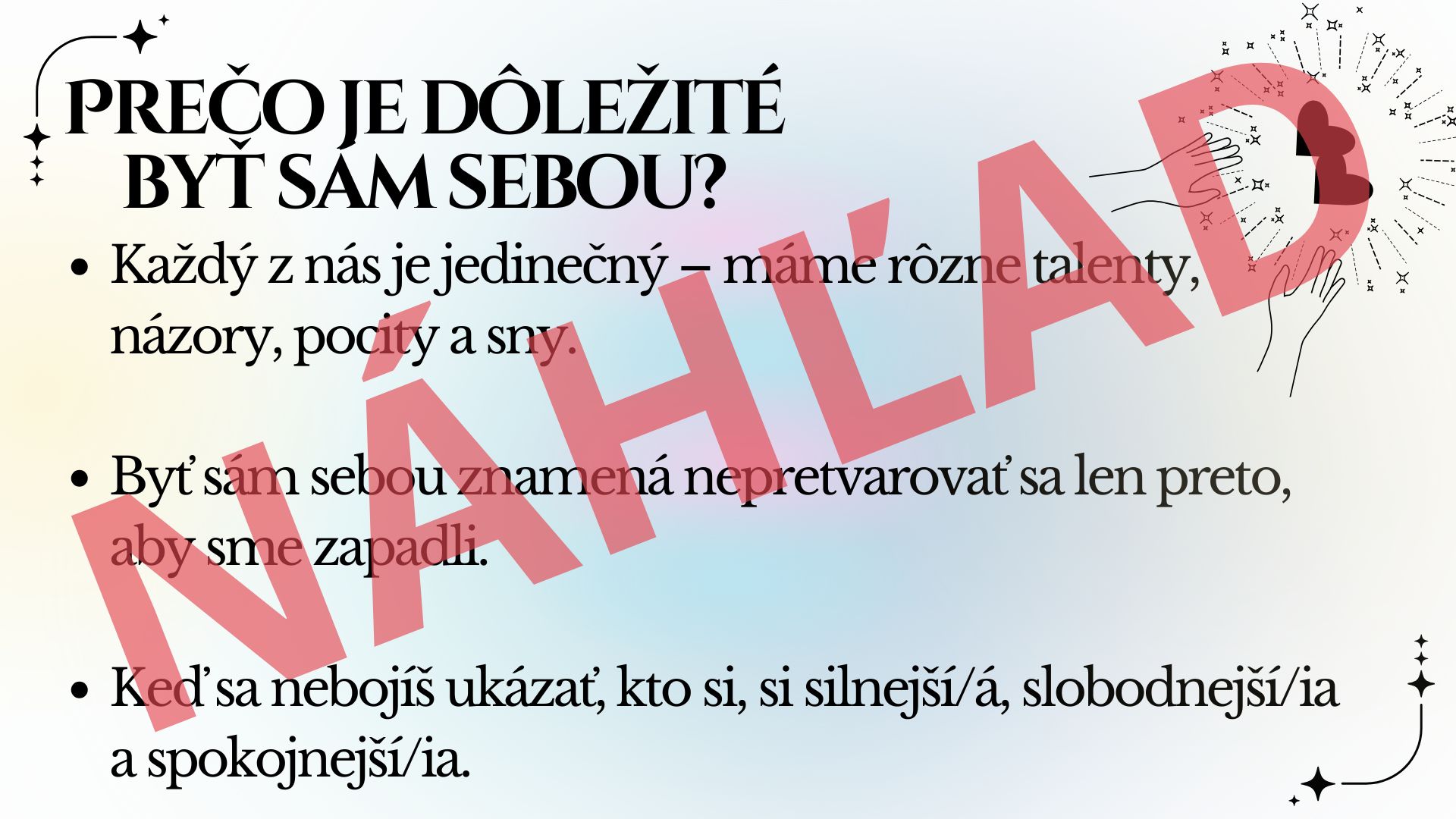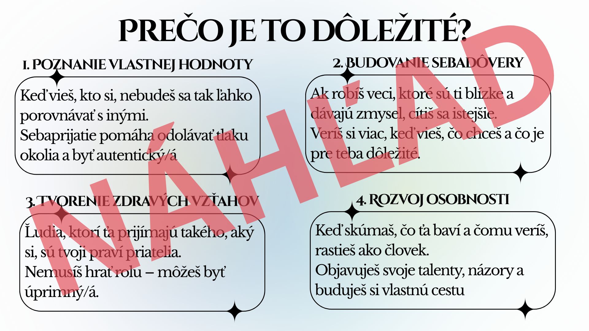 Je vytvorený tak, aby zaujal deti všetkých vekových kategórií – prehľadný dizajn, jasné otázky a podnetné texty vedú žiakov k premýšľaniu o sebe, rozvoju sebavedomia a budovaniu vzťahov v kolektíve. Je ideálny pre triednické hodiny, etickú výchovu, sociálno-emocionálne učenie aj skupinové aktivity, alebo na premietanie počas veľkej a obedovej prestávke na chodbe (ak je to možné).