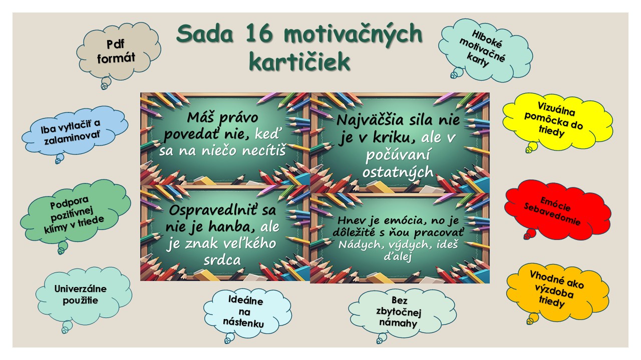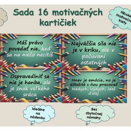 Sada týchto 16 motivačných kartičiek vo veľkosti A4 bola vytvorená tak, aby neslúžila len ako vizuálna ozdoba vo vašej triede, ale bola najmä každodennou psychologickou podporou pre žiakov.